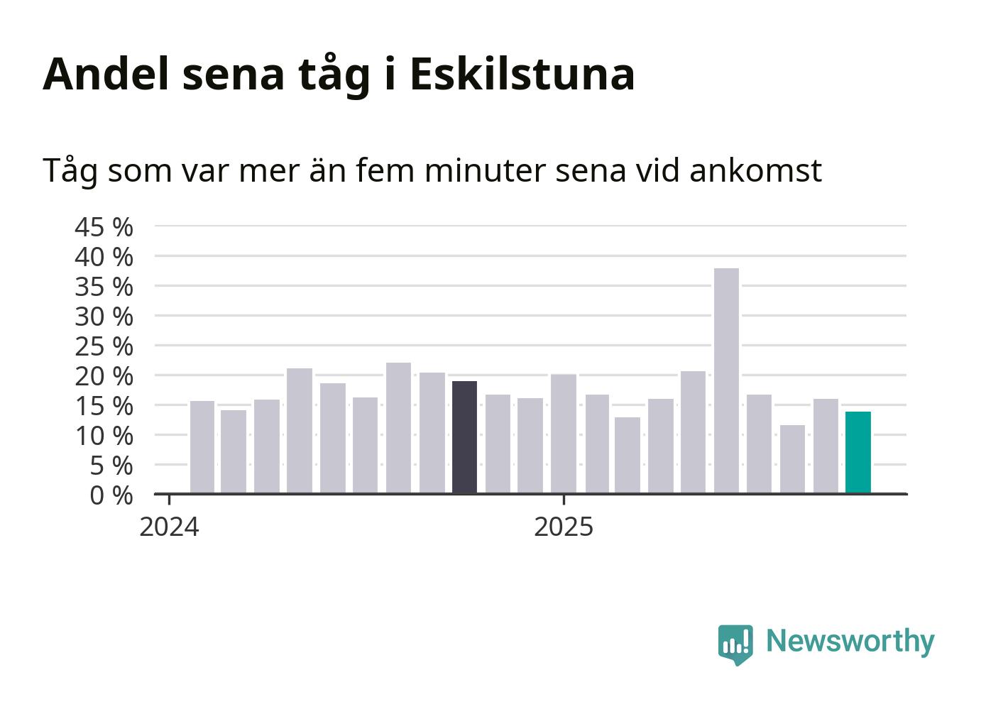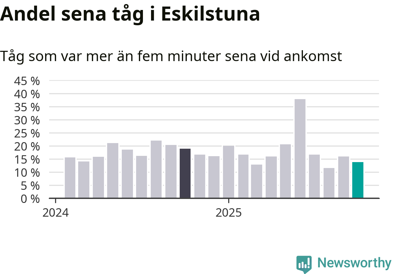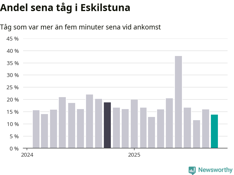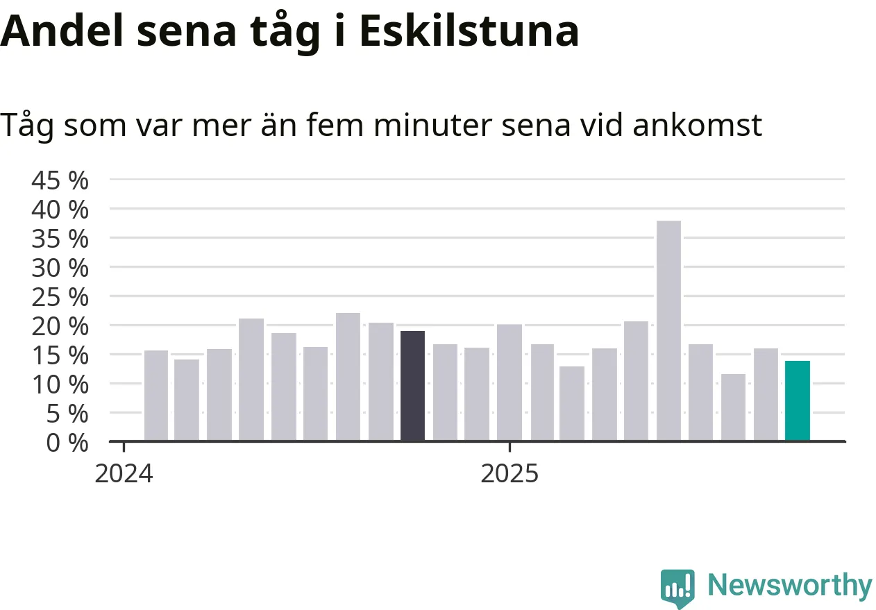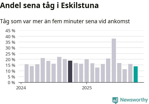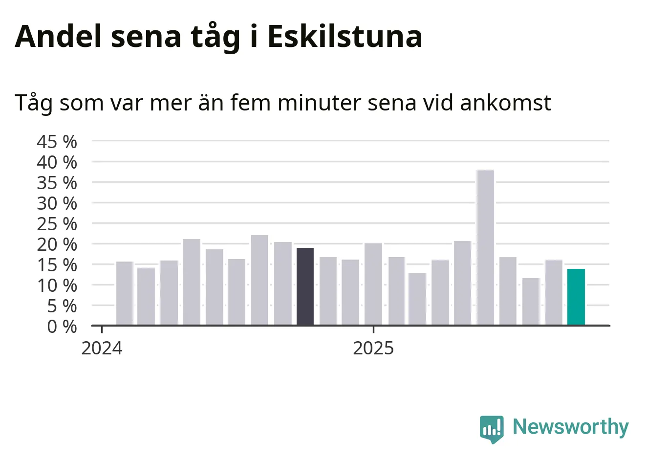 14 procent kan jämföras med 16 procent månaden innan, och 19 procent i oktober 2024. Siffrorna bygger på realtidsinformation om tågavgångar och ankomster från Trafikverket, som Newsworthy löpande samlar in.