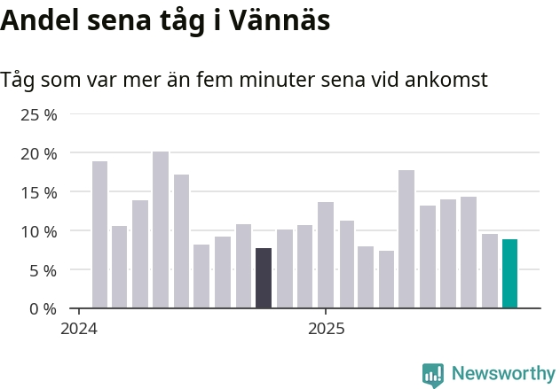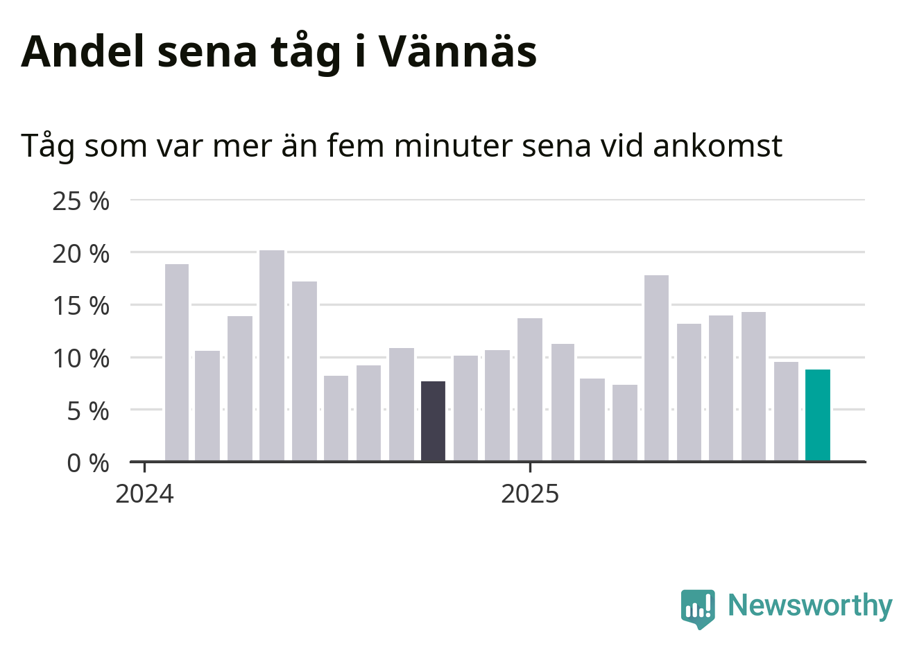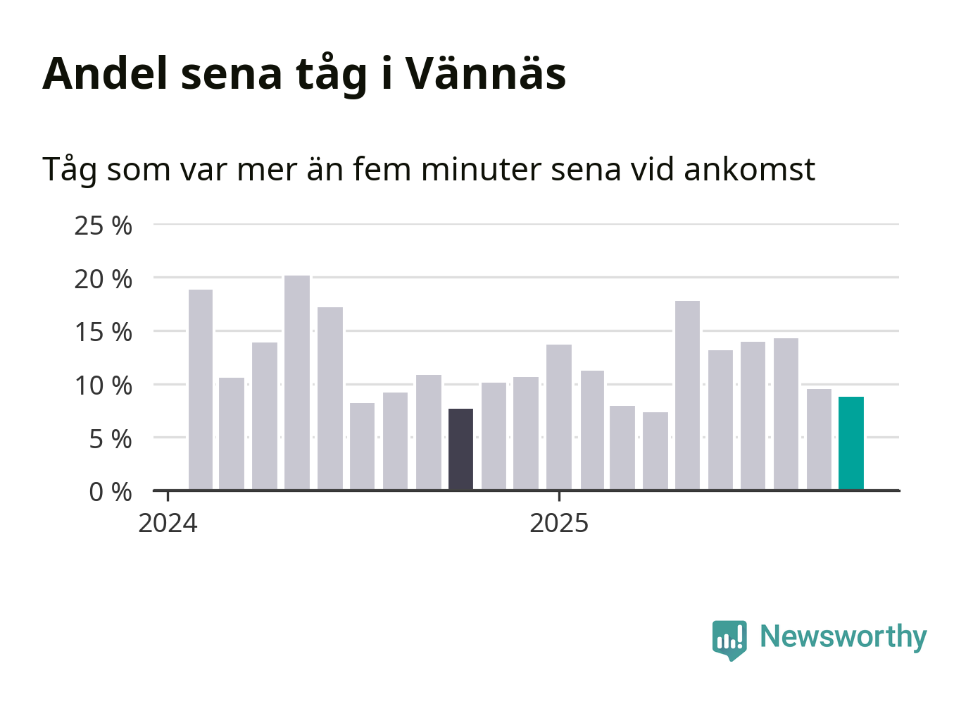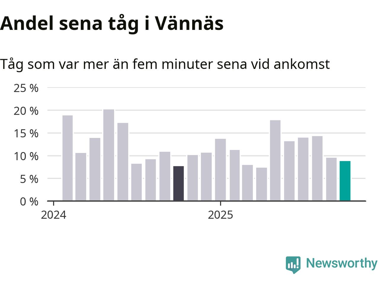 Nio procent är marginellt mindre än månaden innan, och kan jämföras med åtta procent i oktober 2024. Siffrorna bygger på realtidsinformation om tågavgångar och ankomster från Trafikverket, som Newsworthy löpande samlar in.