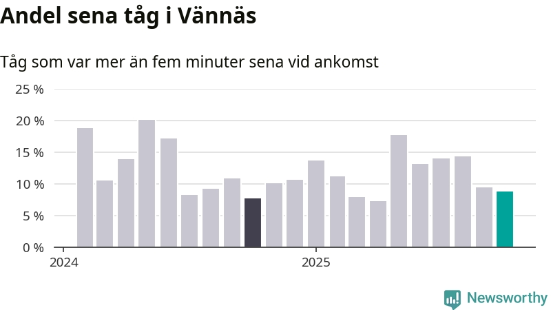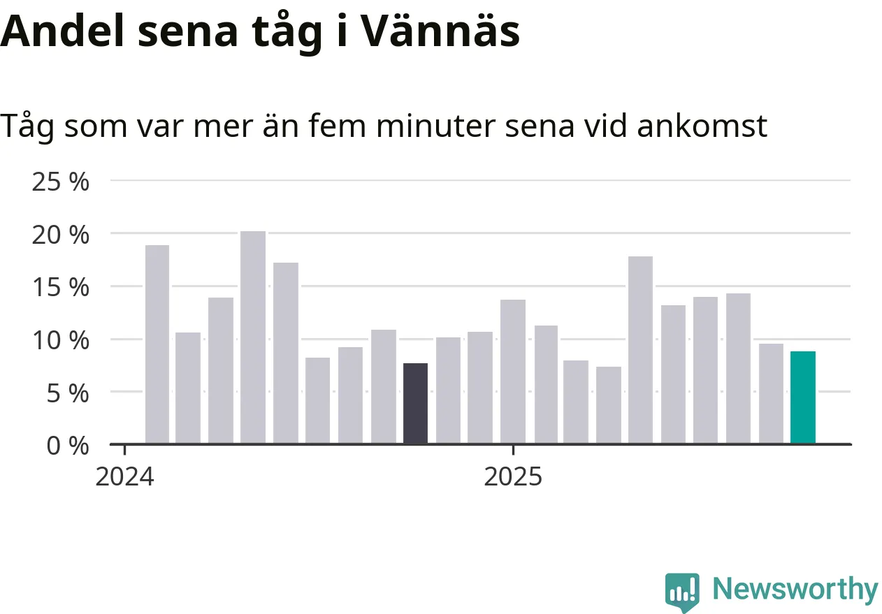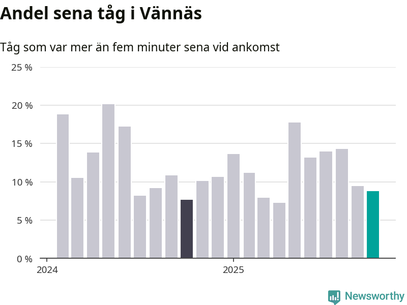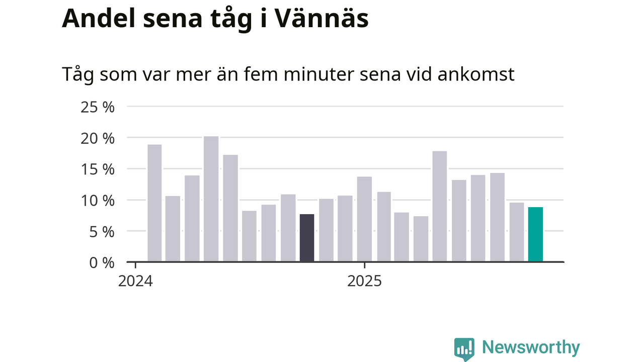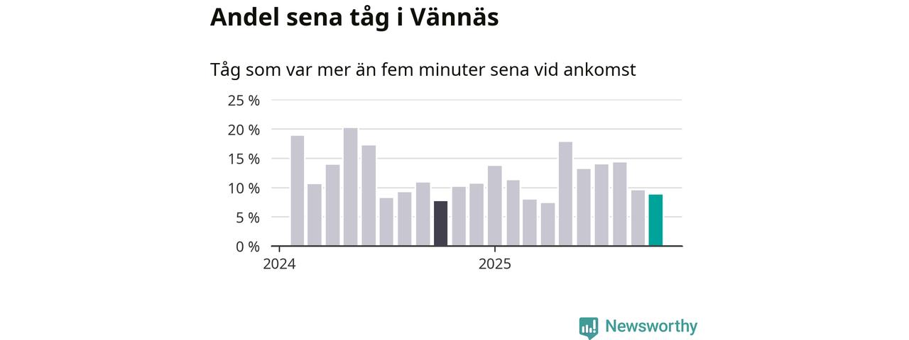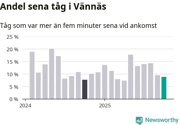 Nio procent är marginellt mindre än månaden innan, och kan jämföras med åtta procent i oktober 2024. Siffrorna bygger på realtidsinformation om tågavgångar och ankomster från Trafikverket, som Newsworthy löpande samlar in.