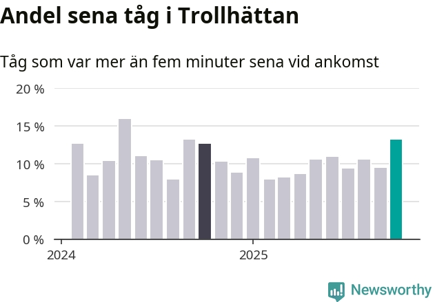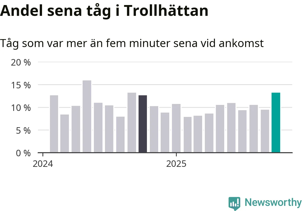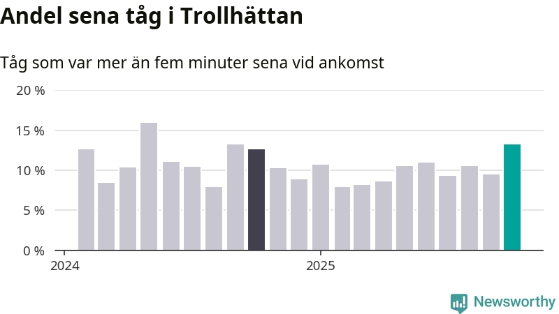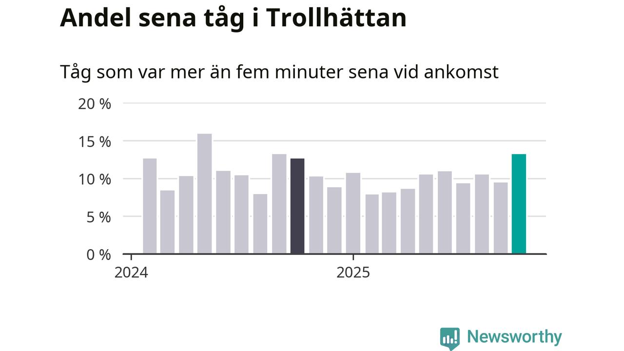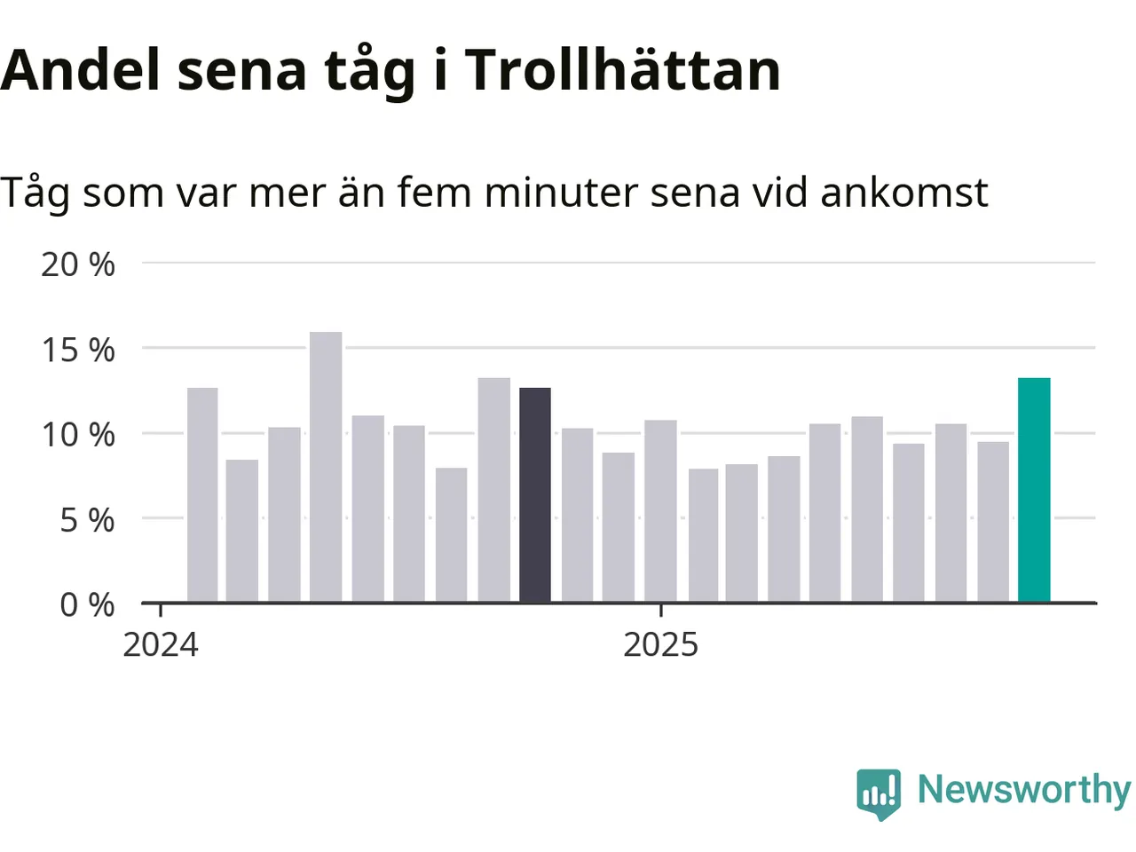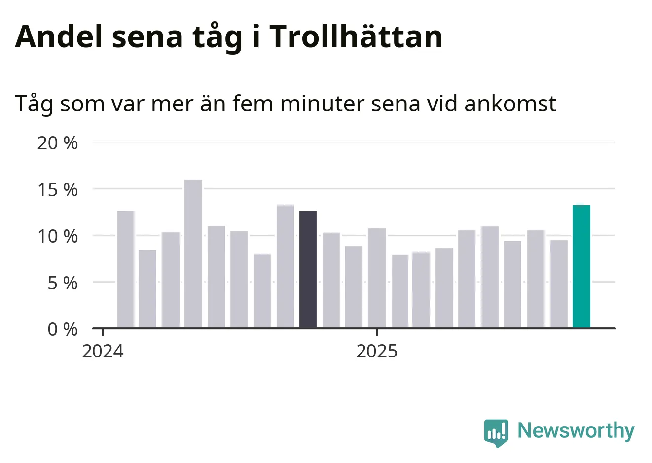 Av knappt 2 700 tåg som passerade Trollhättans station i oktober var 350 mer än fem minuter sena. Det motsvarar 13 procent, en bit över den nationella målsättningen som säger att inte mer än fem procent av tågen ska vara sena.