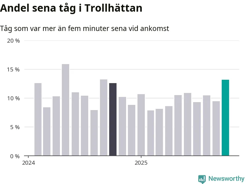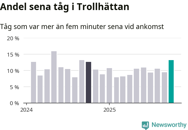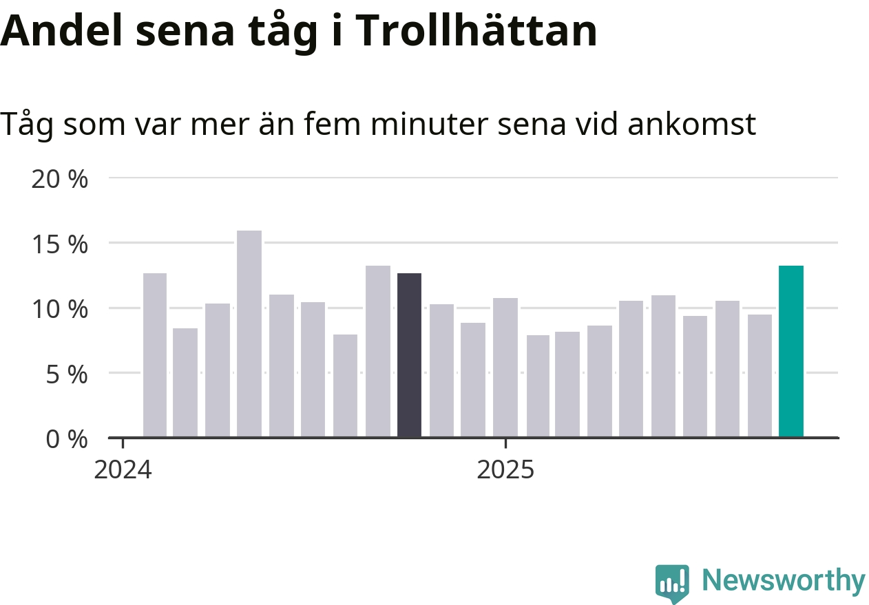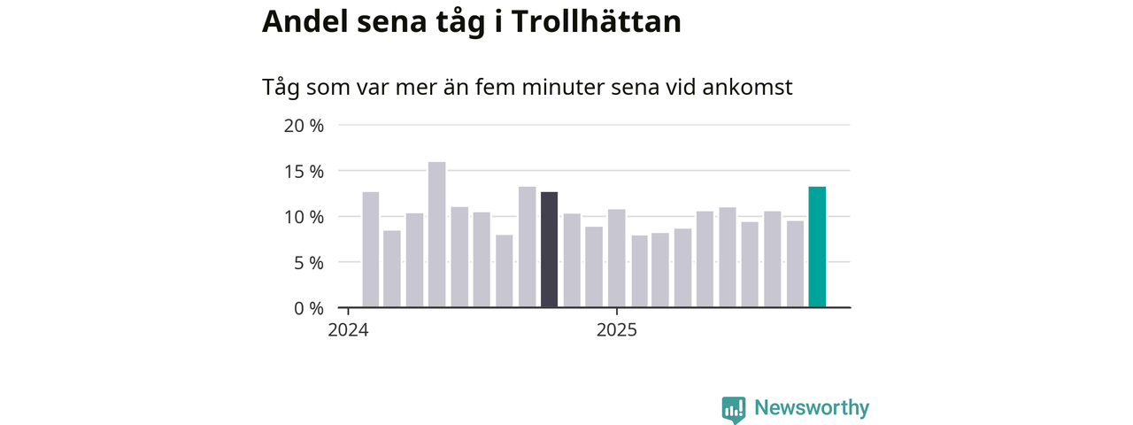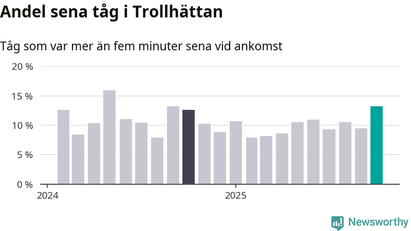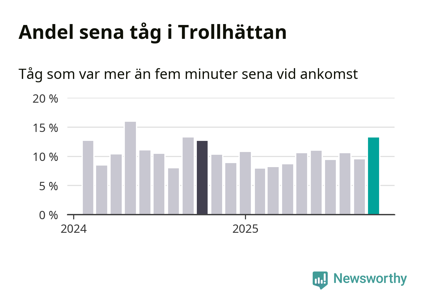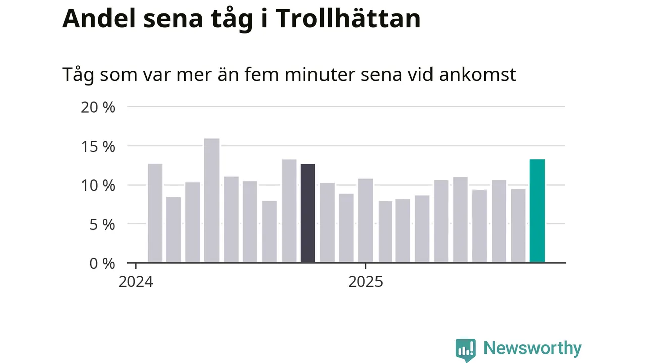 Så hög har andelen förseningar inte varit sedan september 2024. Siffrorna bygger på realtidsinformation om tågavgångar och ankomster från Trafikverket, som Newsworthy löpande samlar in.