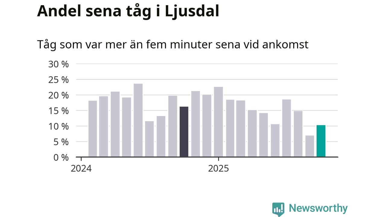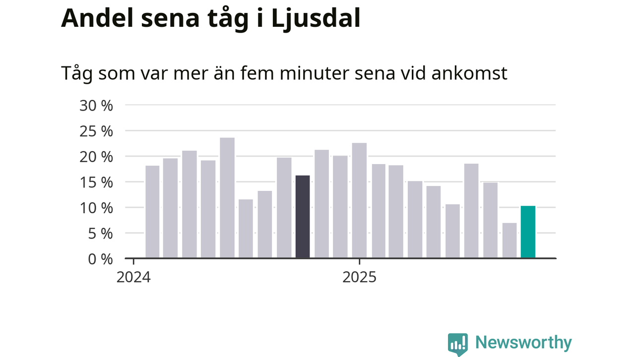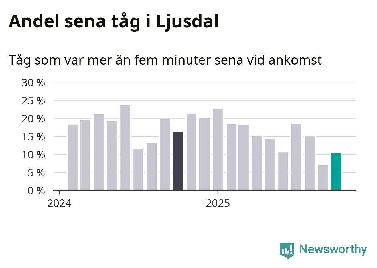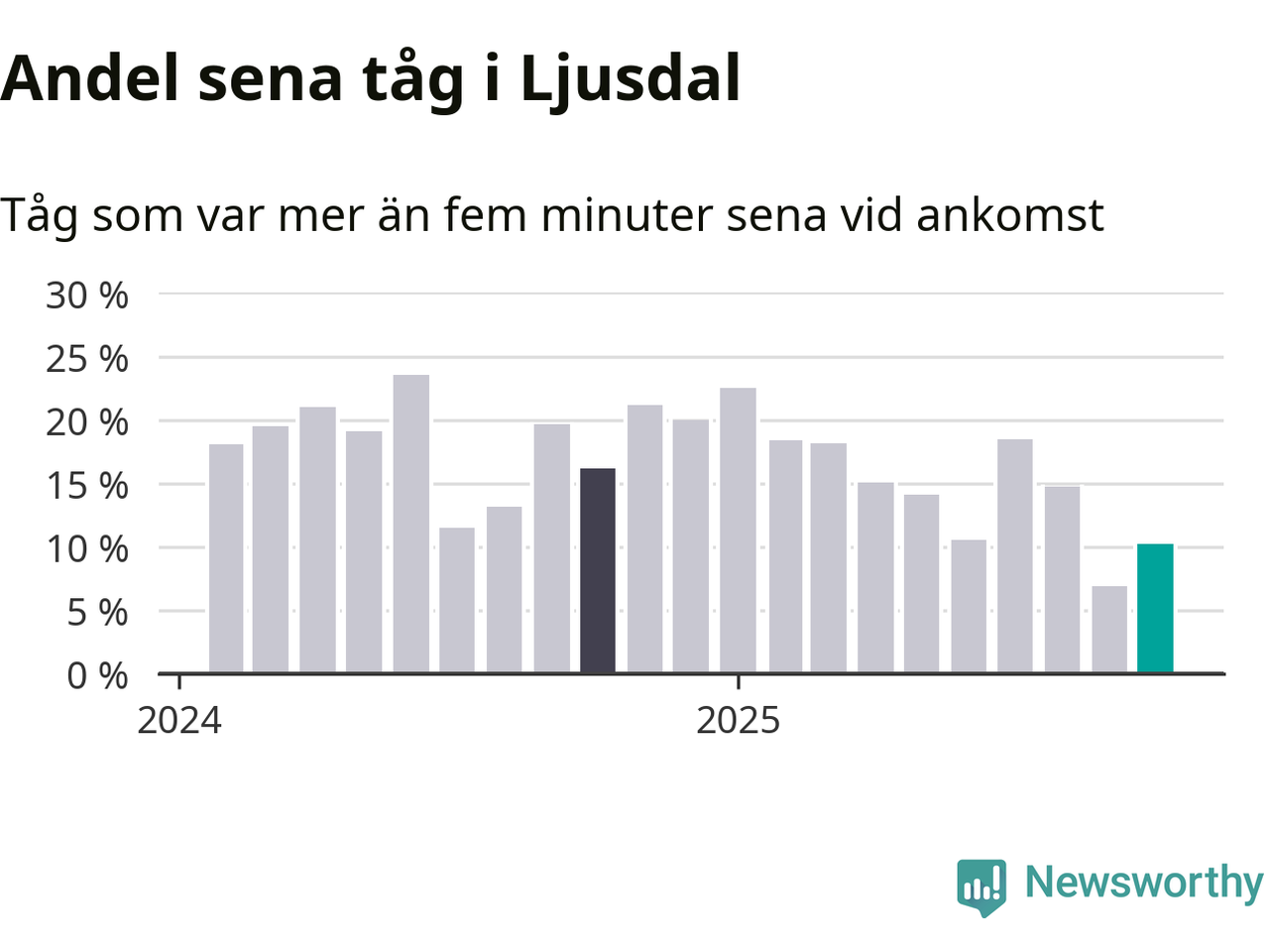 Tio procent kan jämföras med sju procent månaden innan, och 16 procent i oktober 2024. Siffrorna bygger på realtidsinformation om tågavgångar och ankomster från Trafikverket, som Newsworthy löpande samlar in.