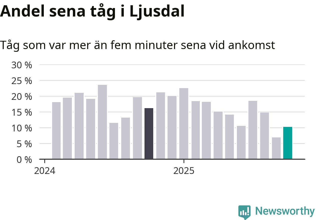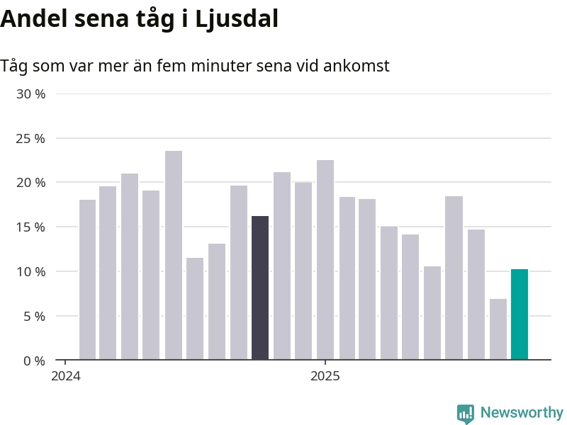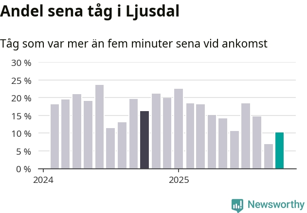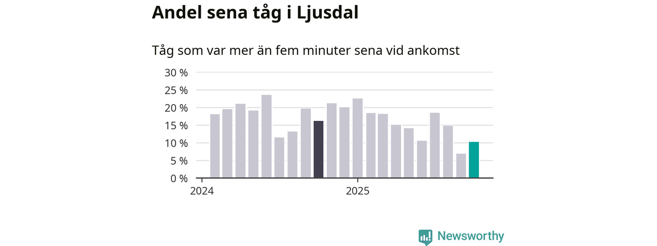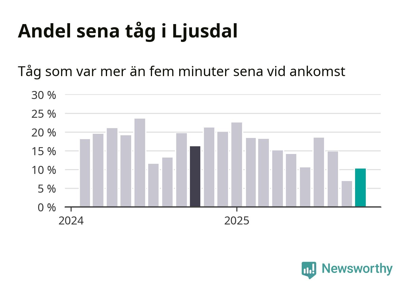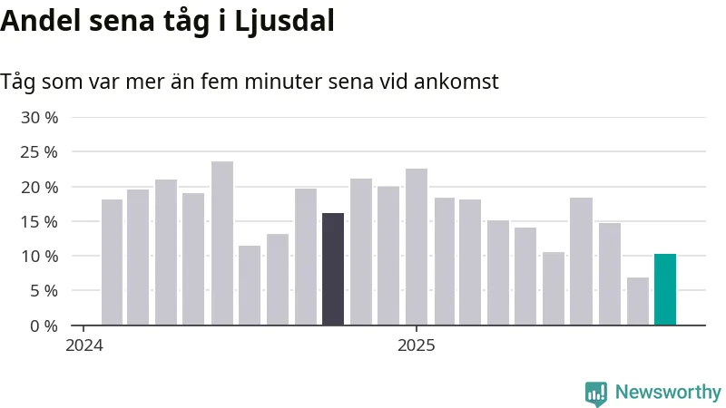 Tio procent kan jämföras med sju procent månaden innan, och 16 procent i oktober 2024. Siffrorna bygger på realtidsinformation om tågavgångar och ankomster från Trafikverket, som Newsworthy löpande samlar in.