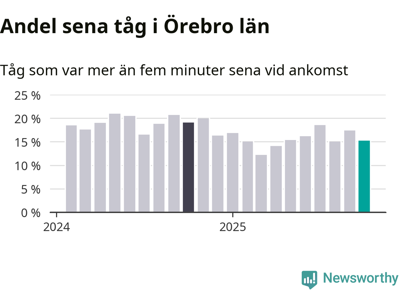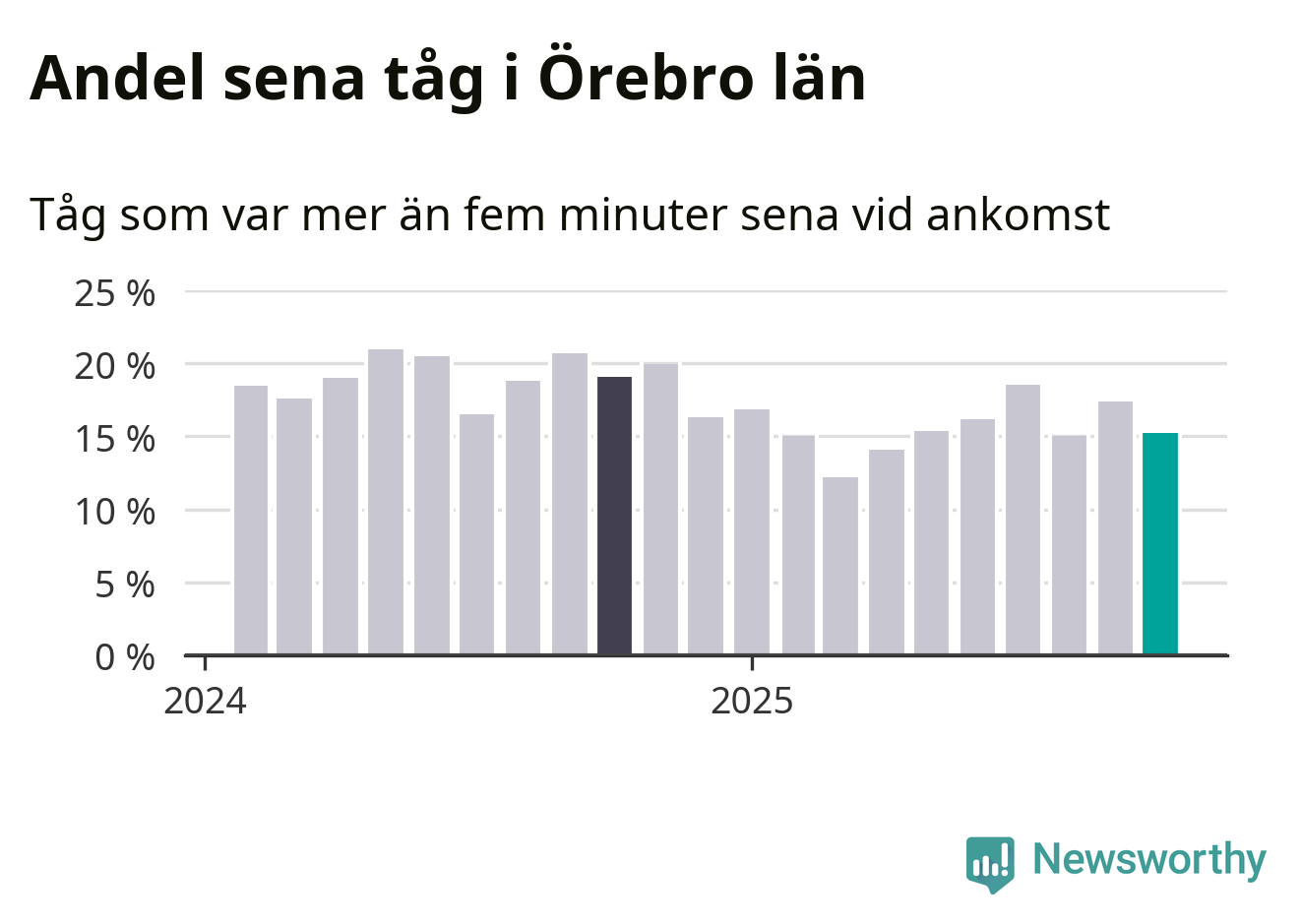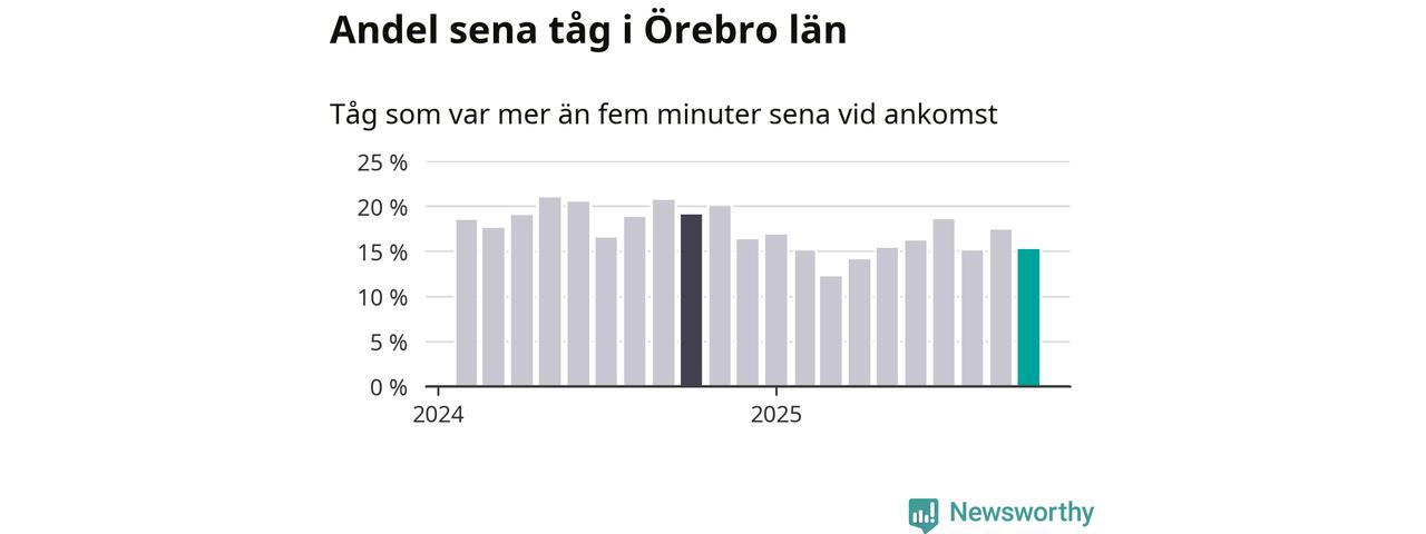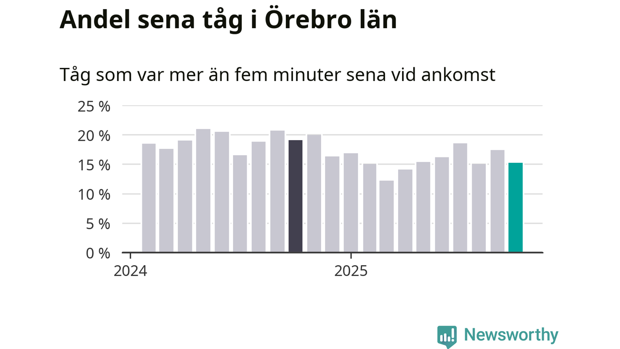 15 procent kan jämföras med 17 procent månaden innan, och 19 procent i oktober 2024. Siffrorna bygger på realtidsinformation om tågavgångar och ankomster från Trafikverket, som Newsworthy löpande samlar in.