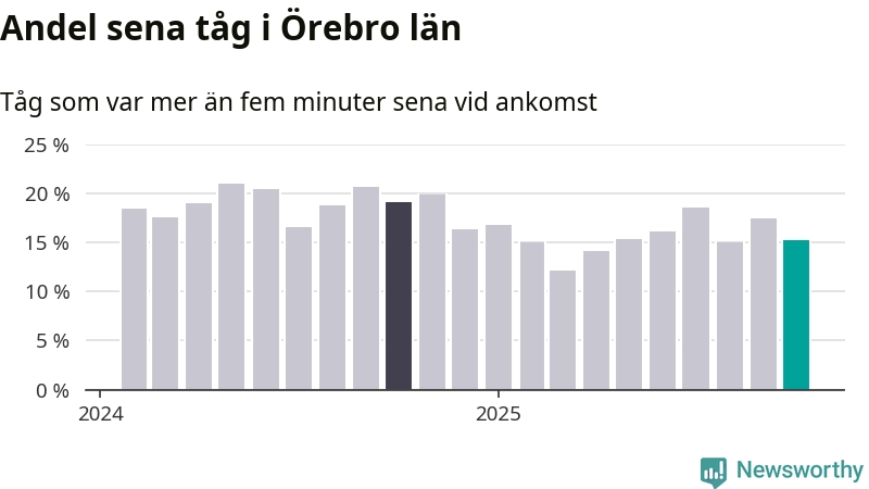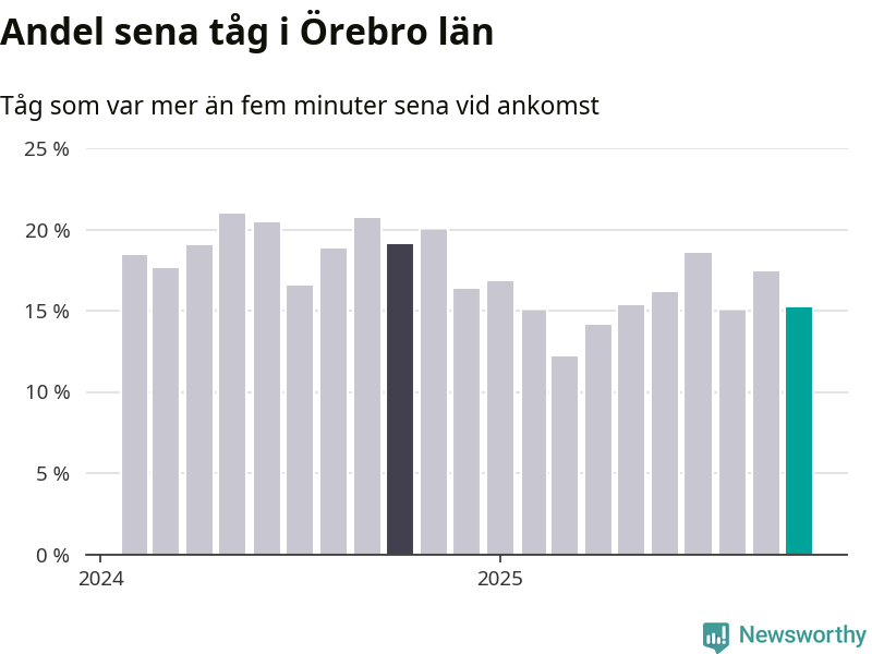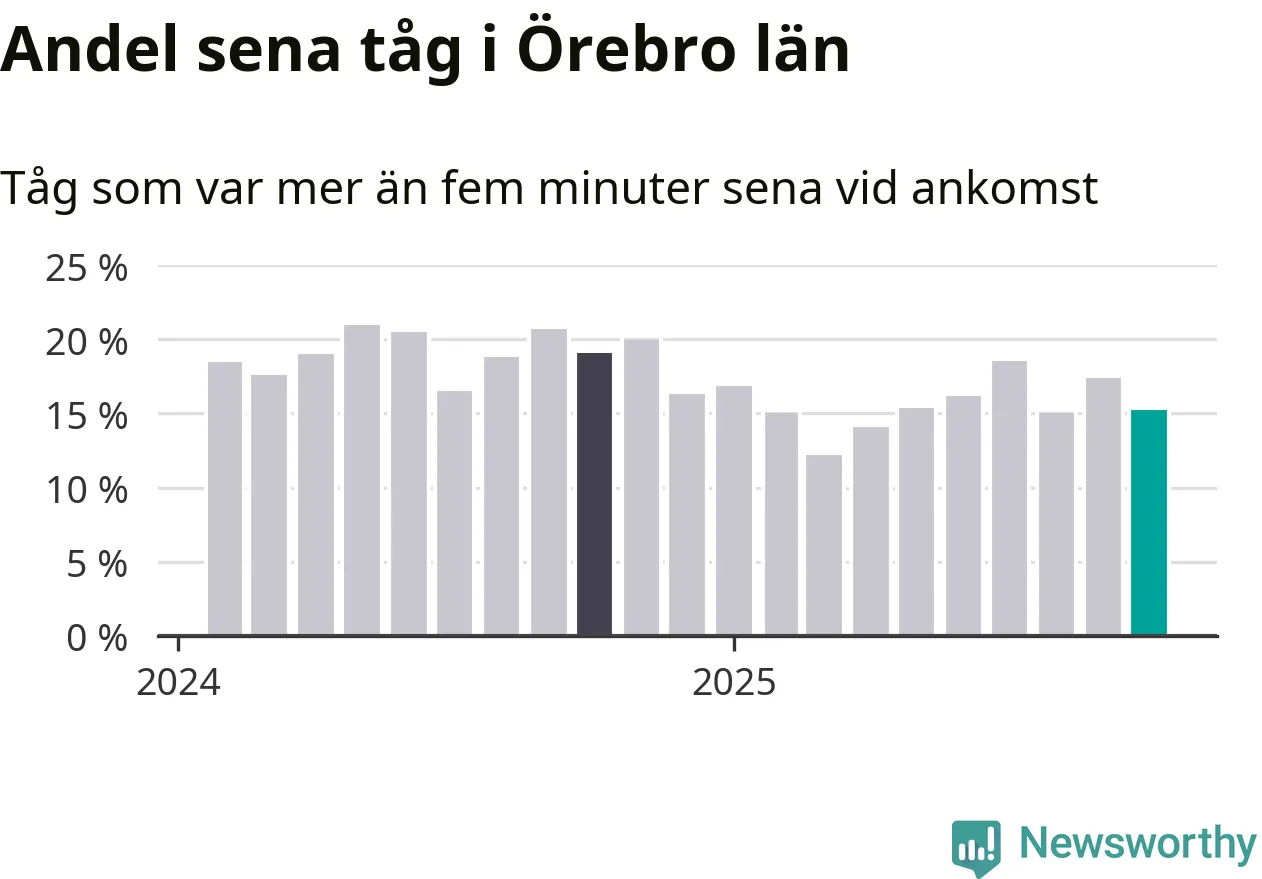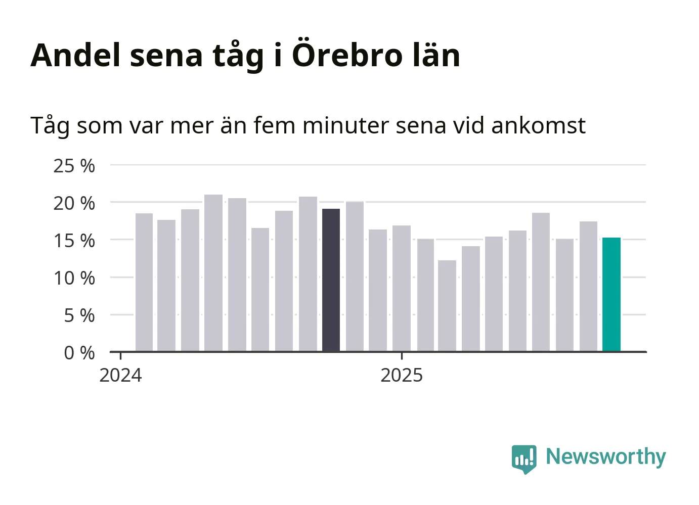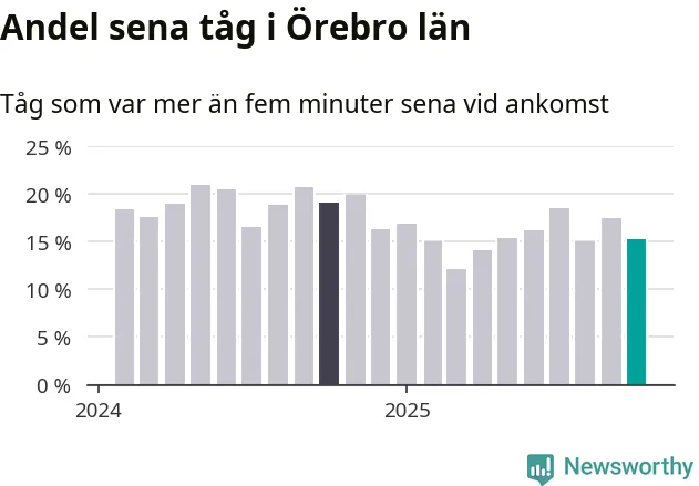 15 procent kan jämföras med 17 procent månaden innan, och 19 procent i oktober 2024. Siffrorna bygger på realtidsinformation om tågavgångar och ankomster från Trafikverket, som Newsworthy löpande samlar in.