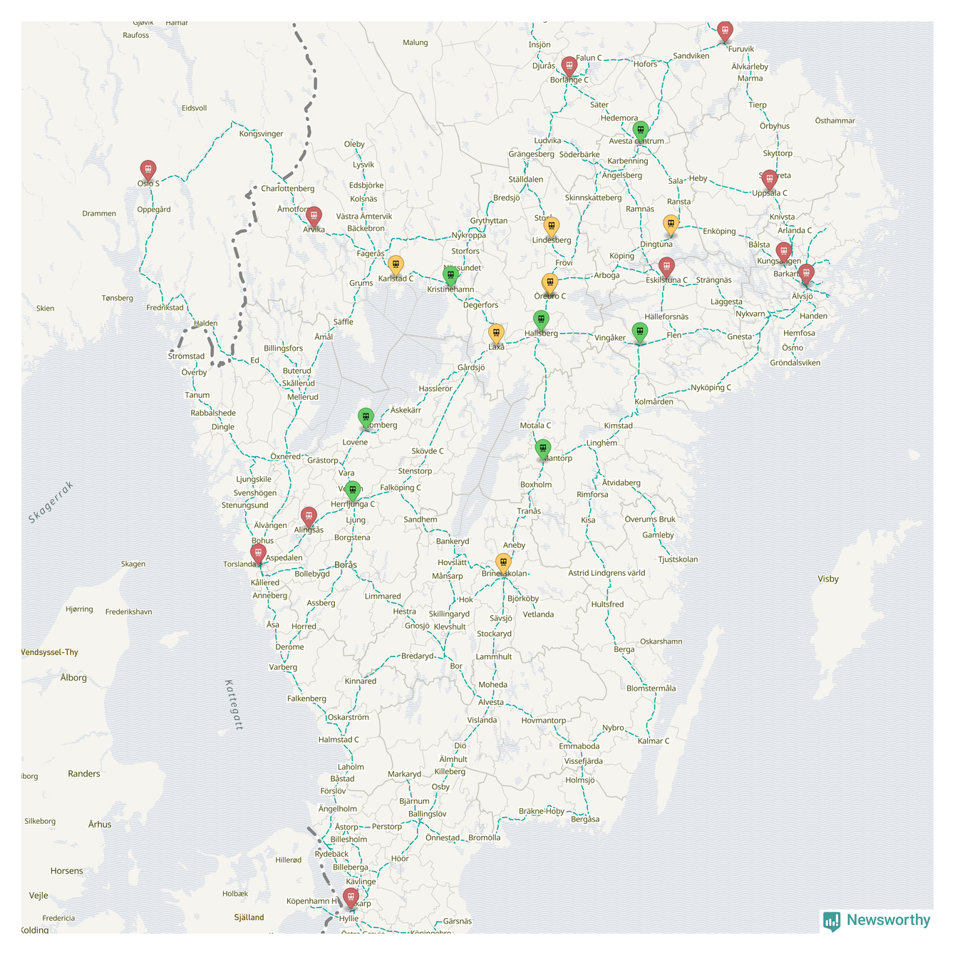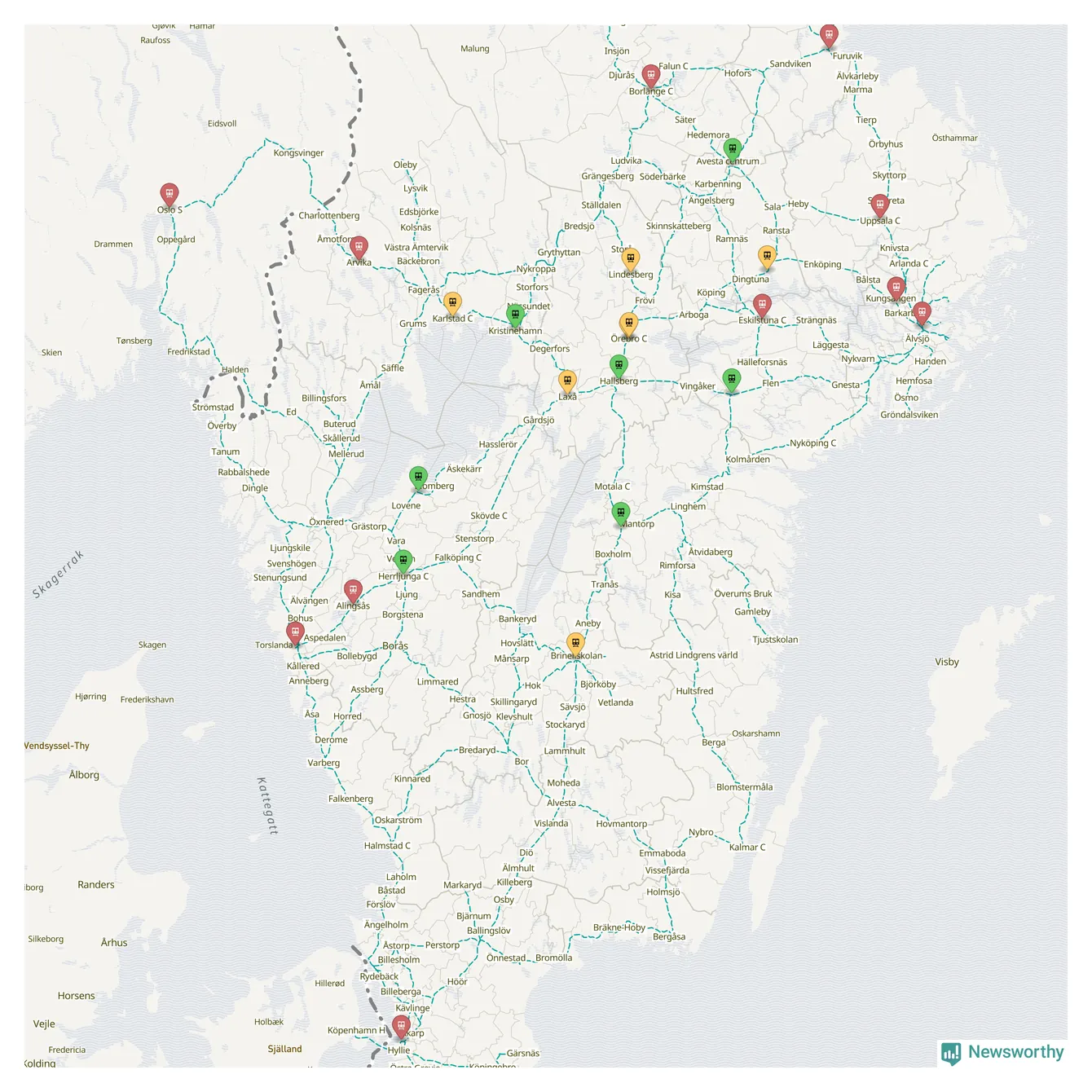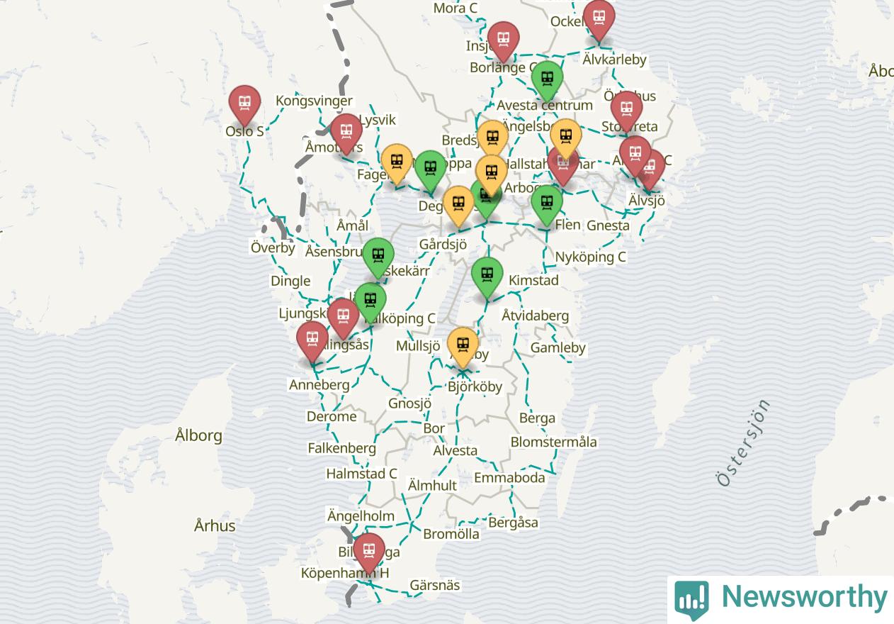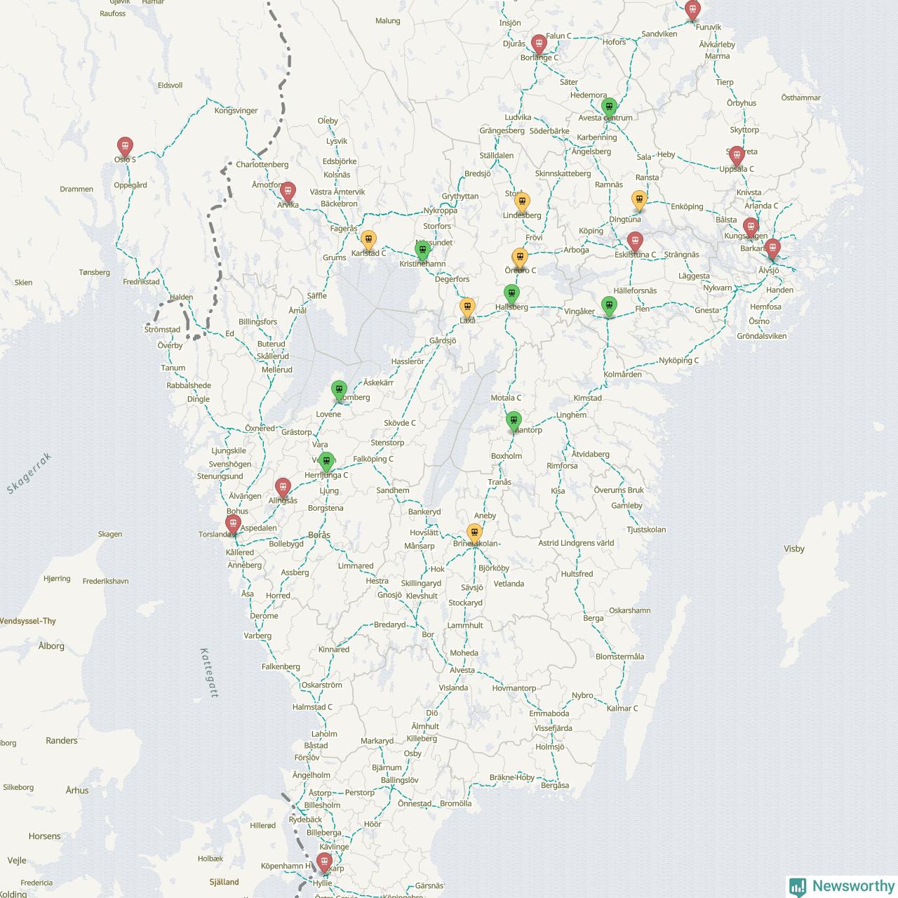Kartdata från Mapbox, Newsworthy, OpenStreetMap och Trafikverket. Uppgifter om sträckor med passagerartrafik från jarnvag.net.