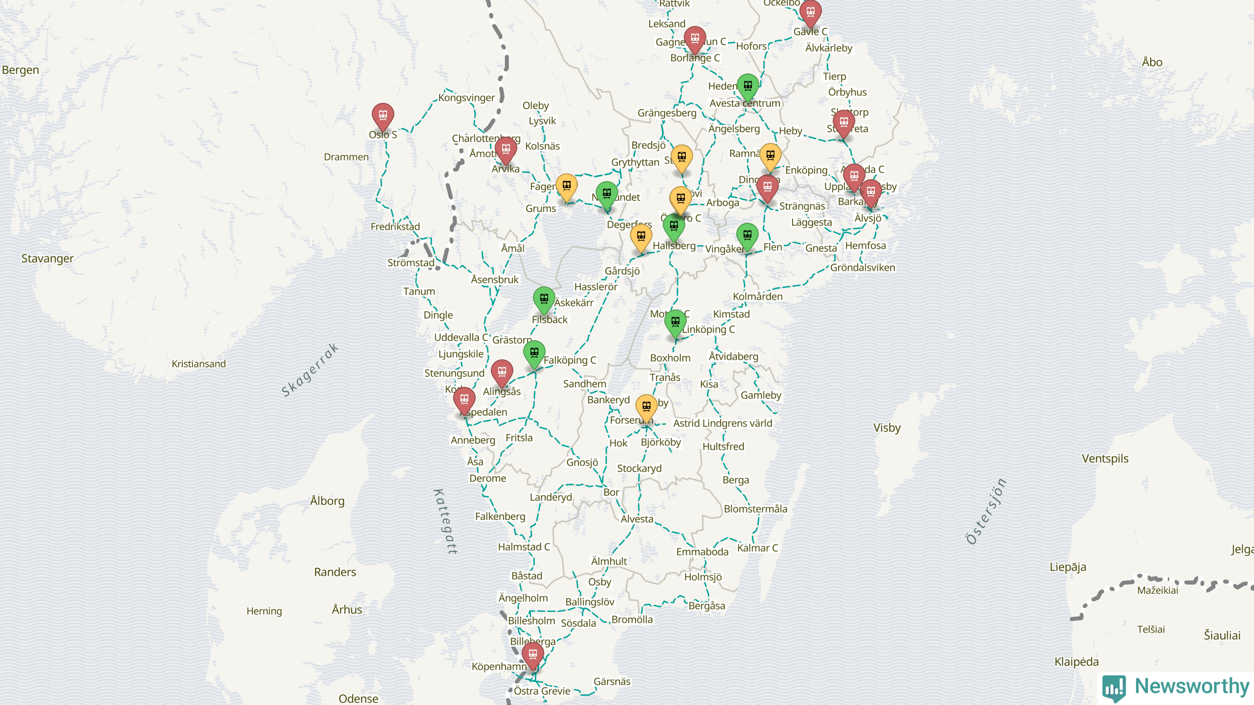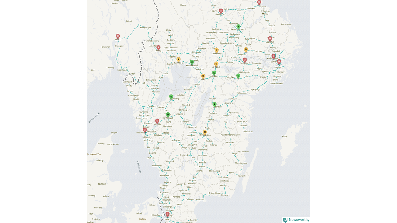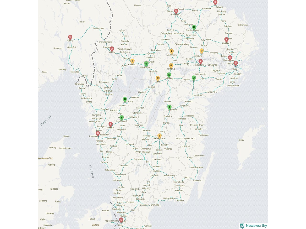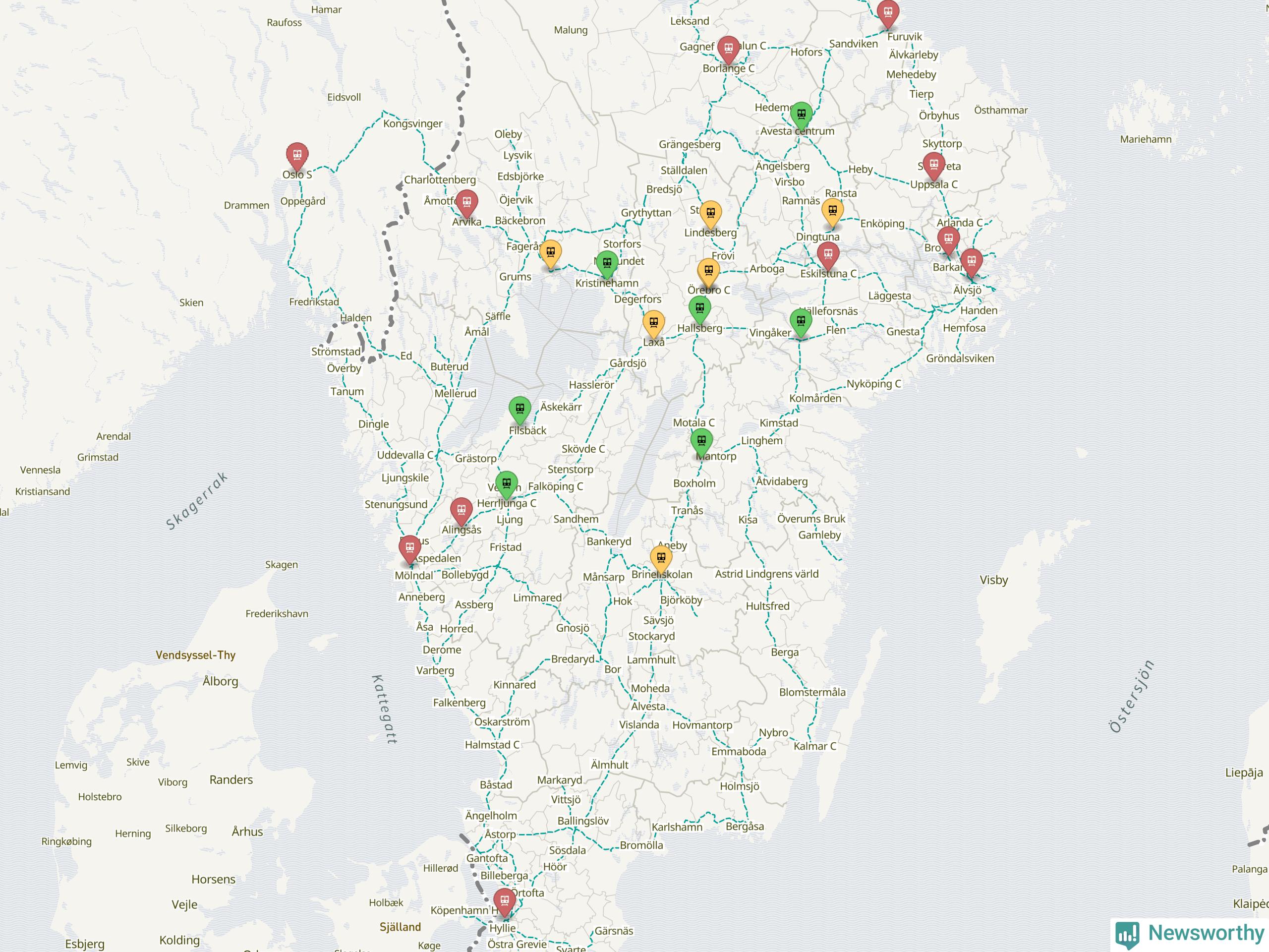 Kartdata från Mapbox, Newsworthy, OpenStreetMap och Trafikverket. Uppgifter om sträckor med passagerartrafik från jarnvag.net.