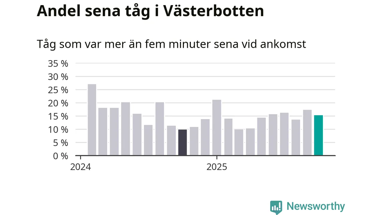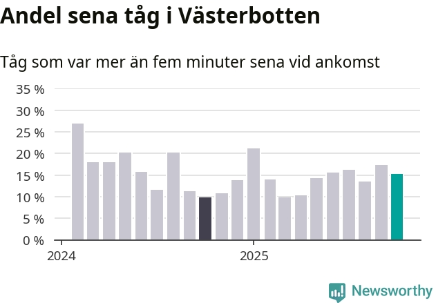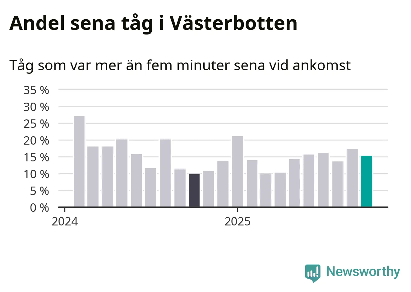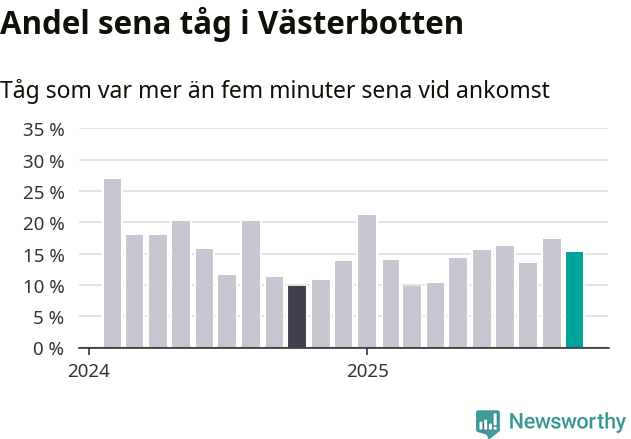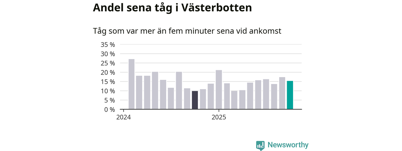 15 procent kan jämföras med 17 procent månaden innan, och tio procent i oktober 2024. Siffrorna bygger på realtidsinformation om tågavgångar och ankomster från Trafikverket, som Newsworthy löpande samlar in.