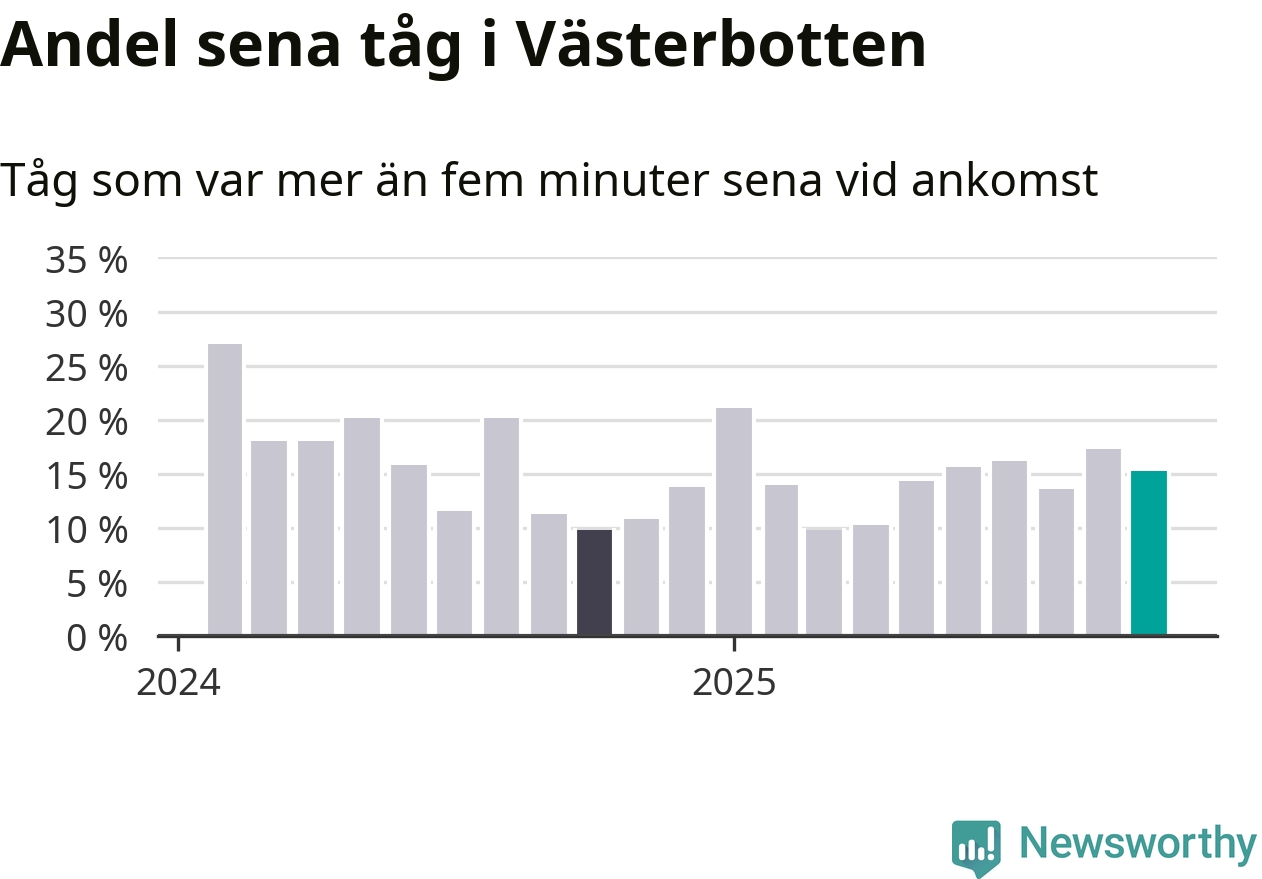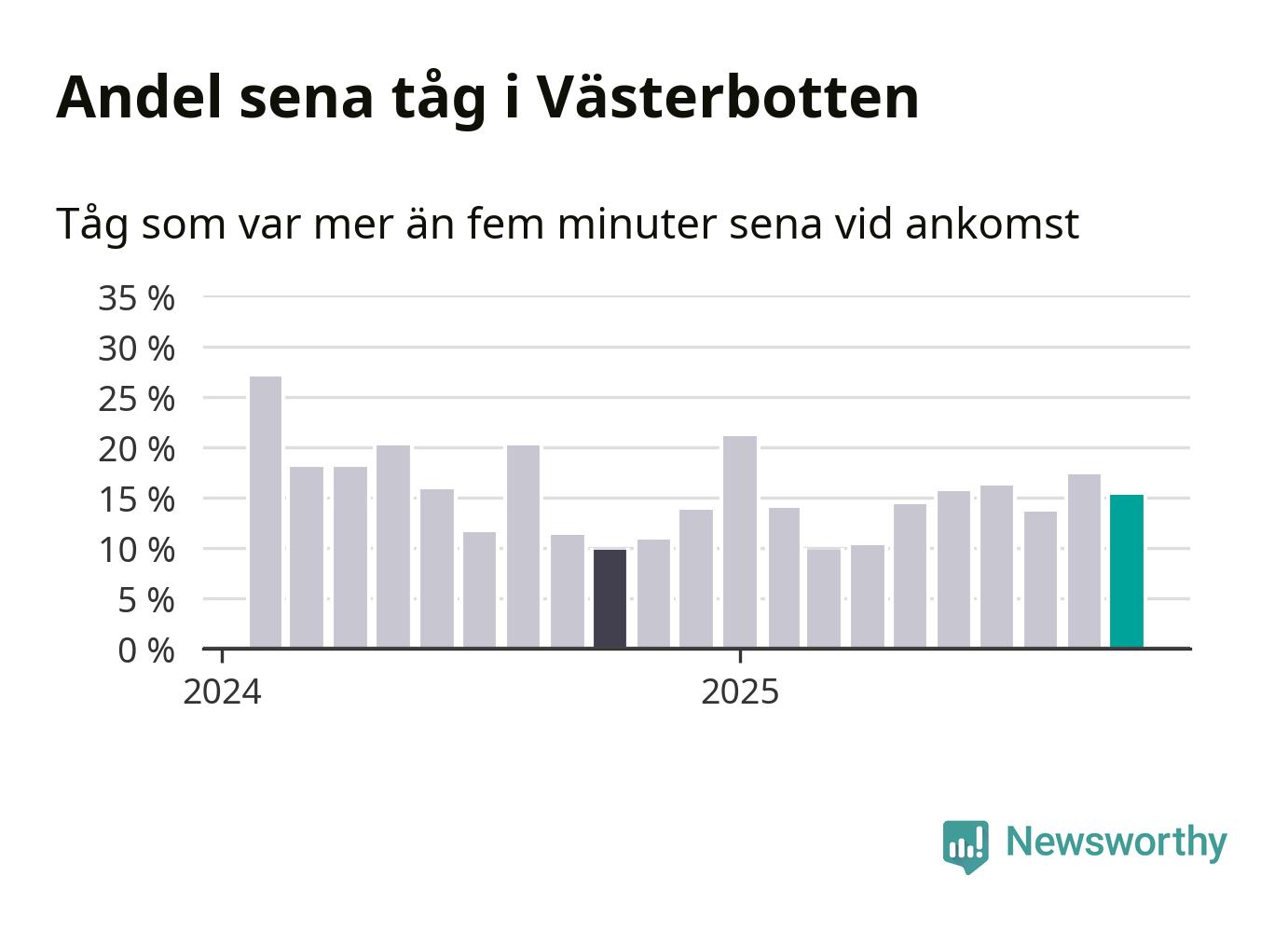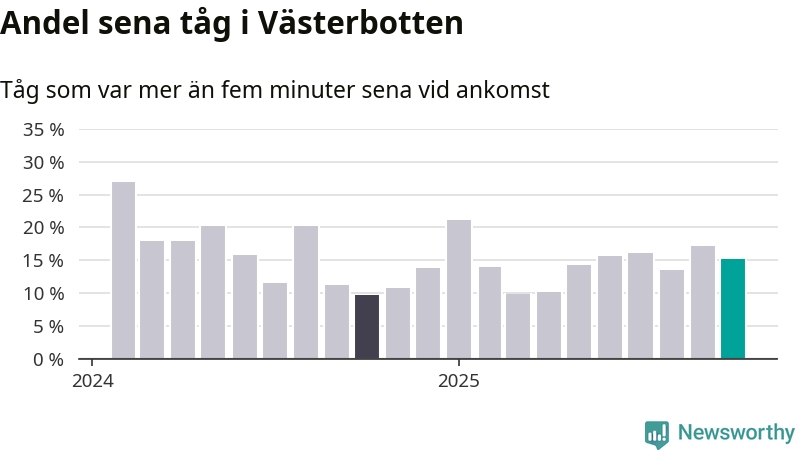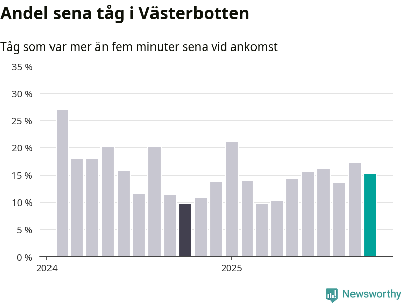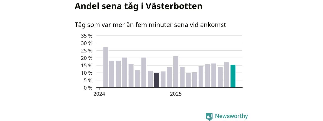 15 procent kan jämföras med 17 procent månaden innan, och tio procent i oktober 2024. Siffrorna bygger på realtidsinformation om tågavgångar och ankomster från Trafikverket, som Newsworthy löpande samlar in.