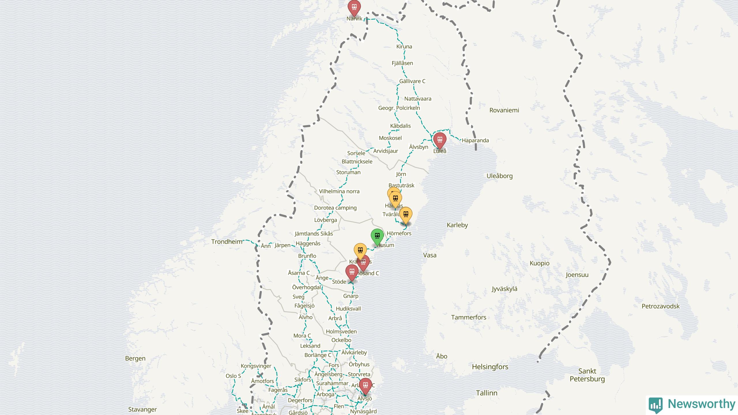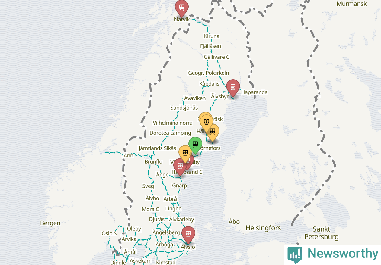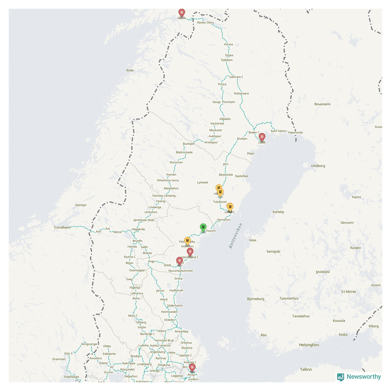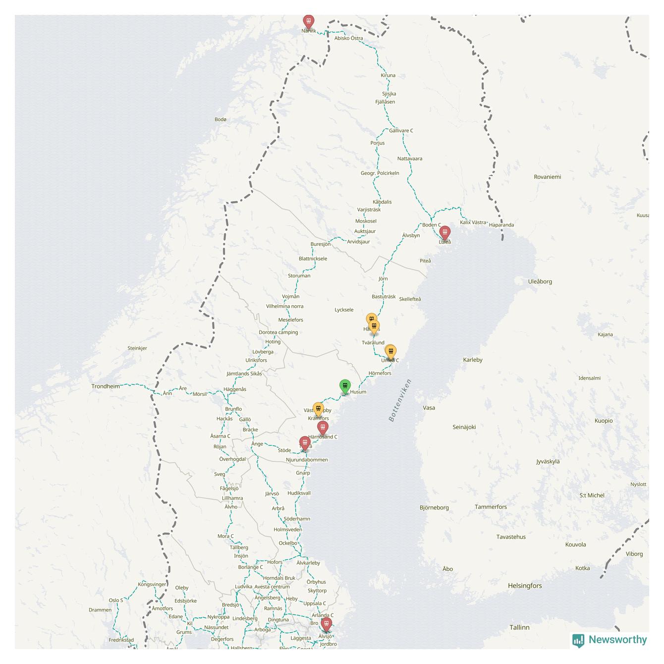 Kartdata från Mapbox, Newsworthy, OpenStreetMap och Trafikverket. Uppgifter om sträckor med passagerartrafik från jarnvag.net.