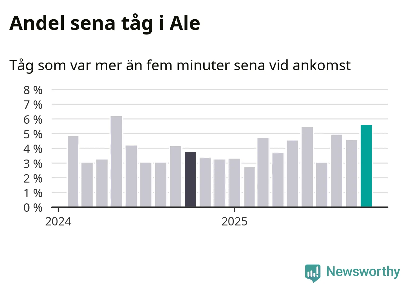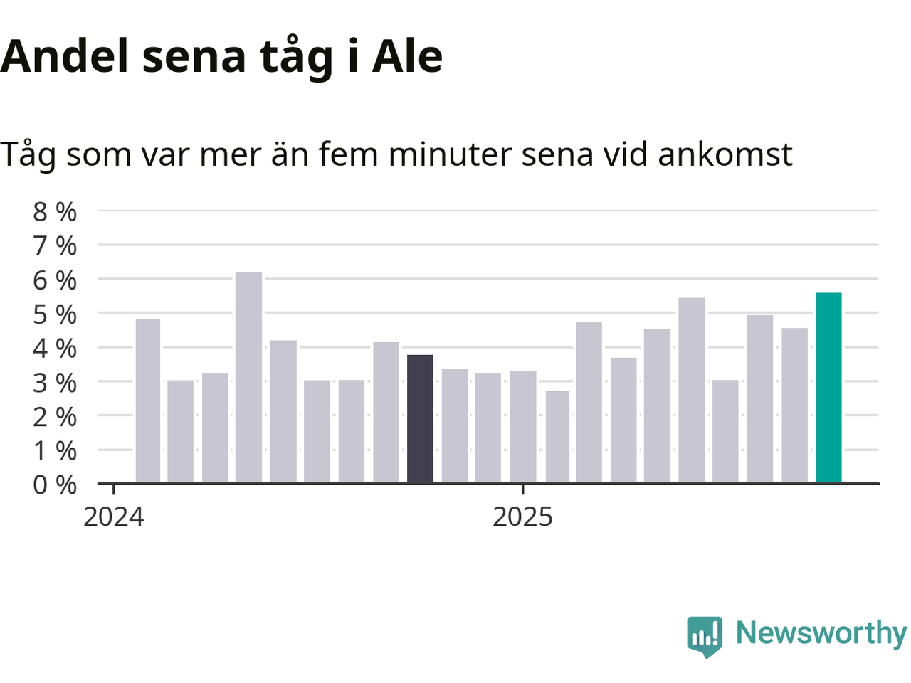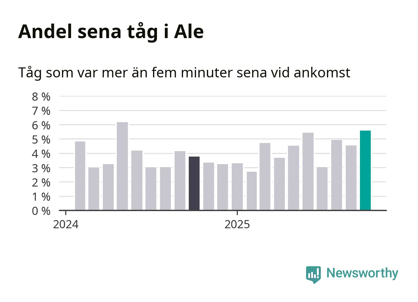 Så hög har andelen förseningar inte varit sedan maj 2024. Siffrorna bygger på realtidsinformation om tågavgångar och ankomster från Trafikverket, som Newsworthy löpande samlar in.