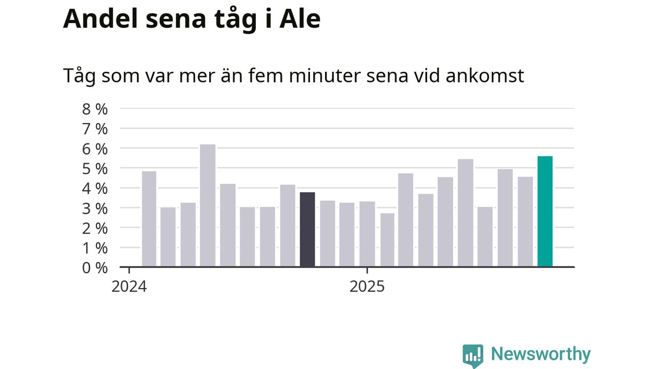 Av omkring 4 400 tåg som passerade någon av stationerna i Ale kommun i oktober var 244 mer än fem minuter sena. Det motsvarar 6 procent.