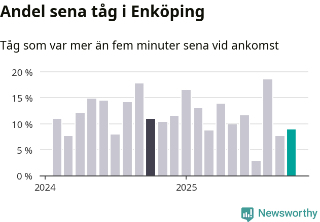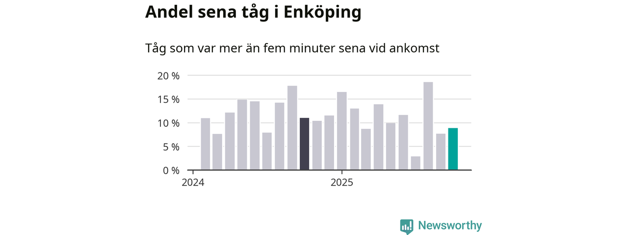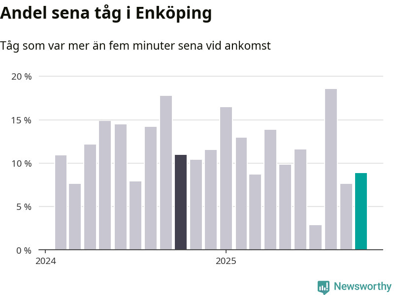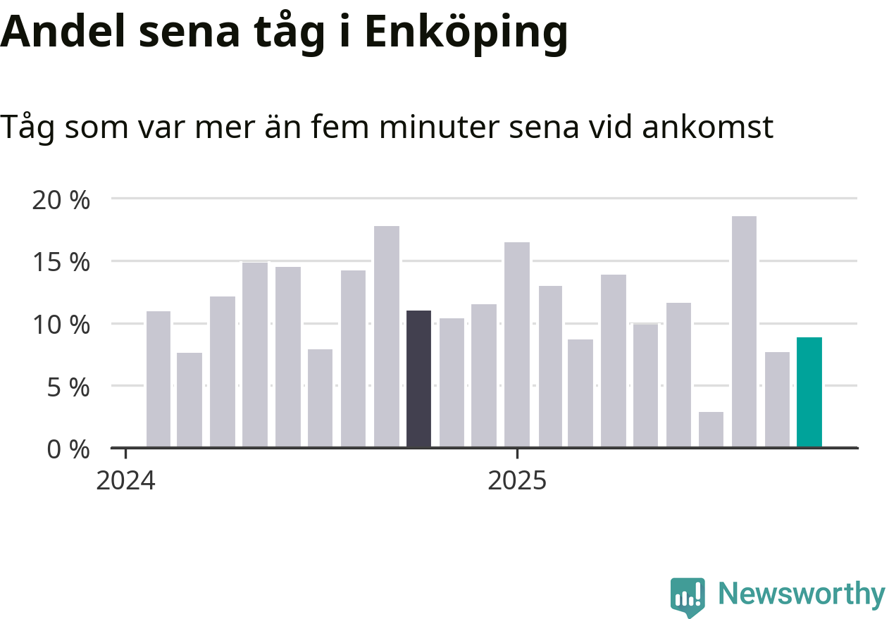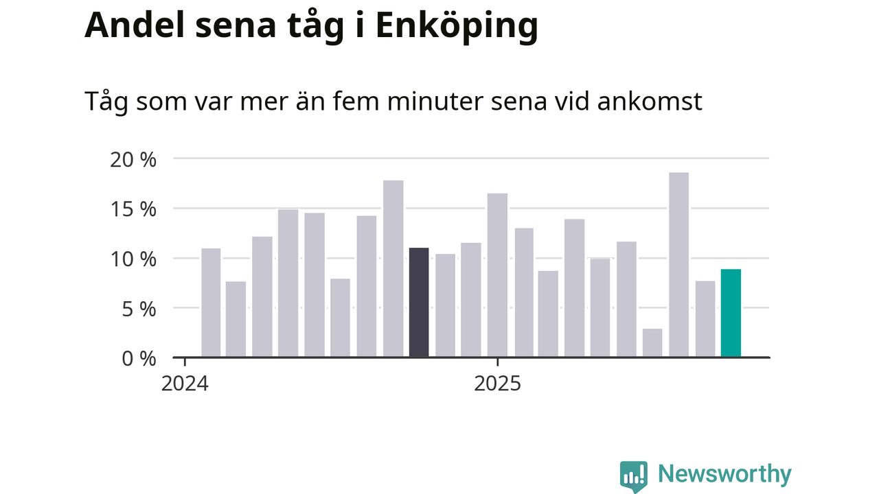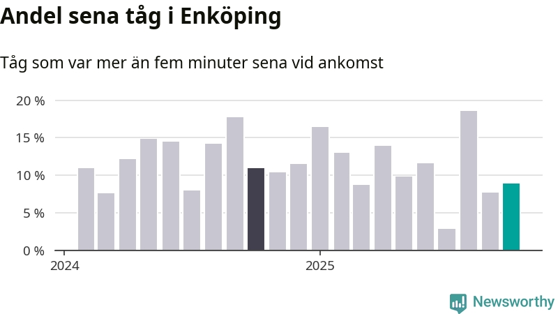 Nio procent kan jämföras med åtta procent månaden innan, och elva procent i oktober 2024. Siffrorna bygger på realtidsinformation om tågavgångar och ankomster från Trafikverket, som Newsworthy löpande samlar in.