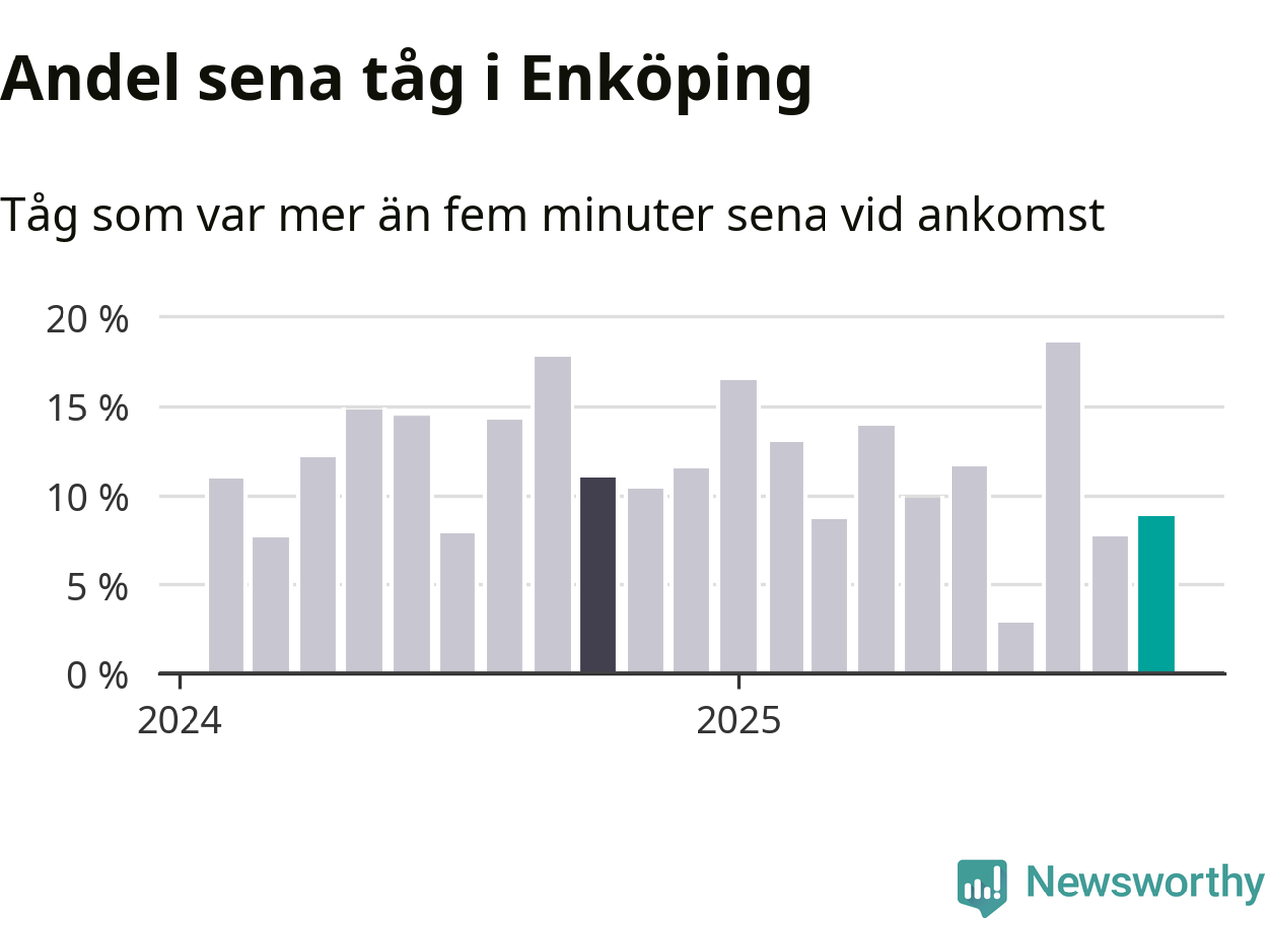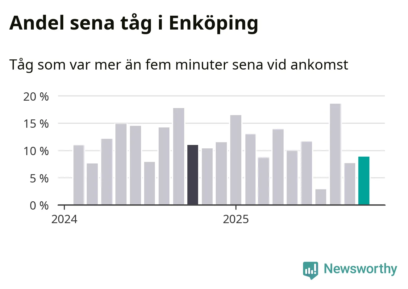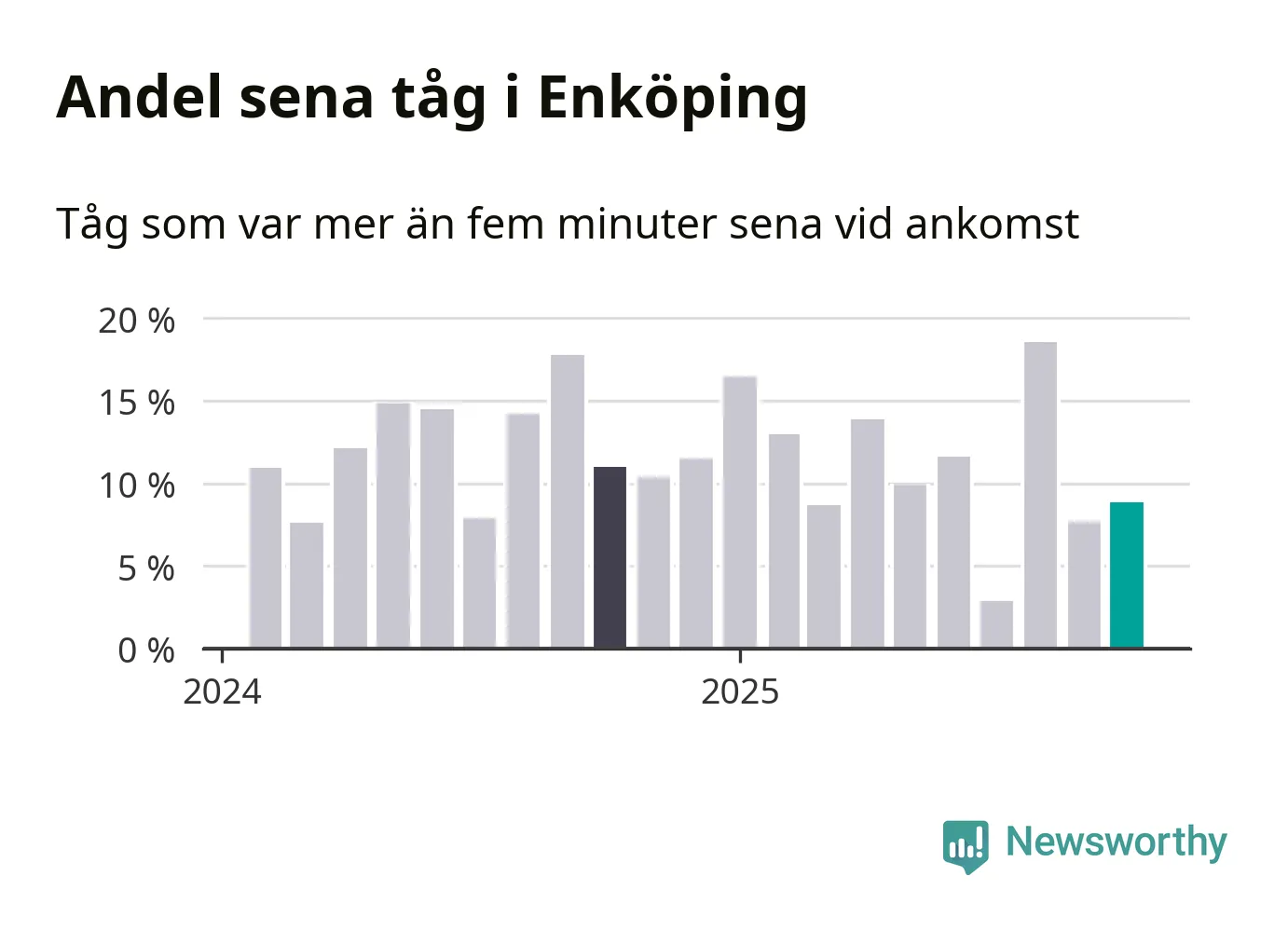 Nio procent kan jämföras med åtta procent månaden innan, och elva procent i oktober 2024. Siffrorna bygger på realtidsinformation om tågavgångar och ankomster från Trafikverket, som Newsworthy löpande samlar in.