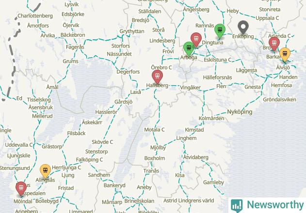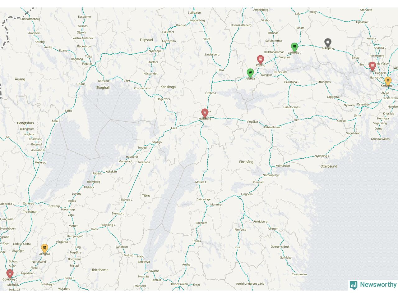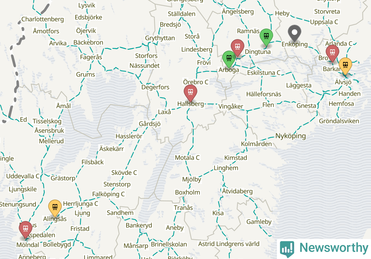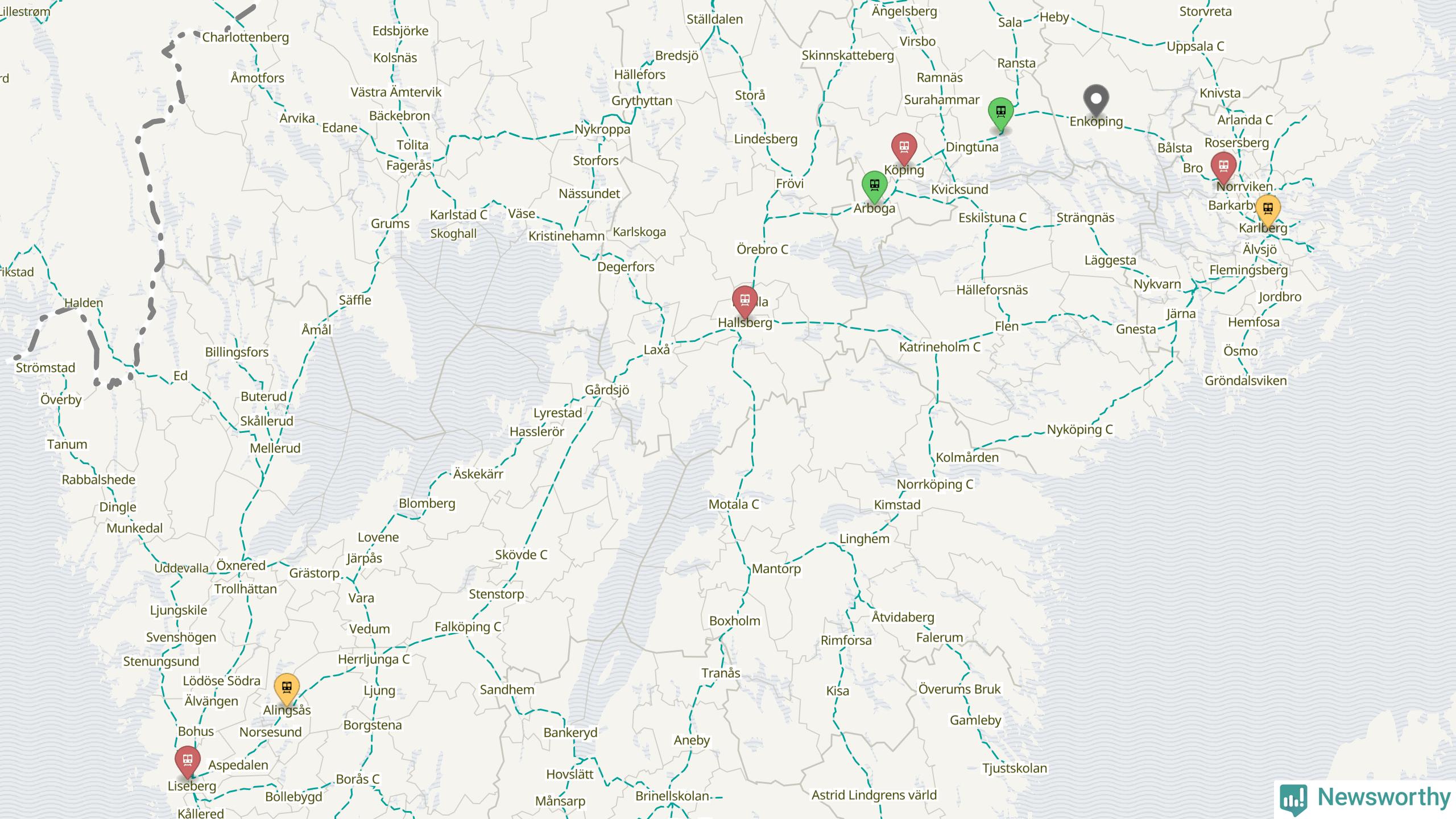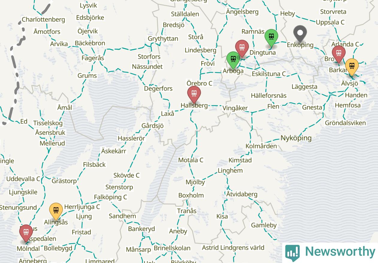 Kartdata från Mapbox, Newsworthy, OpenStreetMap och Trafikverket. Uppgifter om sträckor med passagerartrafik från jarnvag.net.