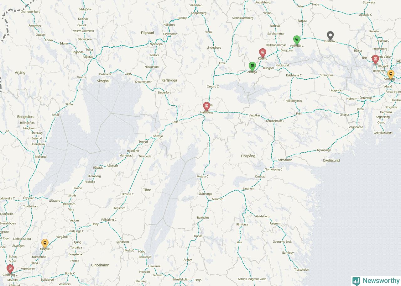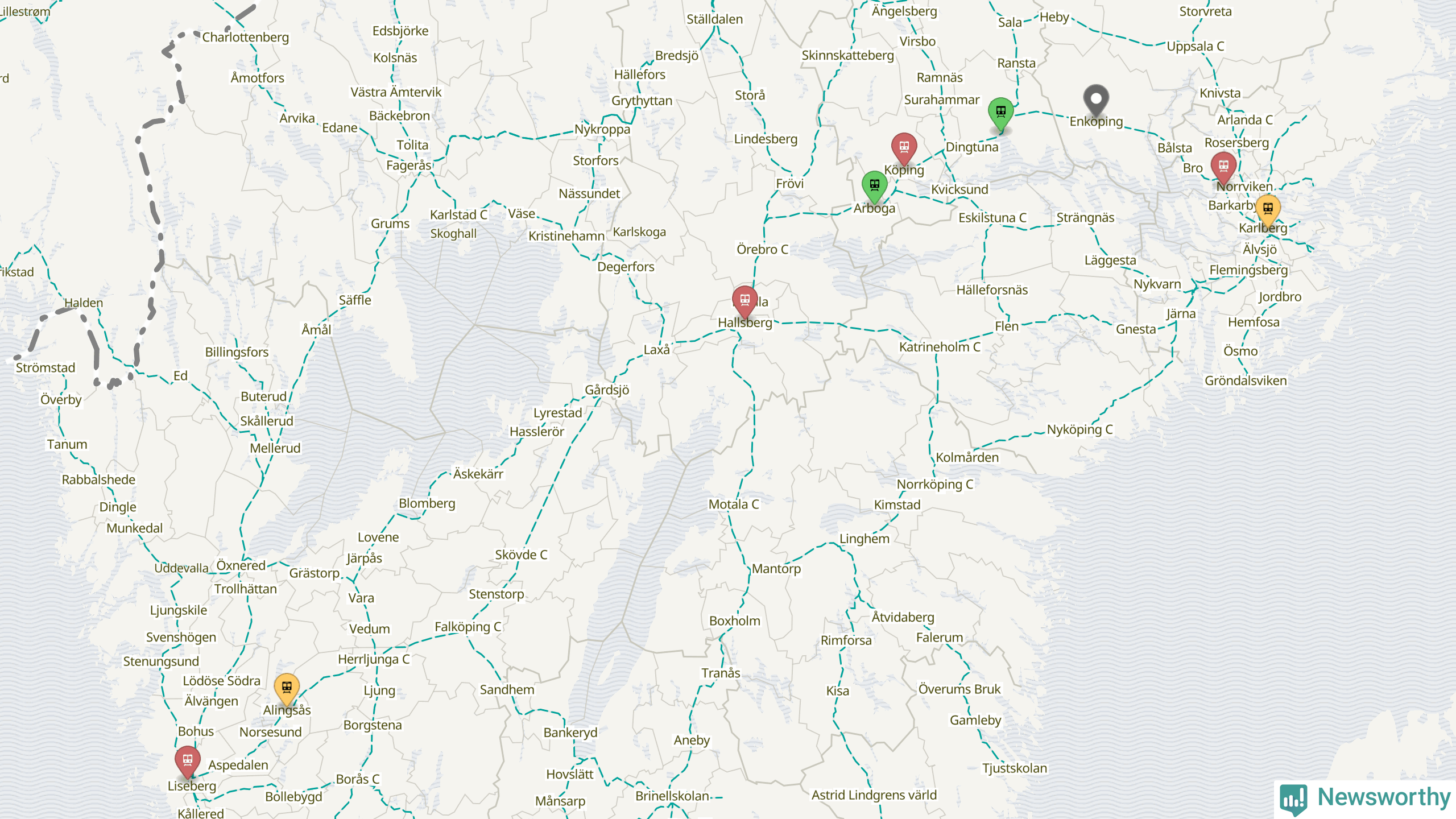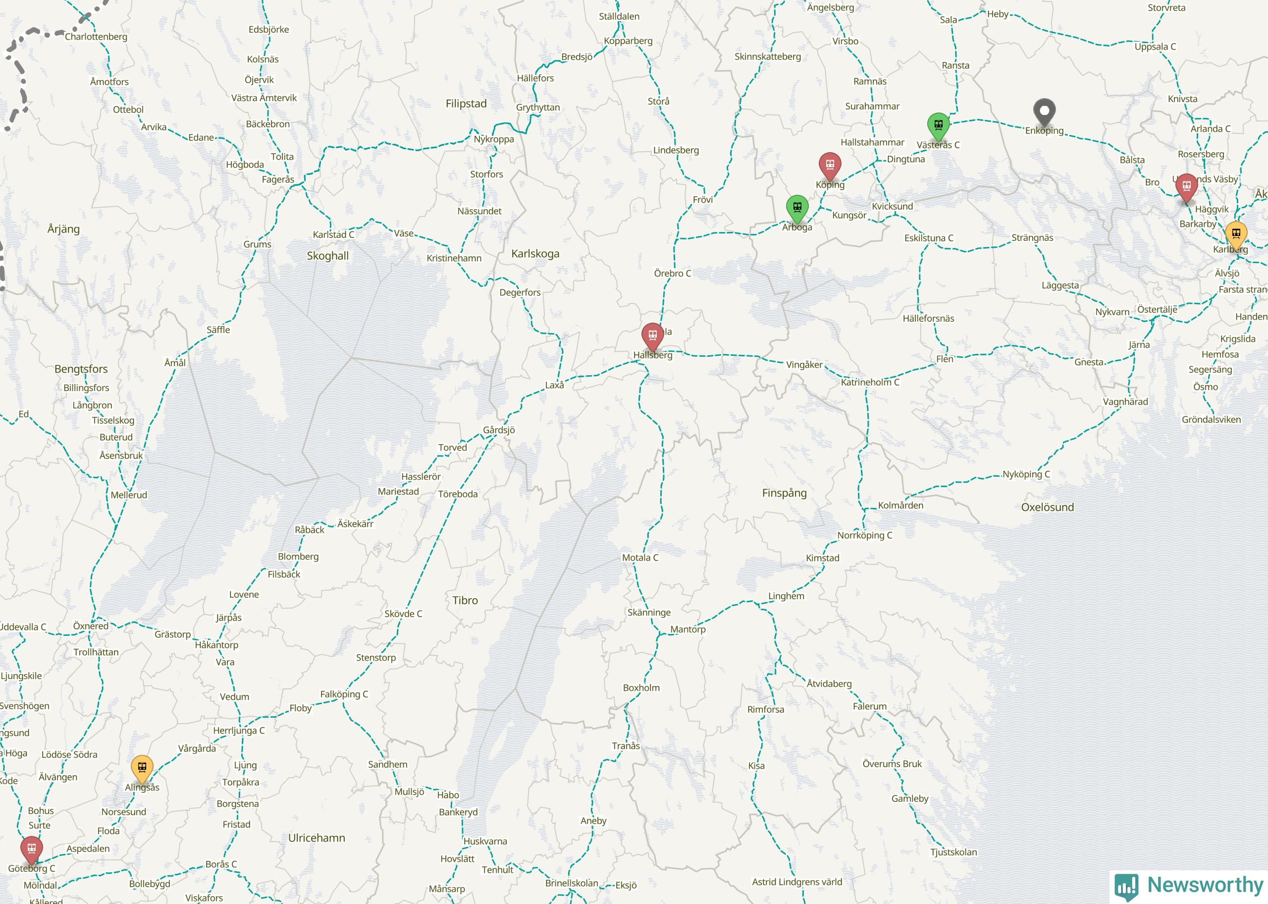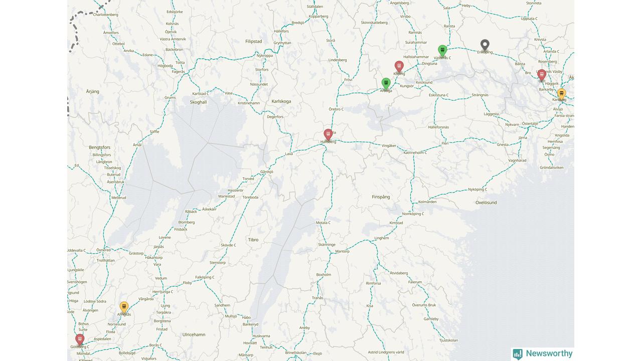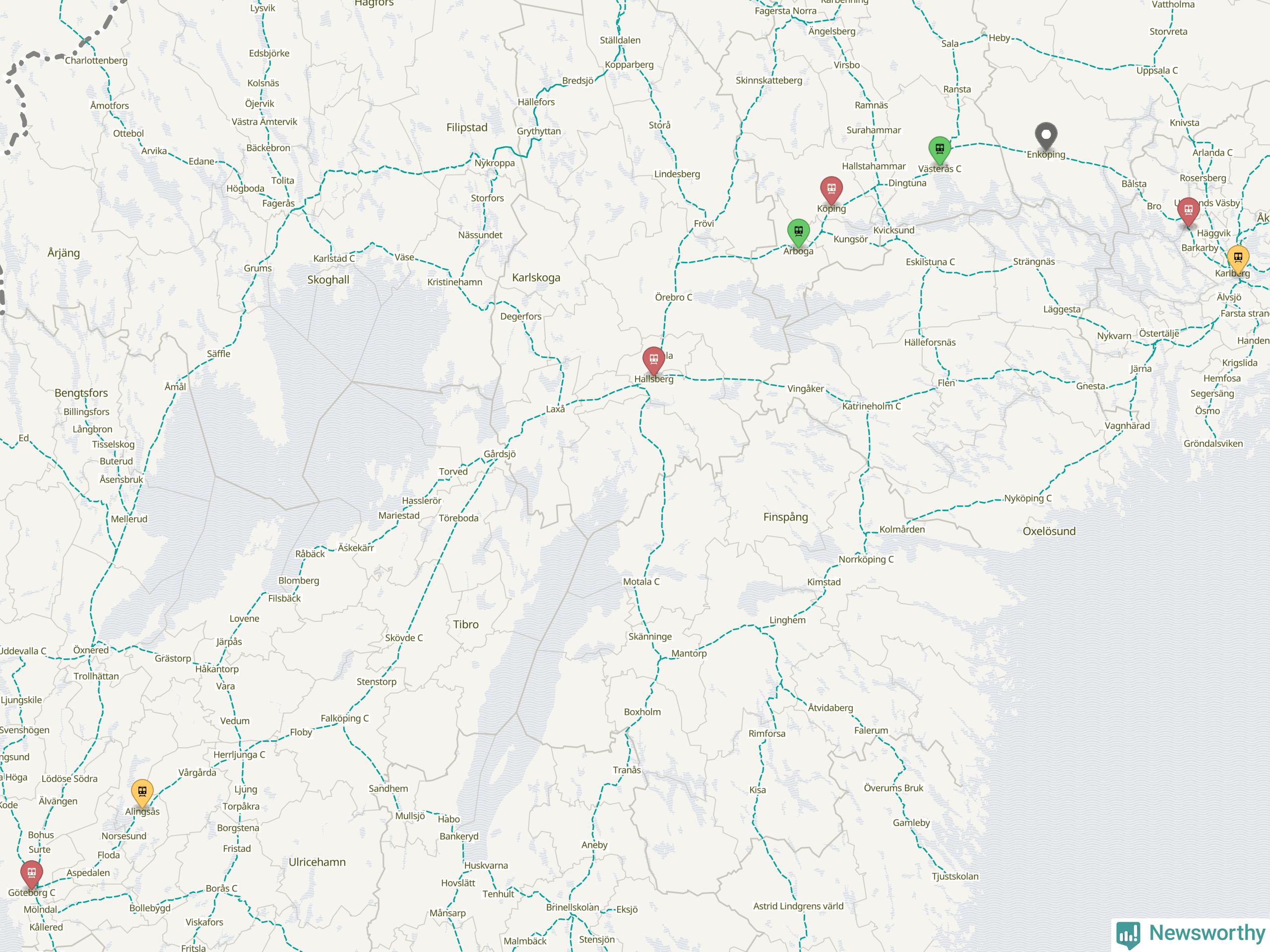 Kartdata från Mapbox, Newsworthy, OpenStreetMap och Trafikverket. Uppgifter om sträckor med passagerartrafik från jarnvag.net.