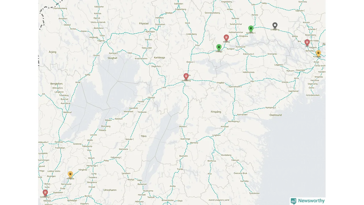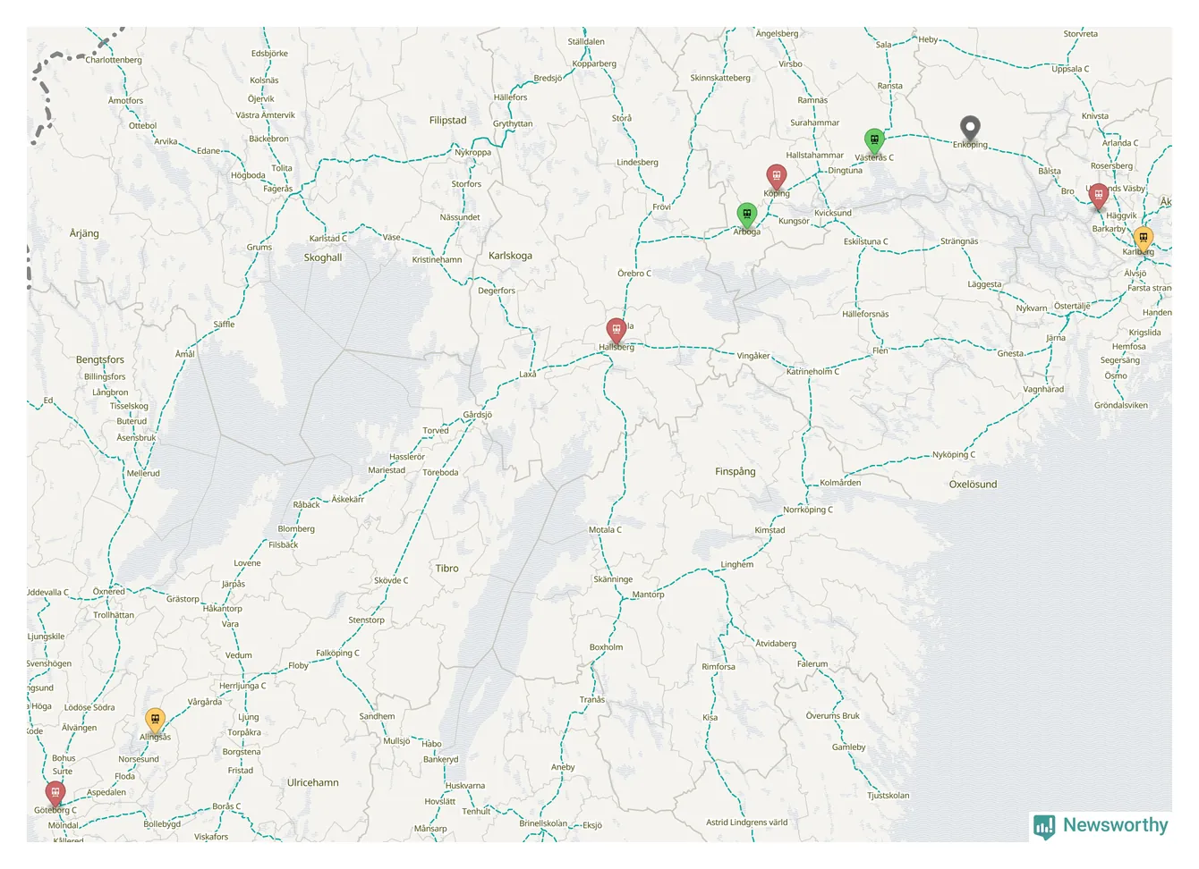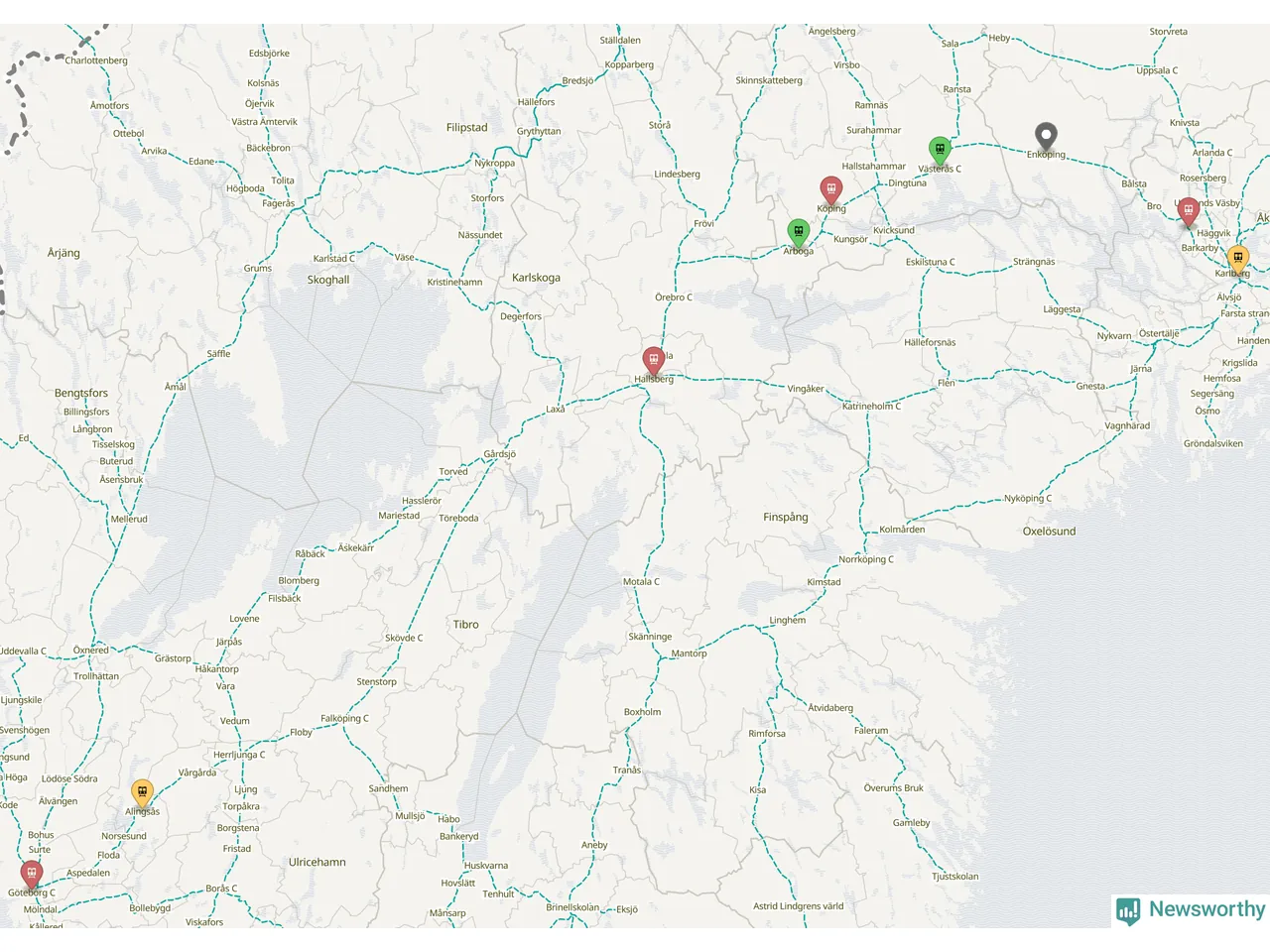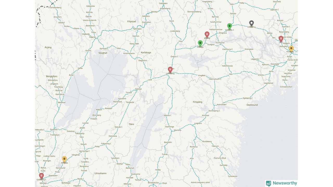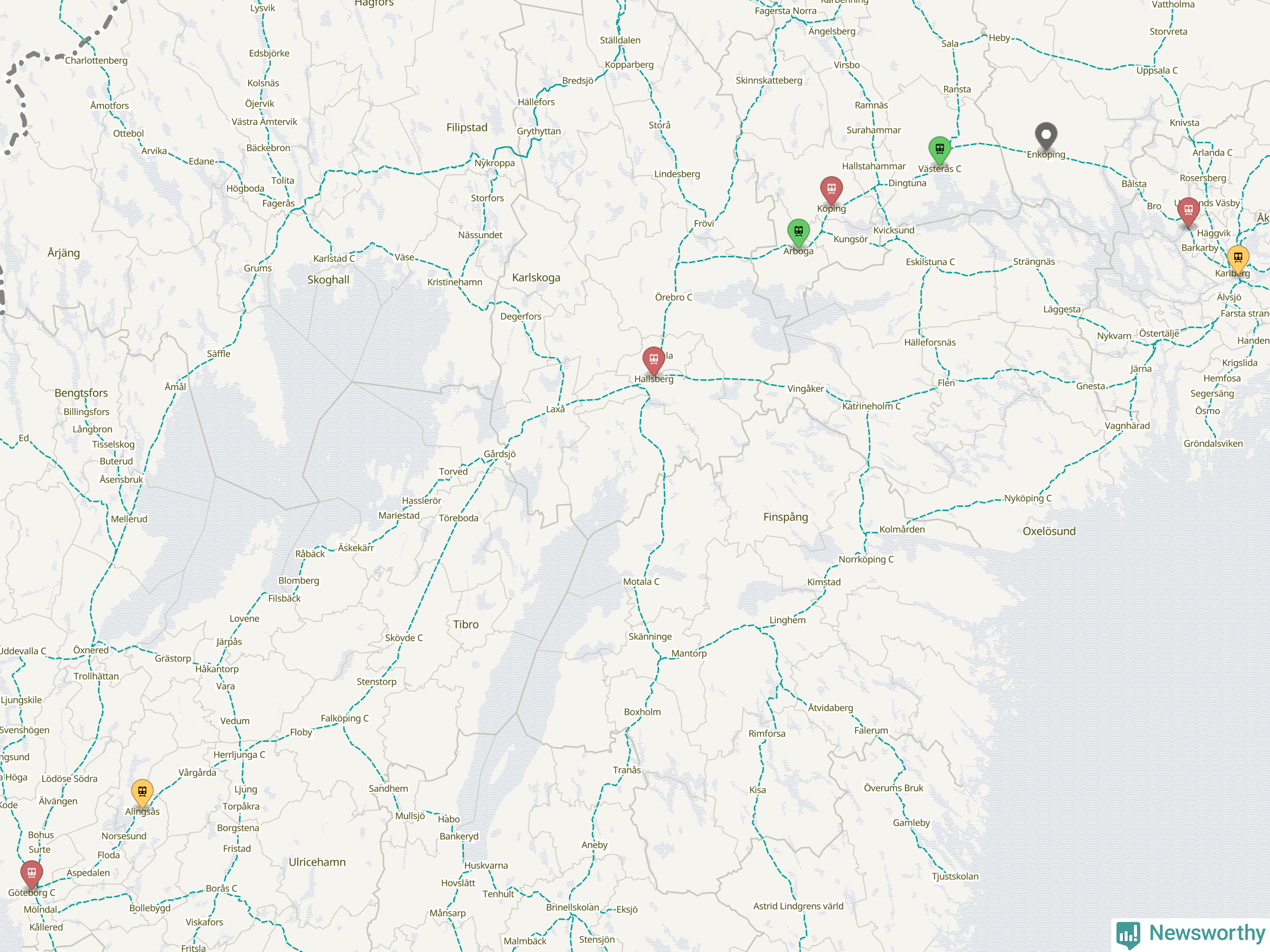 Kartdata från Mapbox, Newsworthy, OpenStreetMap och Trafikverket. Uppgifter om sträckor med passagerartrafik från jarnvag.net.