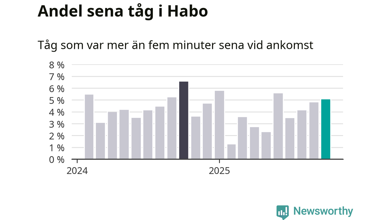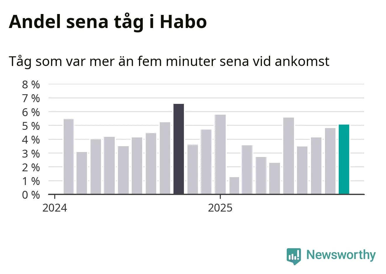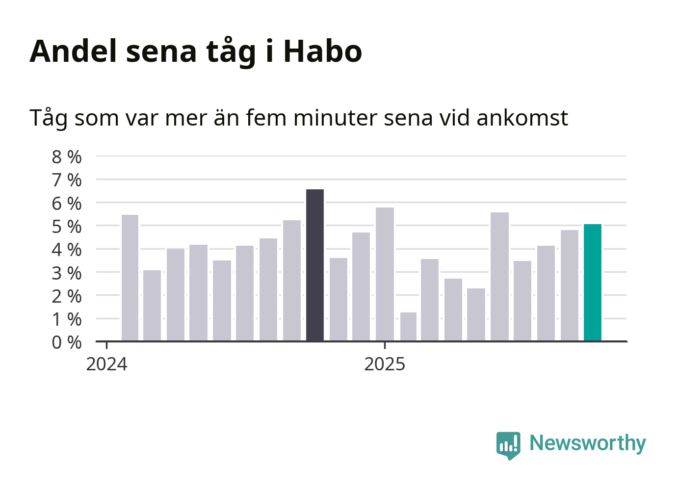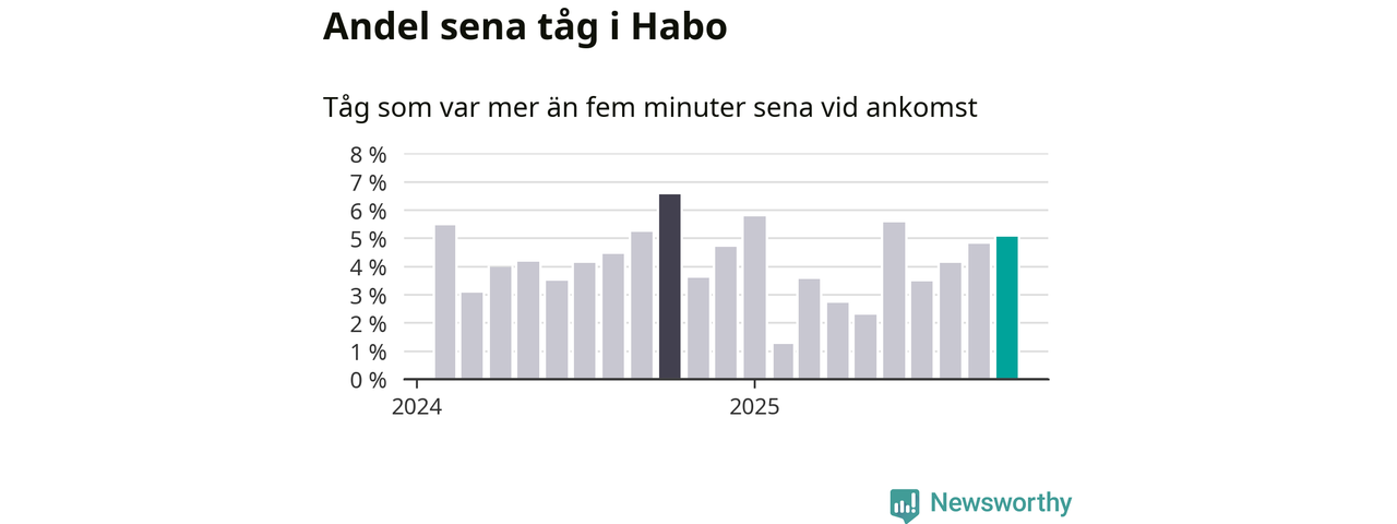 Fem procent är marginellt mer än månaden innan, och kan jämföras med sju procent i oktober 2024. Oktober är den tredje månaden i rad med ökande förseningar vid Habo station, även om skillnaden från föregående månad var liten. Siffrorna bygger på realtidsinformation om tågavgångar och ankomster från Trafikverket, som Newsworthy löpande samlar in.