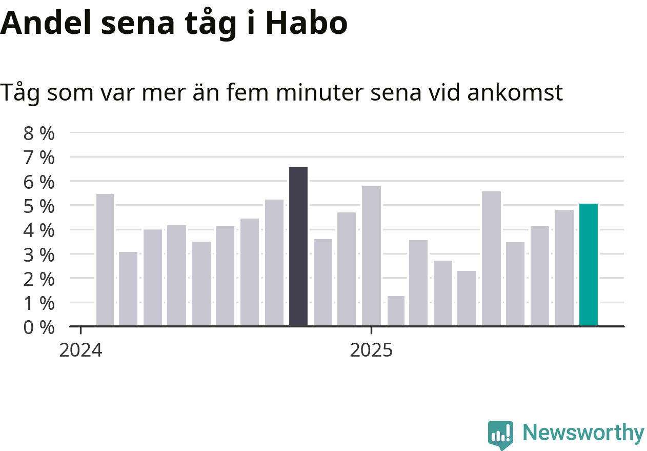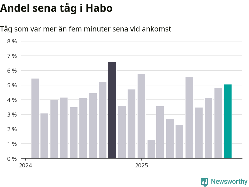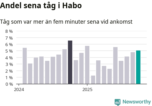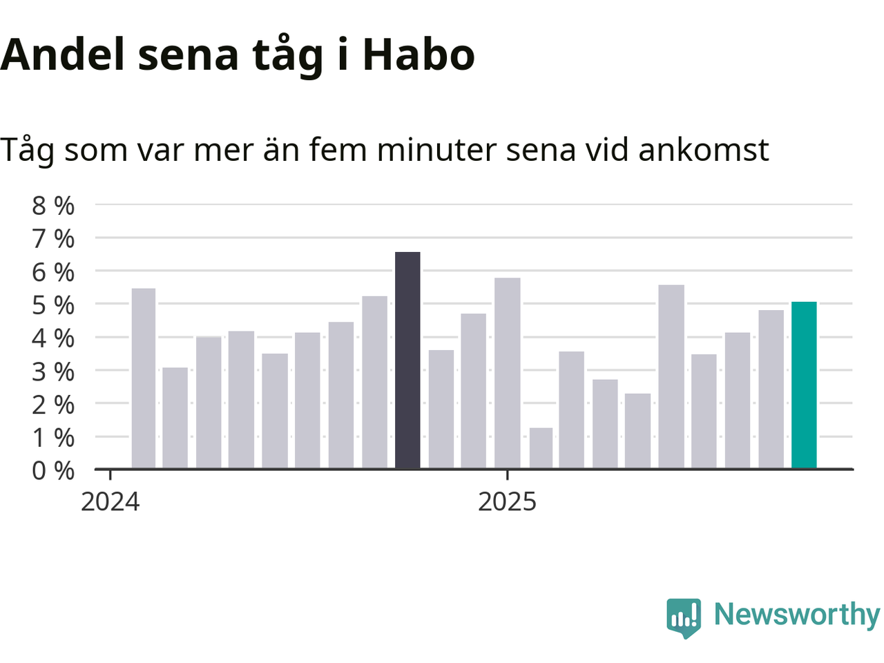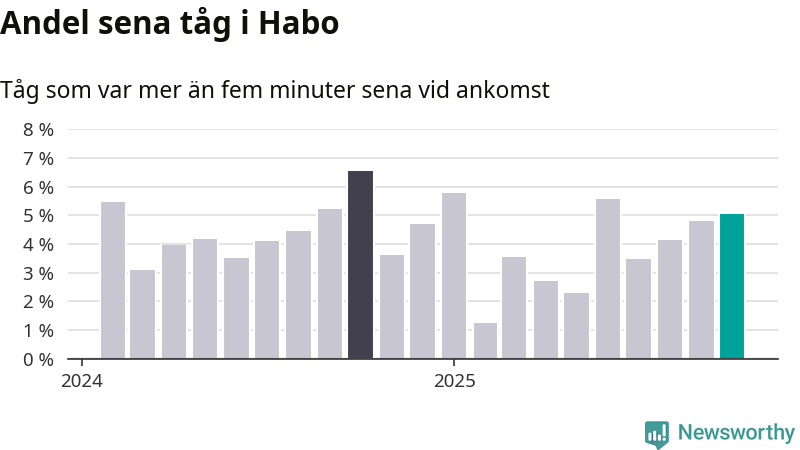 Fem procent är marginellt mer än månaden innan, och kan jämföras med sju procent i oktober 2024. Oktober är den tredje månaden i rad med ökande förseningar vid Habo station, även om skillnaden från föregående månad var liten. Siffrorna bygger på realtidsinformation om tågavgångar och ankomster från Trafikverket, som Newsworthy löpande samlar in.
