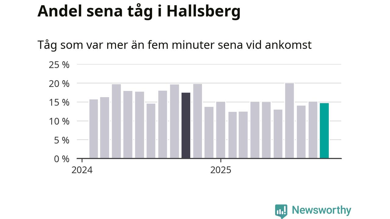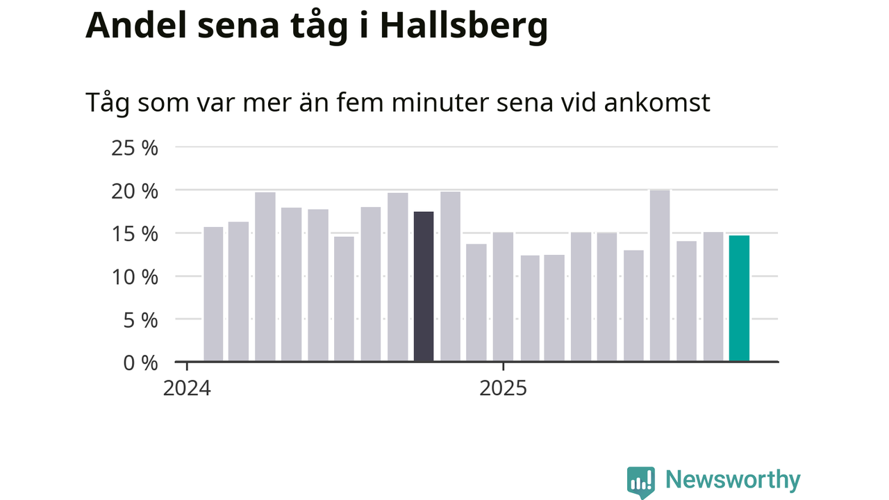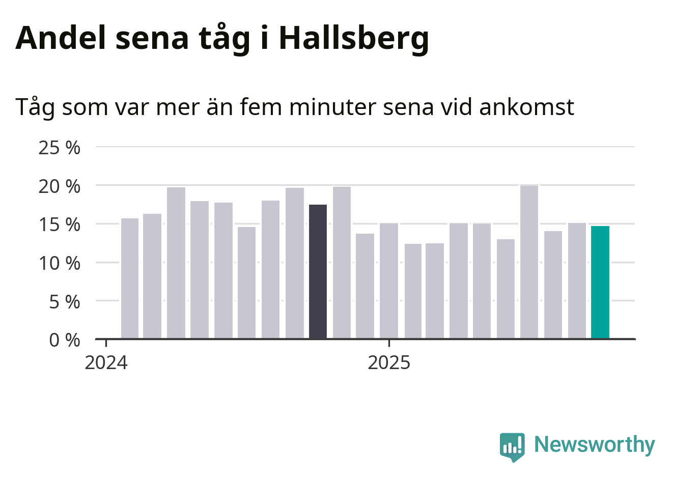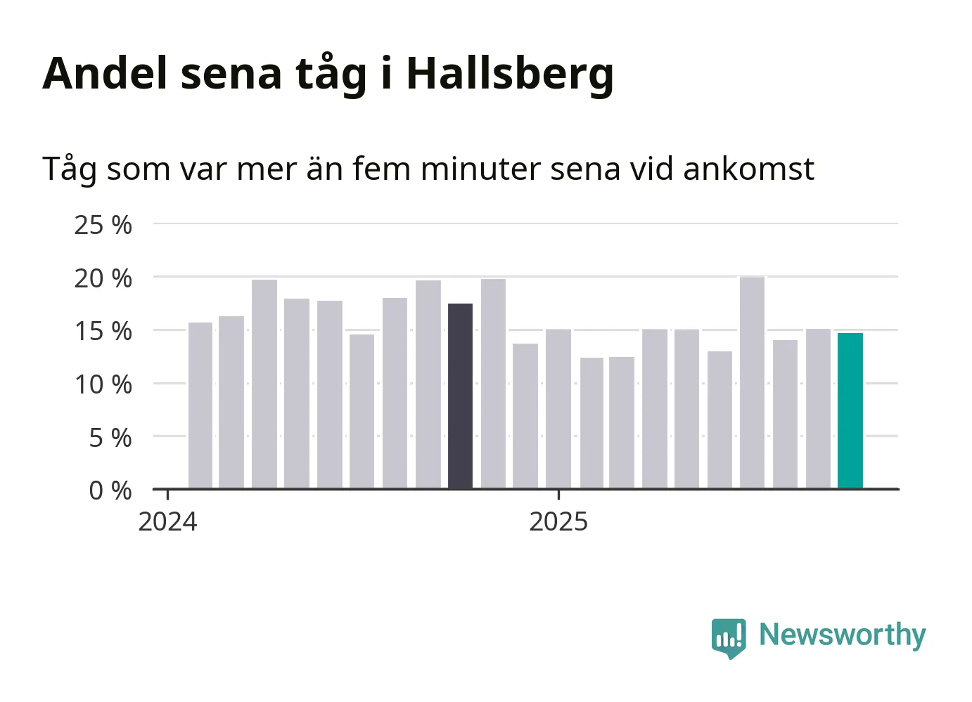 15 procent är marginellt mindre än månaden innan, och kan jämföras med 17 procent i oktober 2024. Siffrorna bygger på realtidsinformation om tågavgångar och ankomster från Trafikverket, som Newsworthy löpande samlar in.