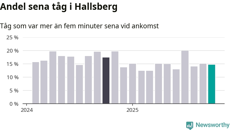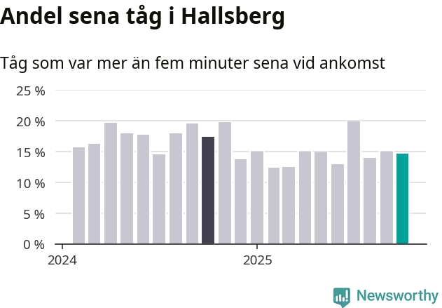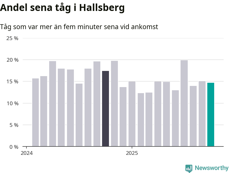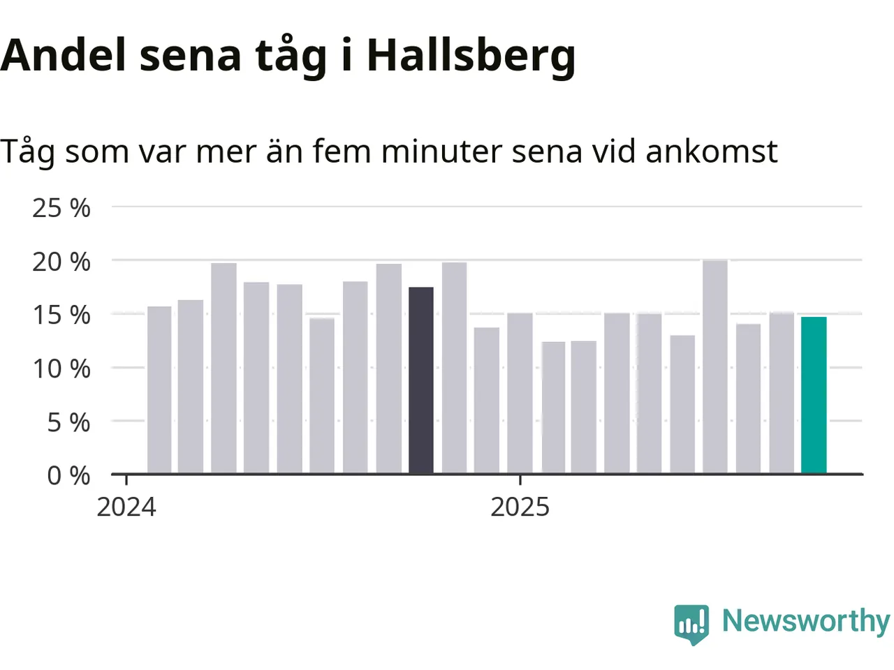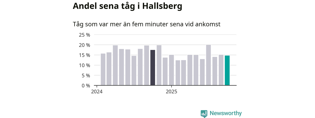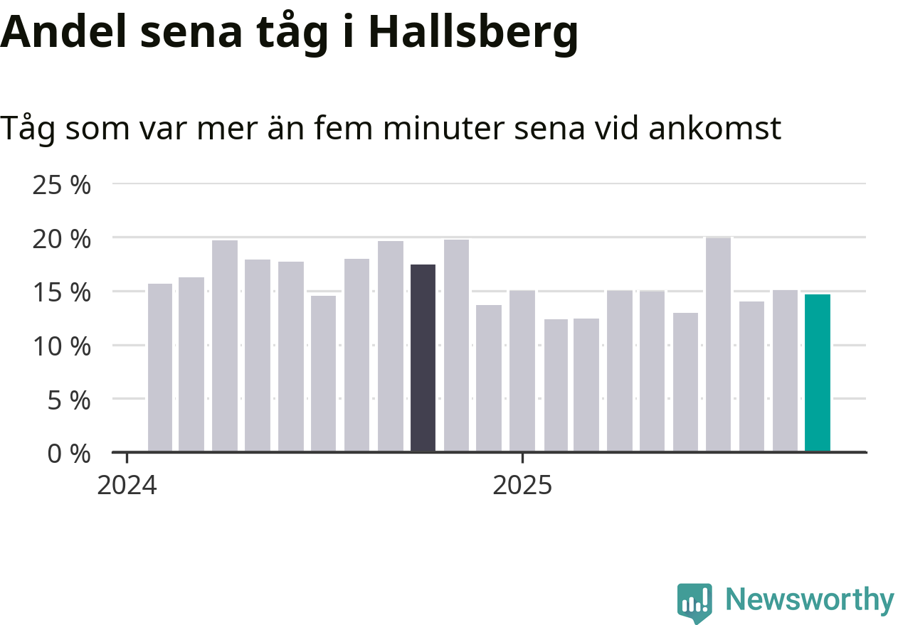 15 procent är marginellt mindre än månaden innan, och kan jämföras med 17 procent i oktober 2024. Siffrorna bygger på realtidsinformation om tågavgångar och ankomster från Trafikverket, som Newsworthy löpande samlar in.