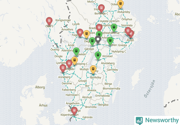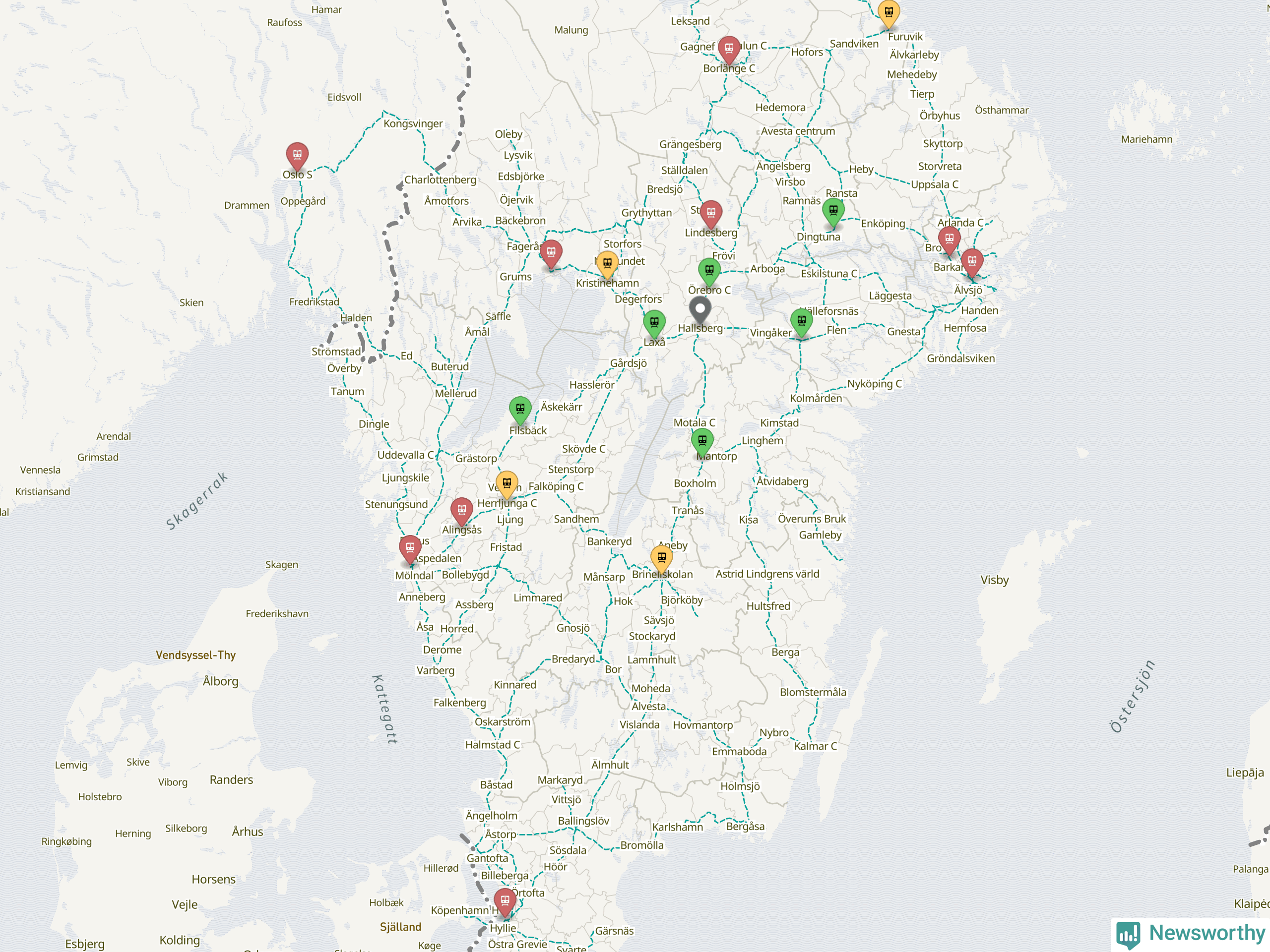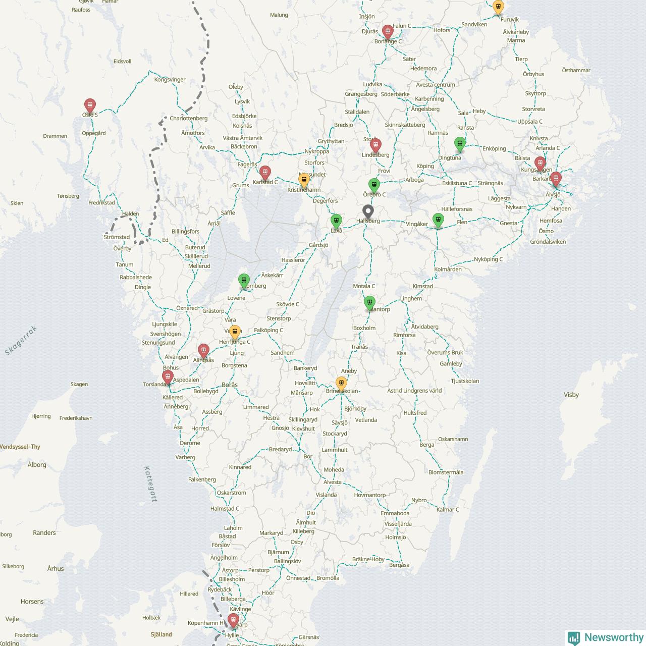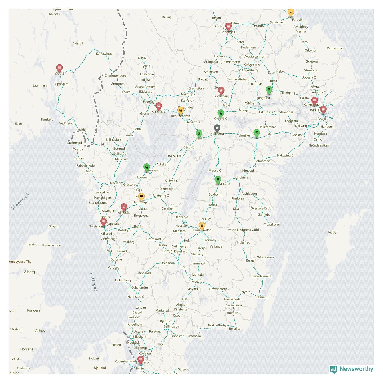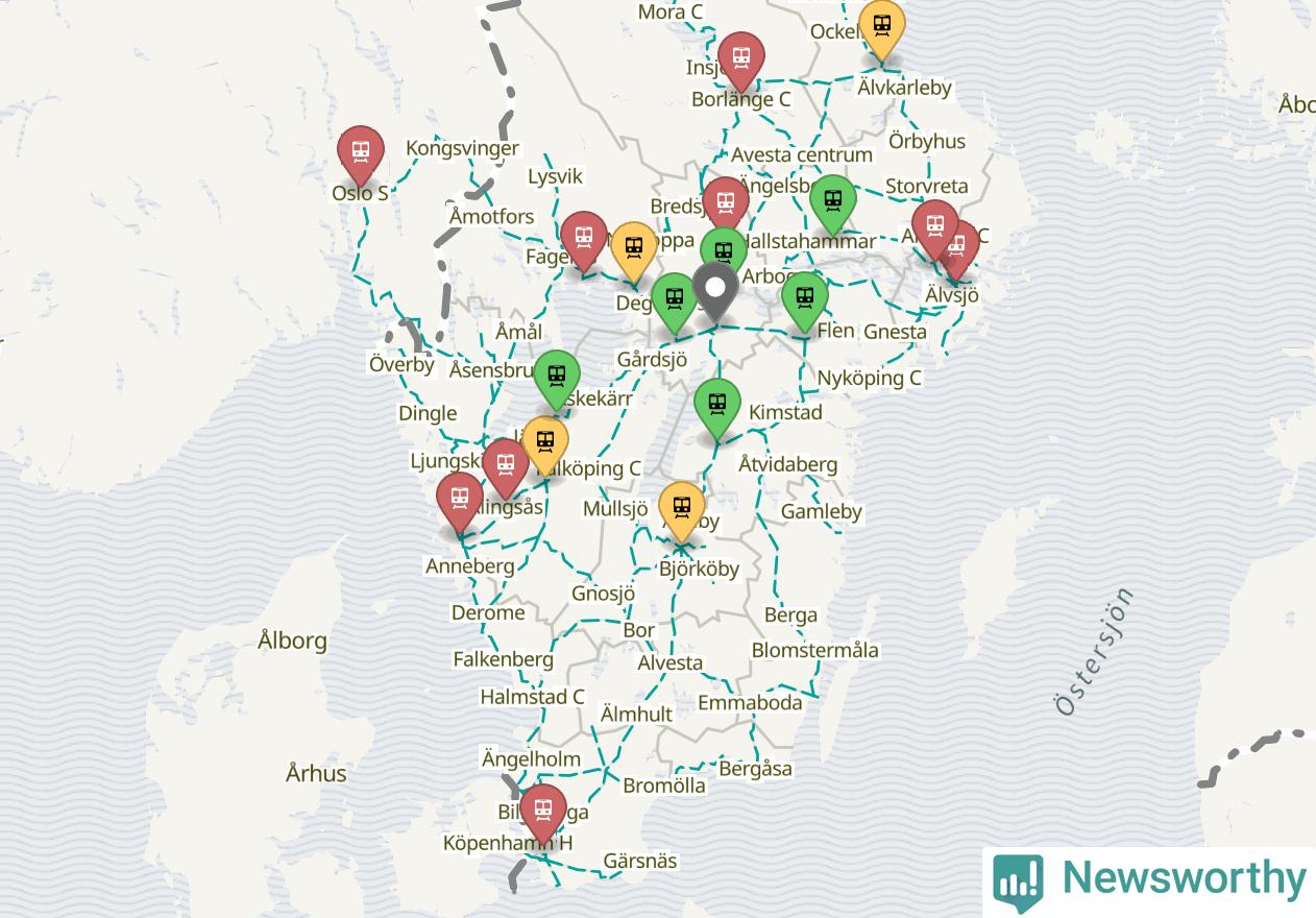 Kartdata från Mapbox, Newsworthy, OpenStreetMap och Trafikverket. Uppgifter om sträckor med passagerartrafik från jarnvag.net.