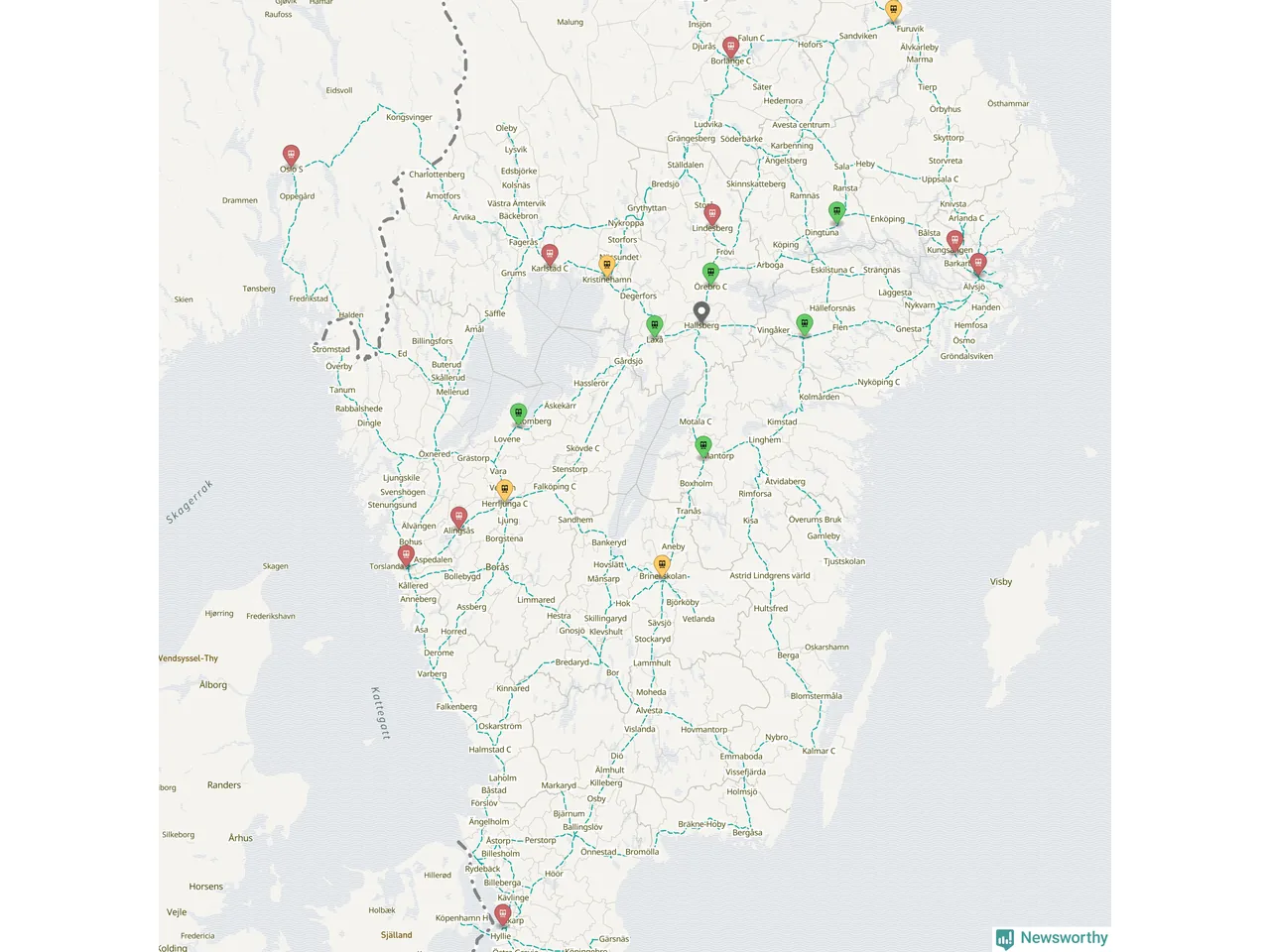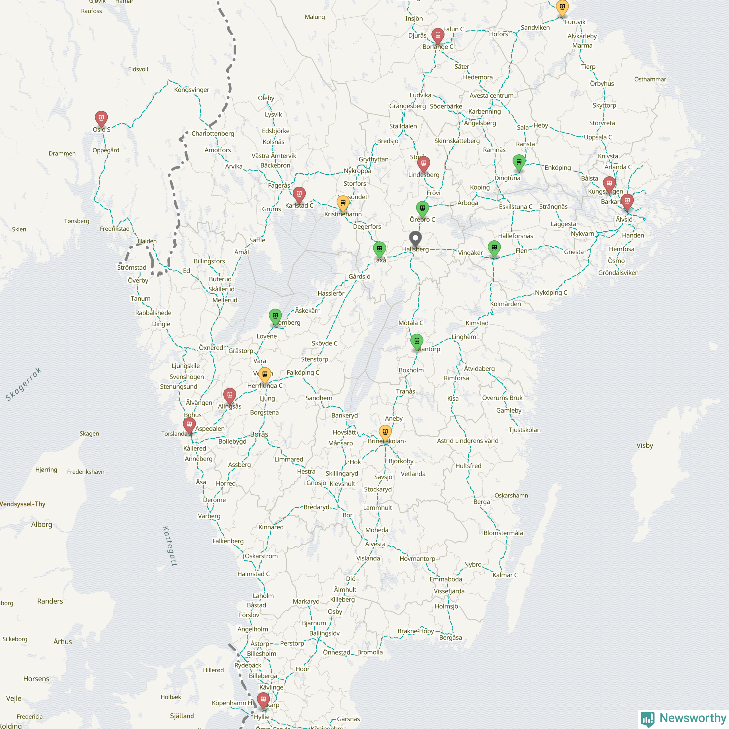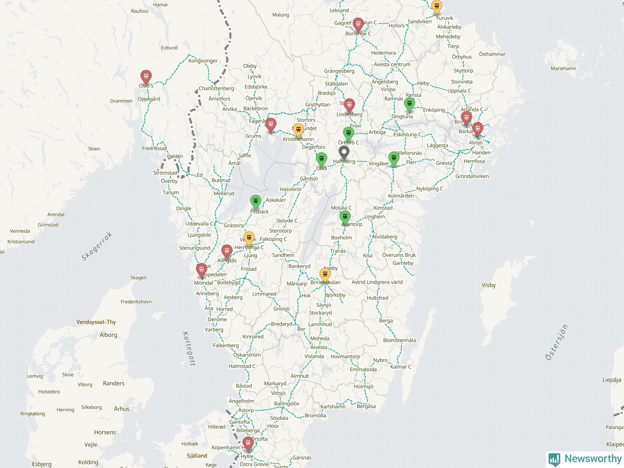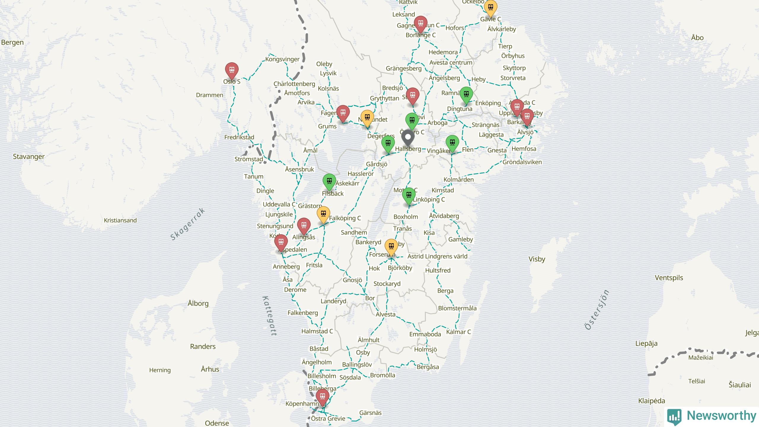 Kartdata från Mapbox, Newsworthy, OpenStreetMap och Trafikverket. Uppgifter om sträckor med passagerartrafik från jarnvag.net.