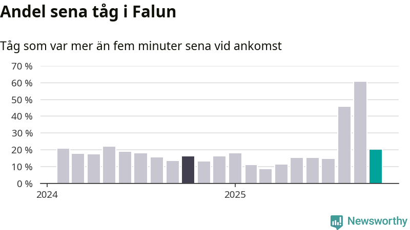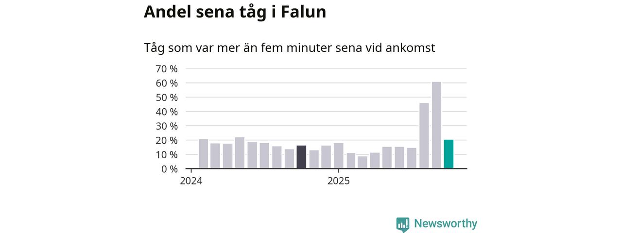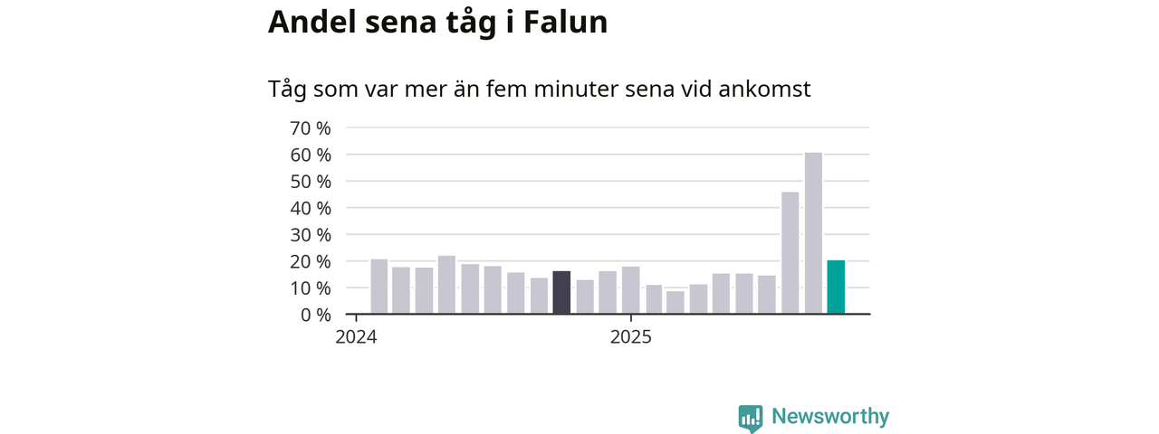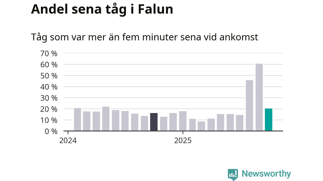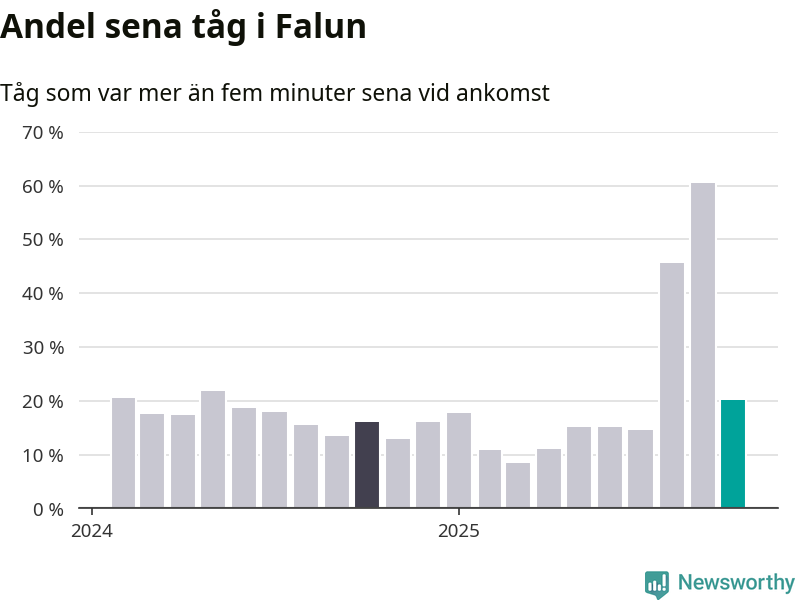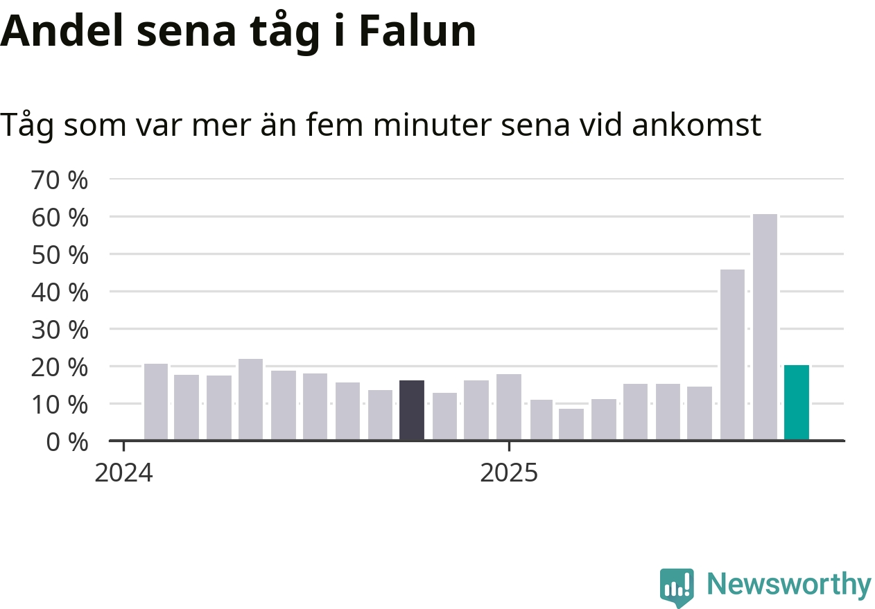 20 procent kan jämföras med 60 procent månaden innan, och 16 procent i oktober 2024. Siffrorna bygger på realtidsinformation om tågavgångar och ankomster från Trafikverket, som Newsworthy löpande samlar in.