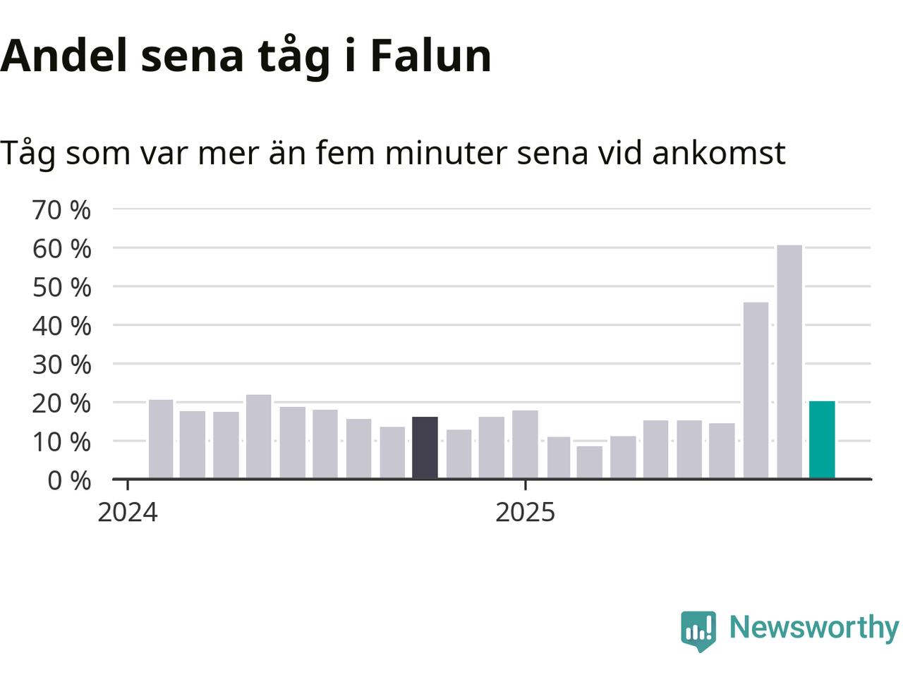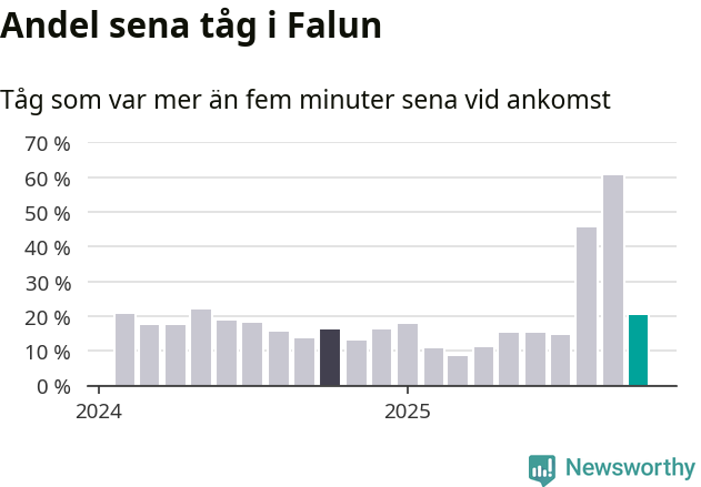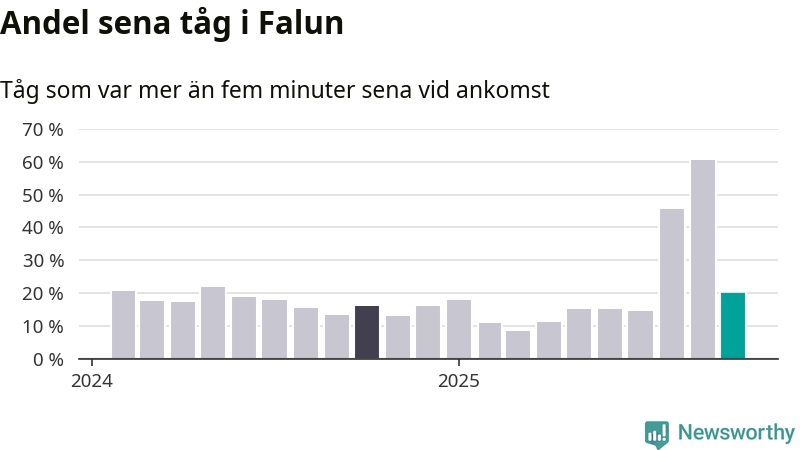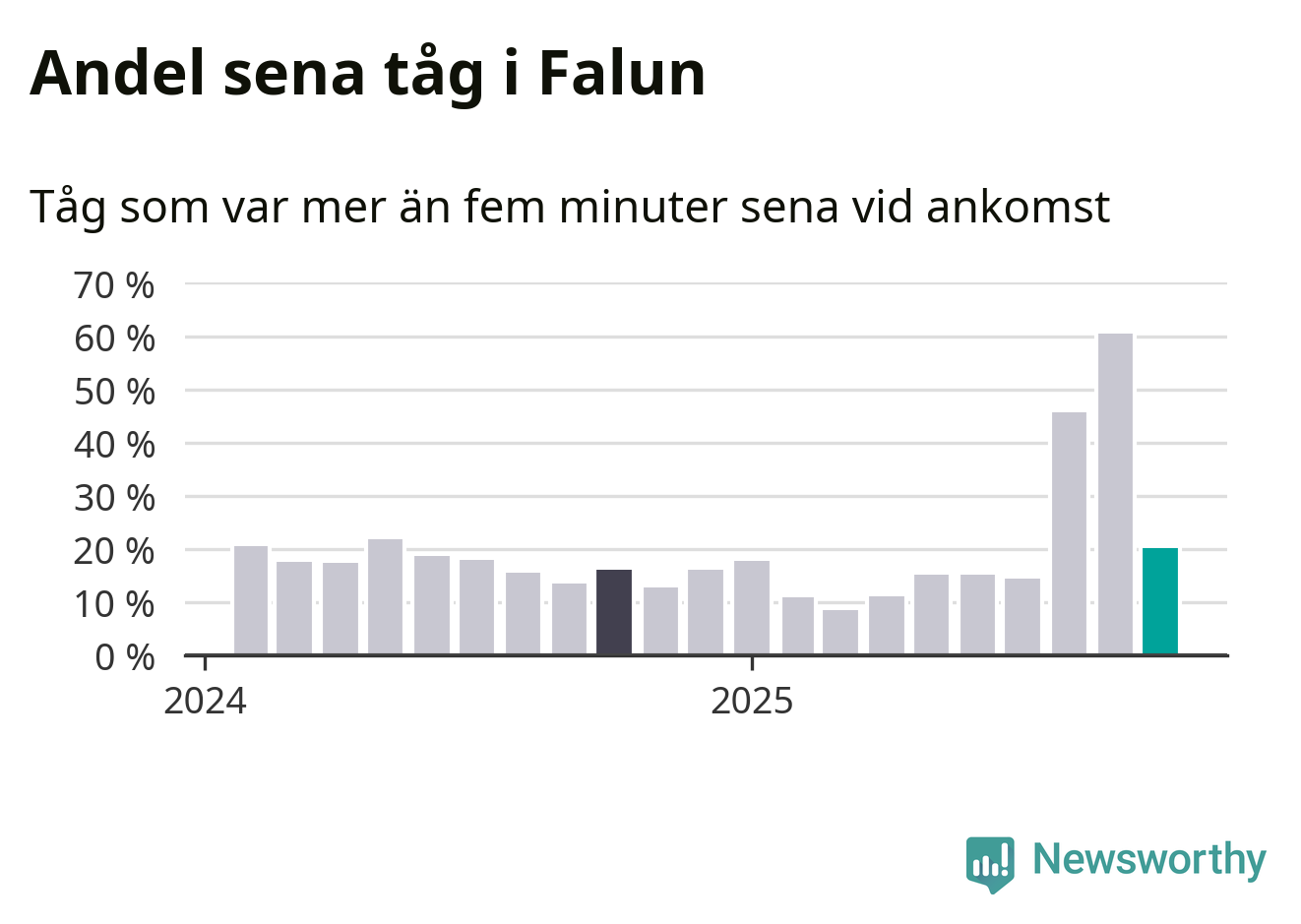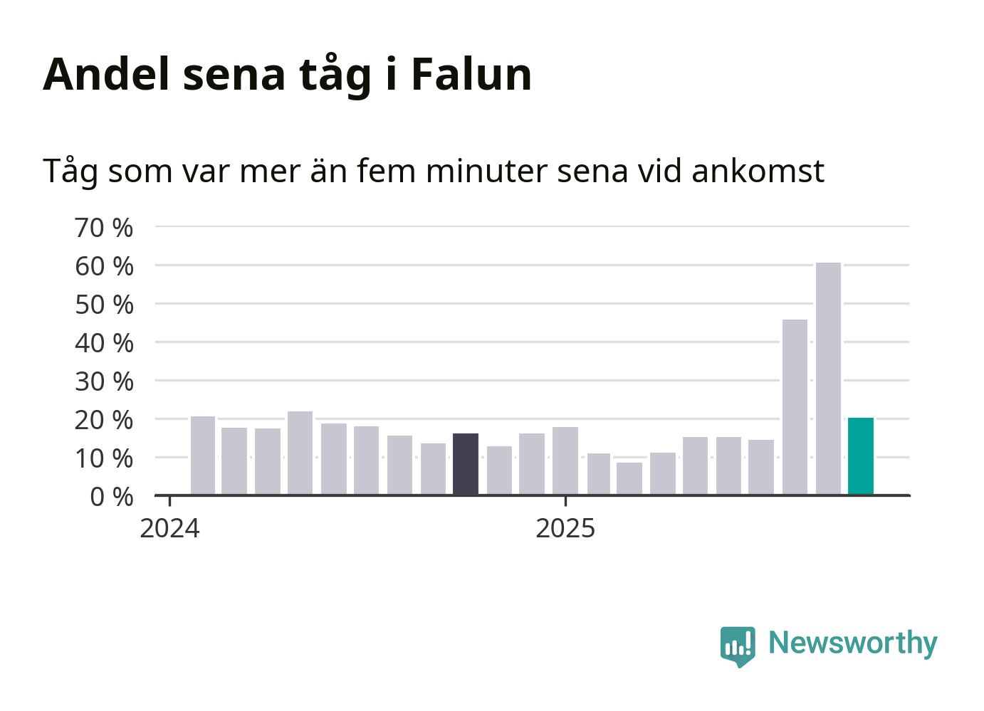 20 procent kan jämföras med 60 procent månaden innan, och 16 procent i oktober 2024. Siffrorna bygger på realtidsinformation om tågavgångar och ankomster från Trafikverket, som Newsworthy löpande samlar in.