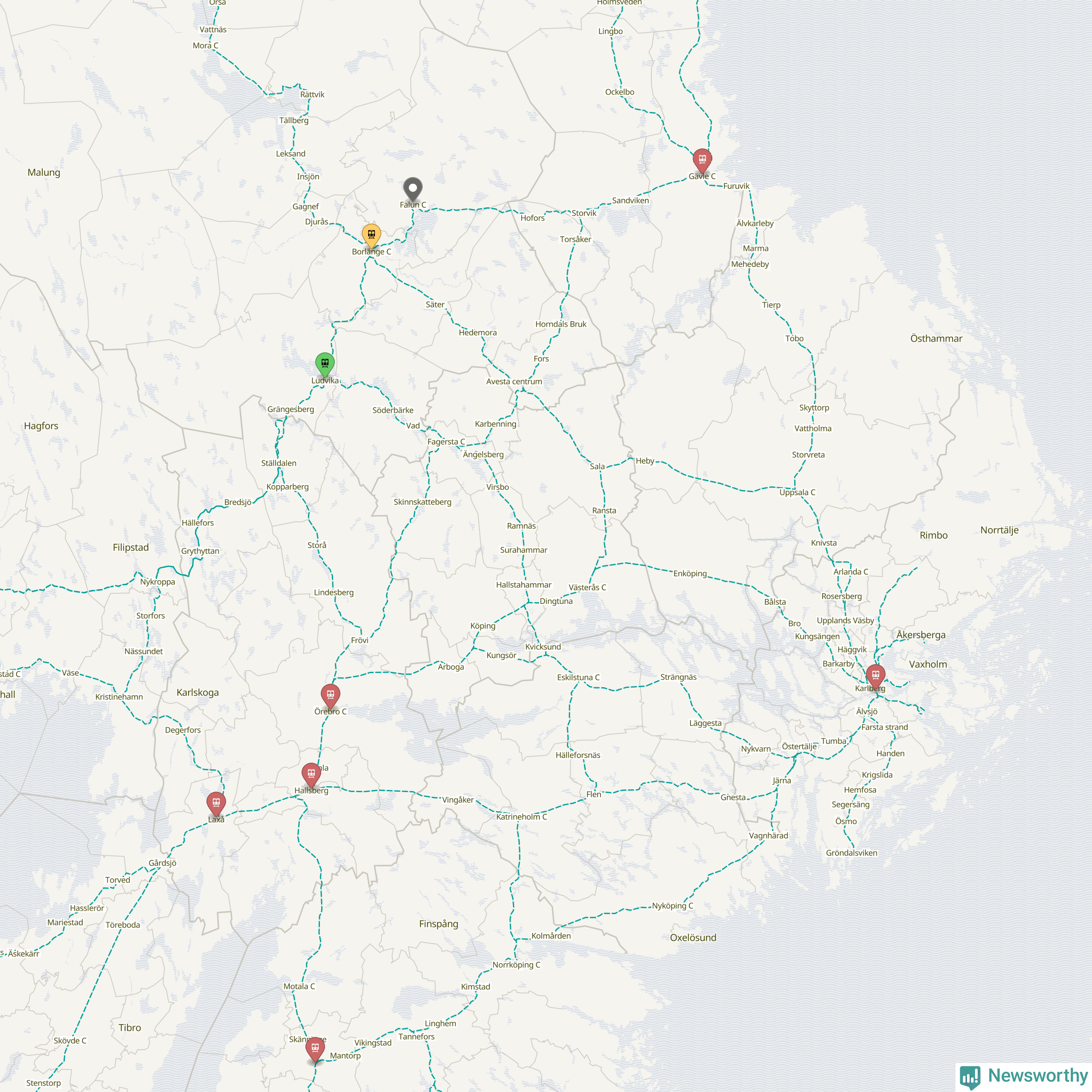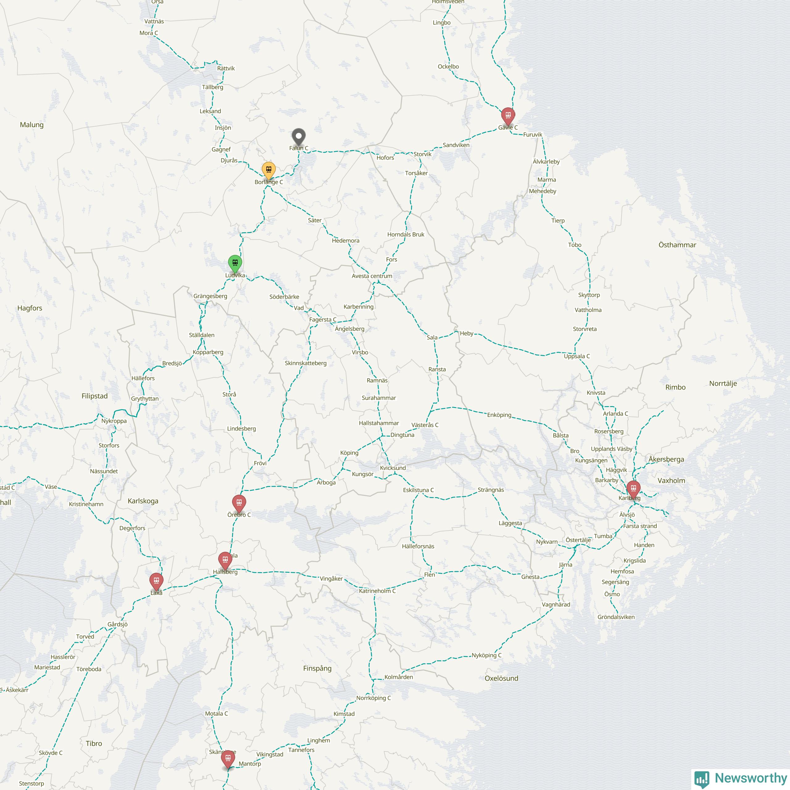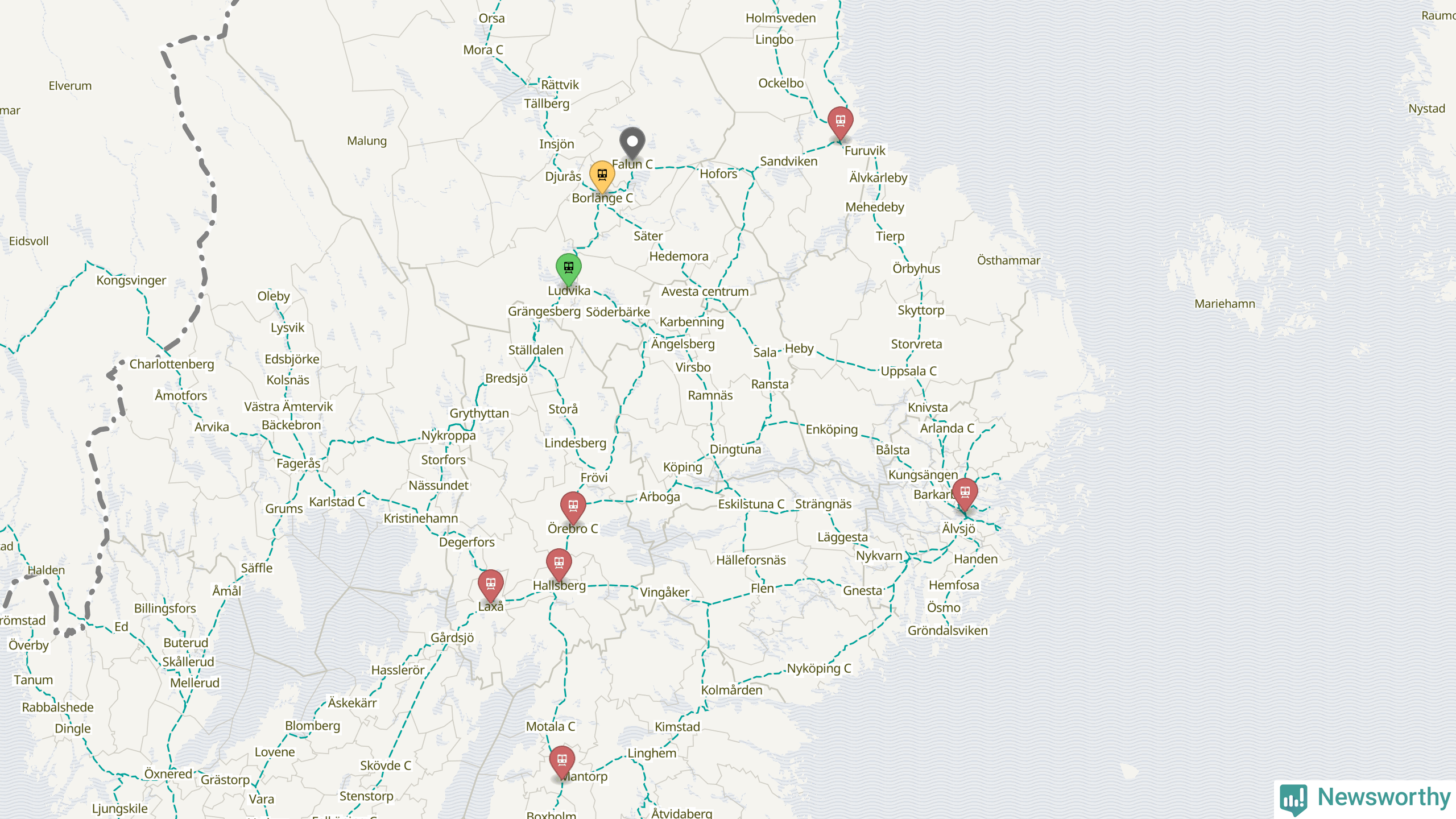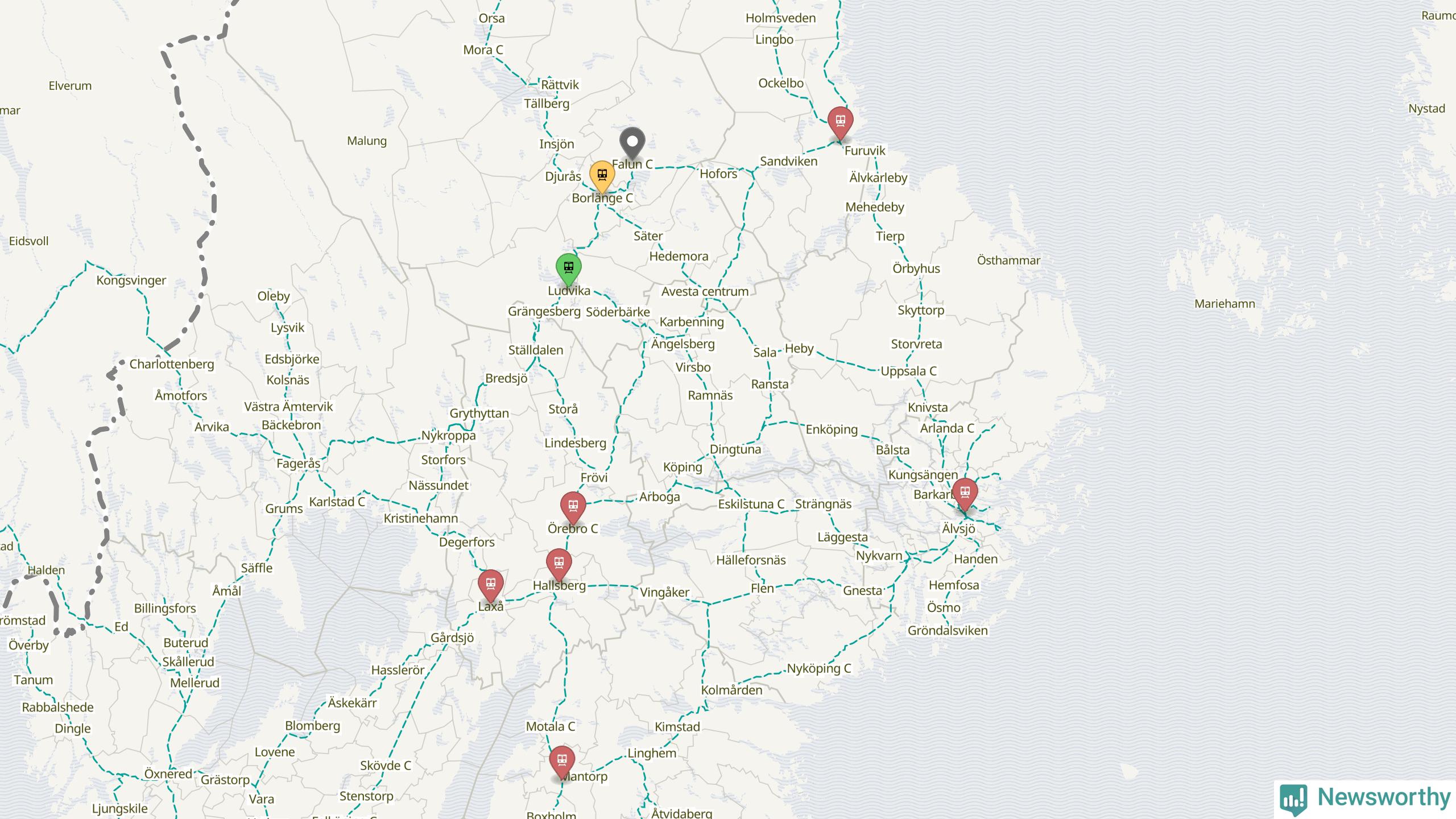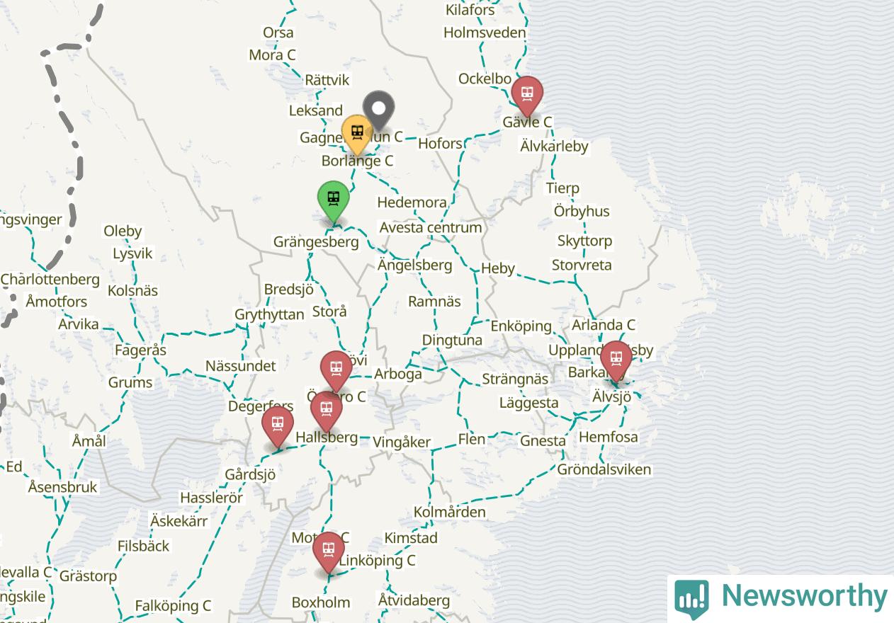 Kartdata från Mapbox, Newsworthy, OpenStreetMap och Trafikverket. Uppgifter om sträckor med passagerartrafik från jarnvag.net.