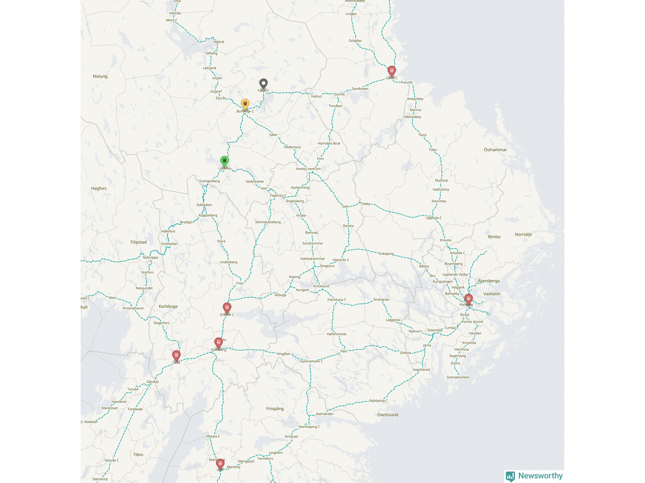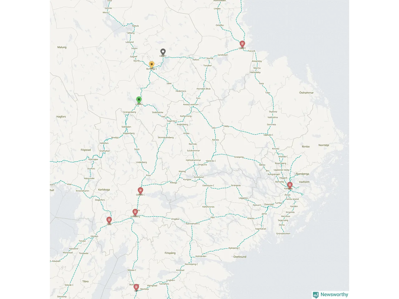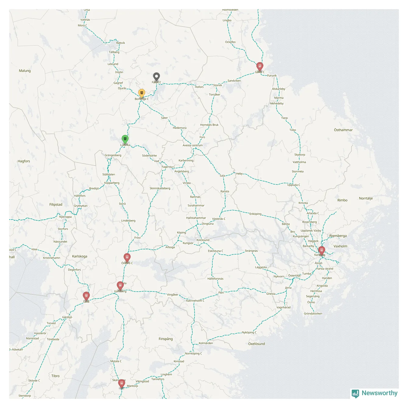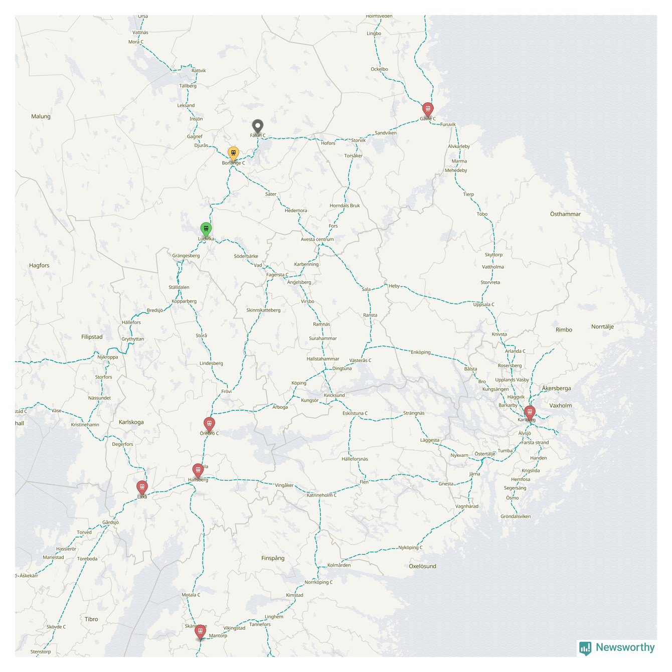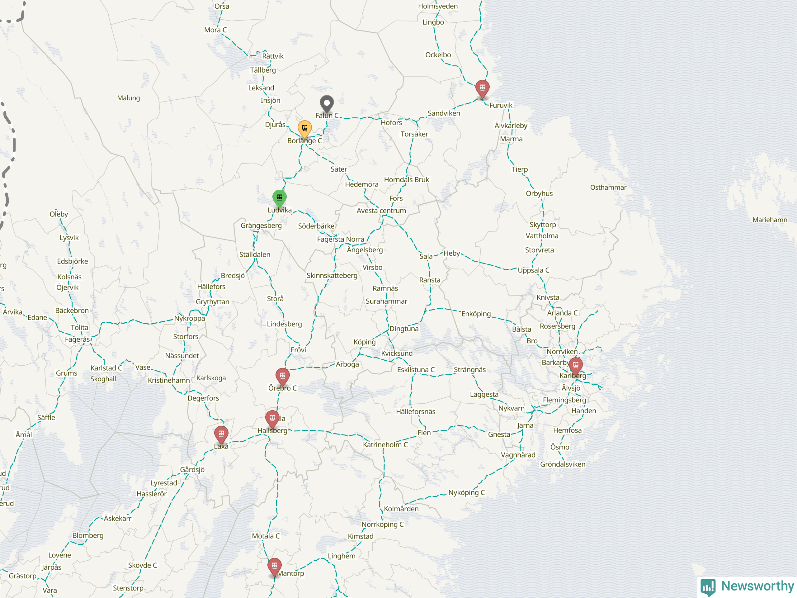 Kartdata från Mapbox, Newsworthy, OpenStreetMap och Trafikverket. Uppgifter om sträckor med passagerartrafik från jarnvag.net.