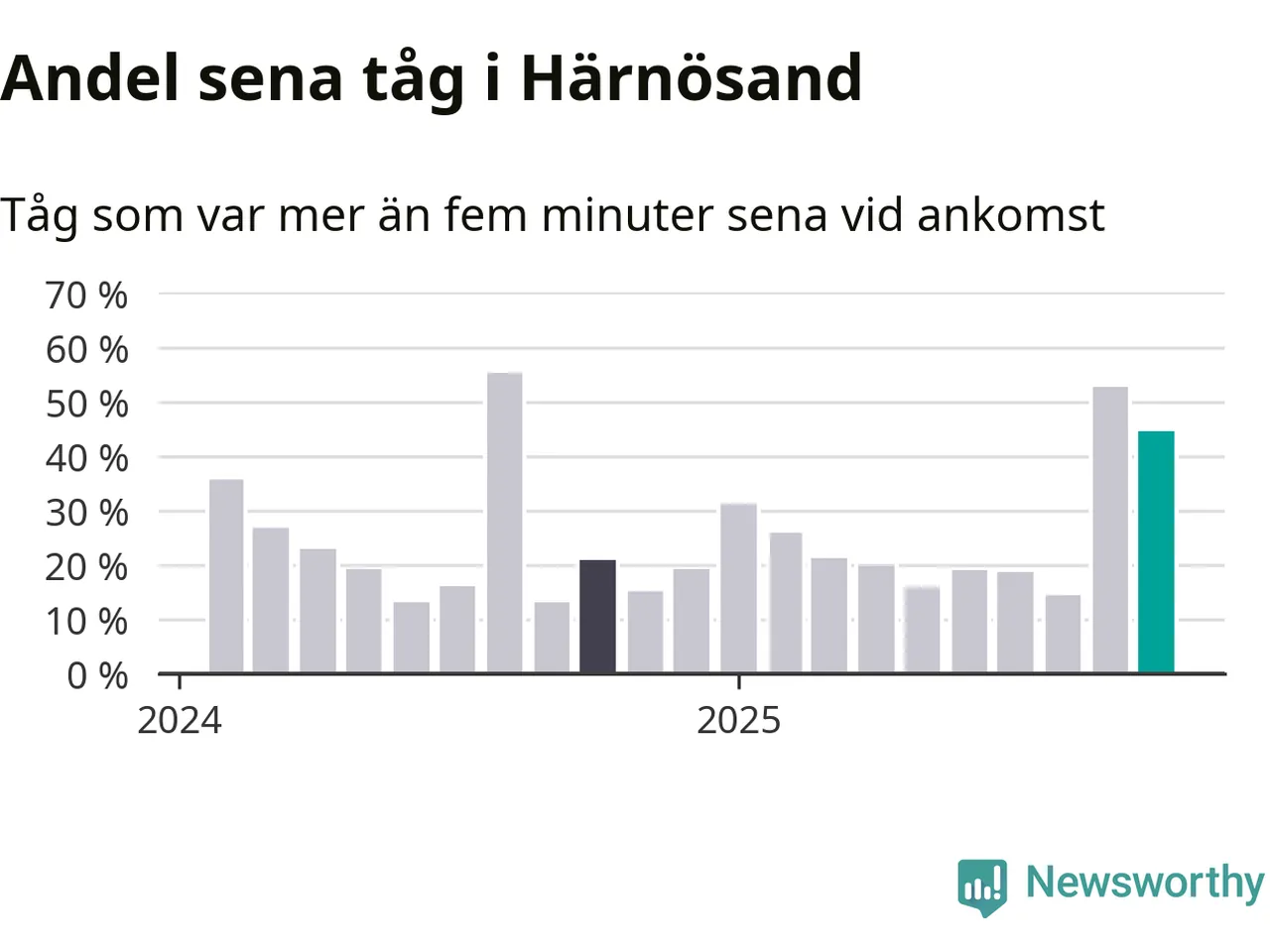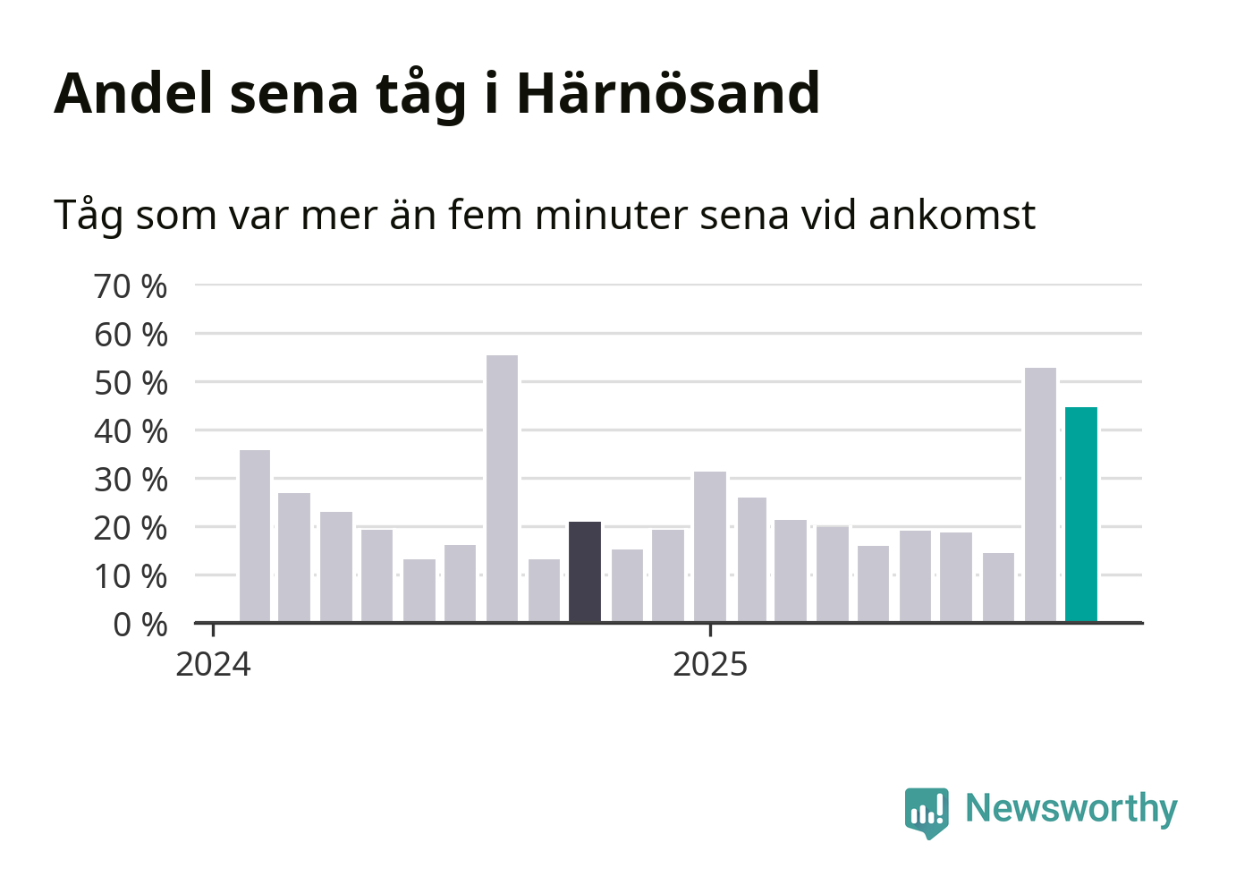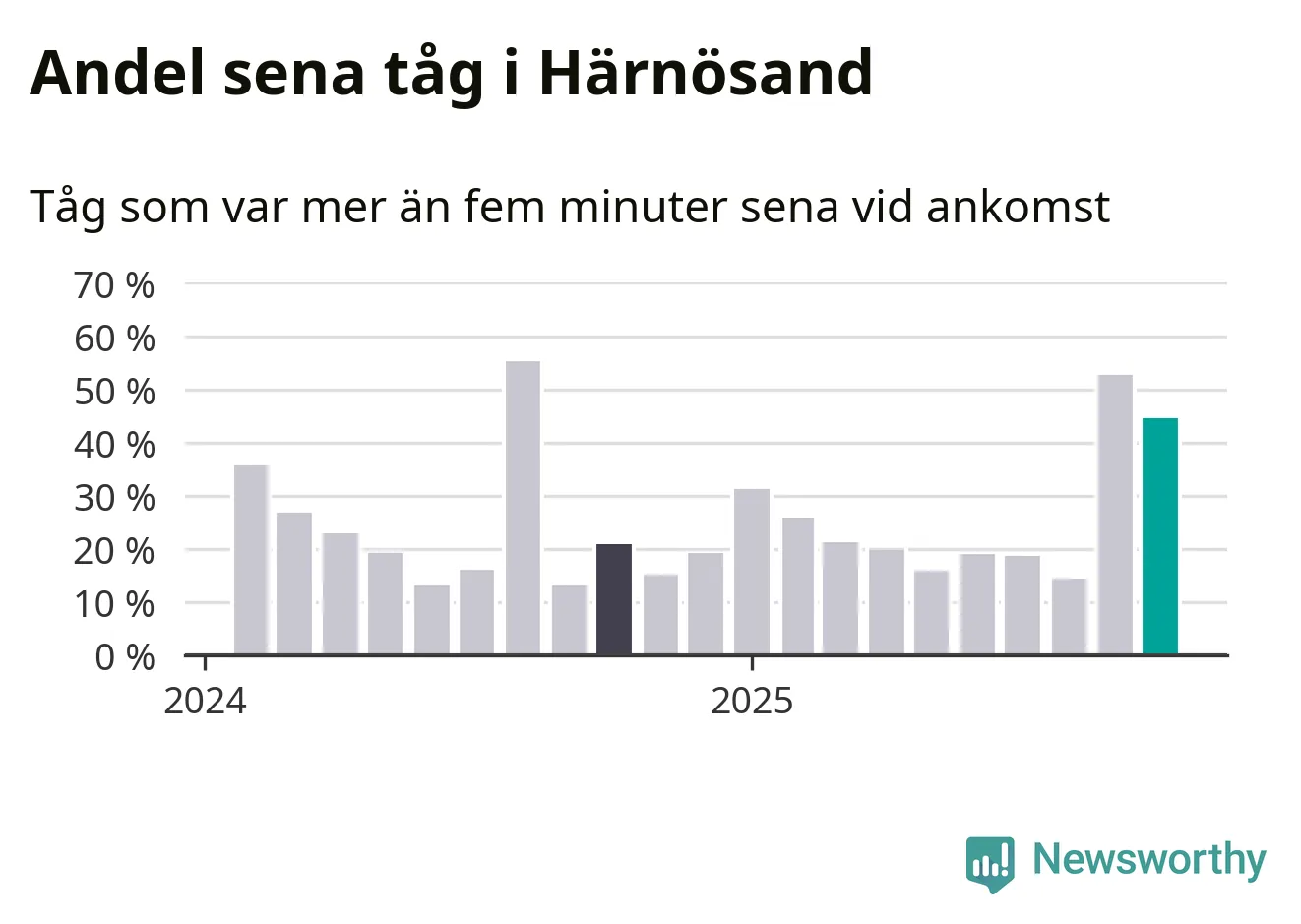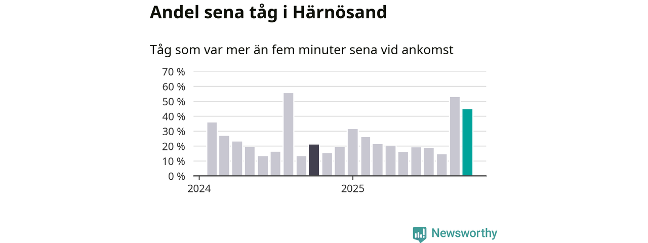 45 procent kan jämföras med 53 procent månaden innan, och 21 procent i oktober 2024. Siffrorna bygger på realtidsinformation om tågavgångar och ankomster från Trafikverket, som Newsworthy löpande samlar in.