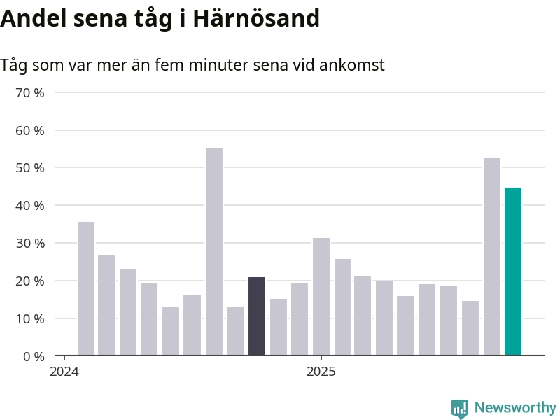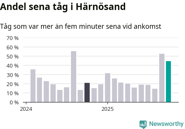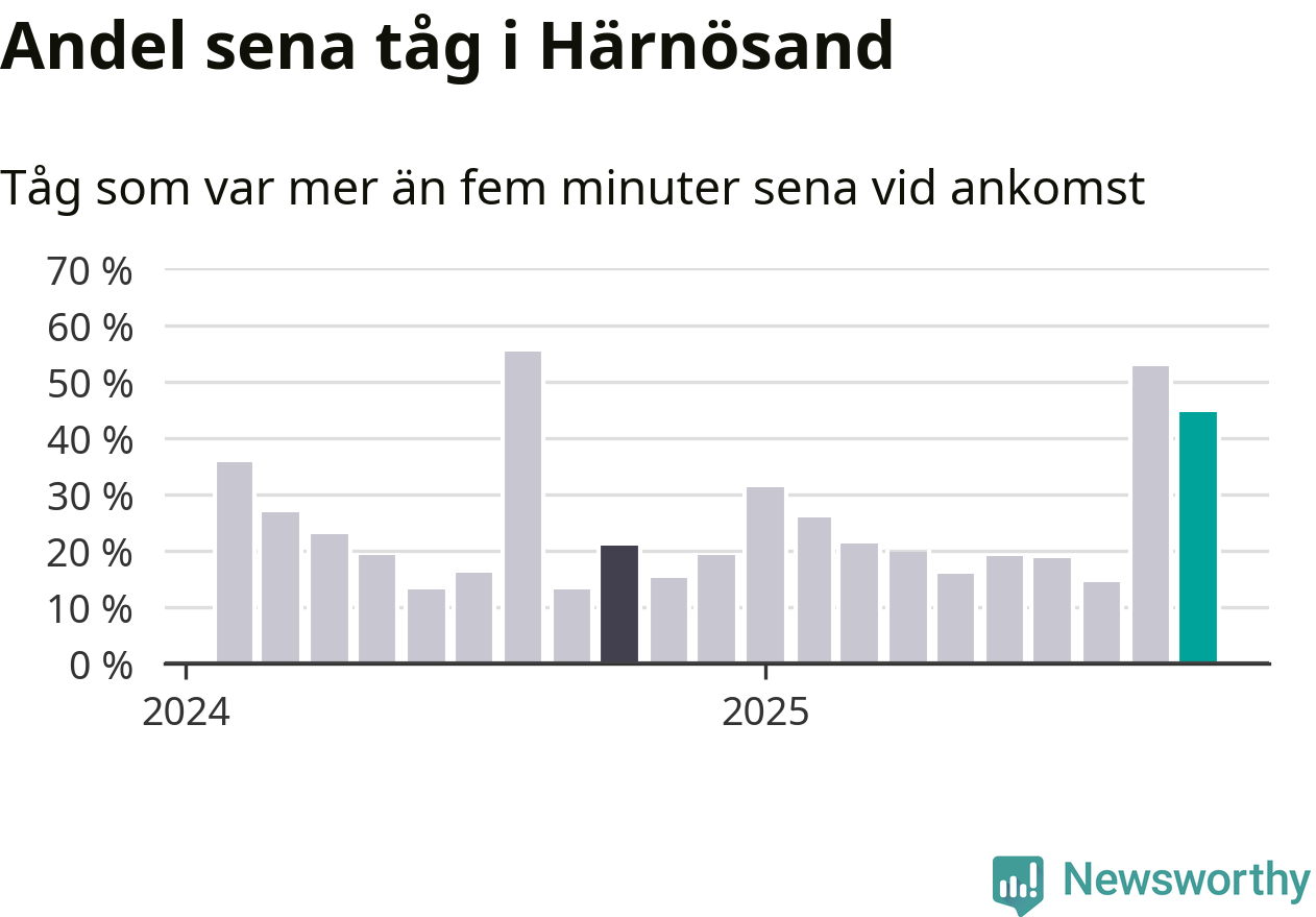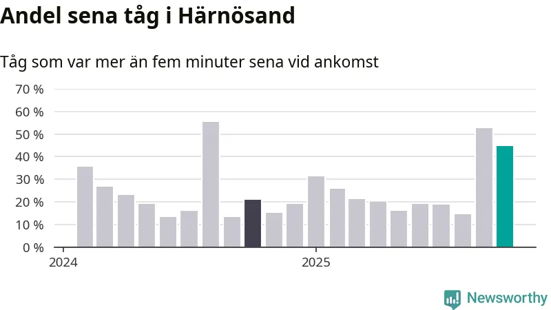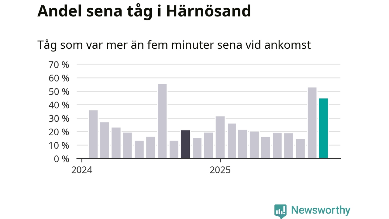 45 procent kan jämföras med 53 procent månaden innan, och 21 procent i oktober 2024. Siffrorna bygger på realtidsinformation om tågavgångar och ankomster från Trafikverket, som Newsworthy löpande samlar in.
