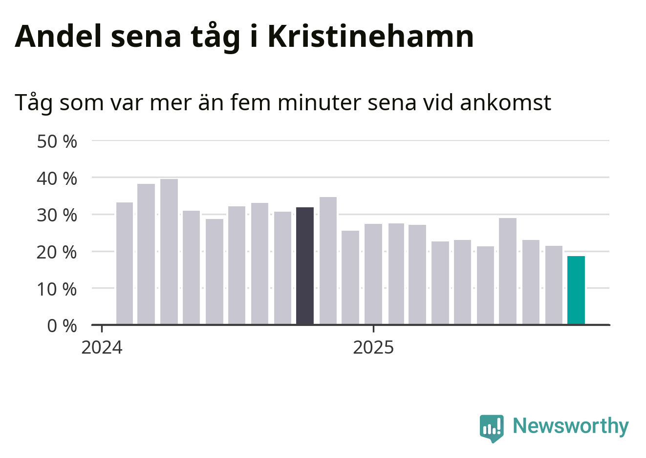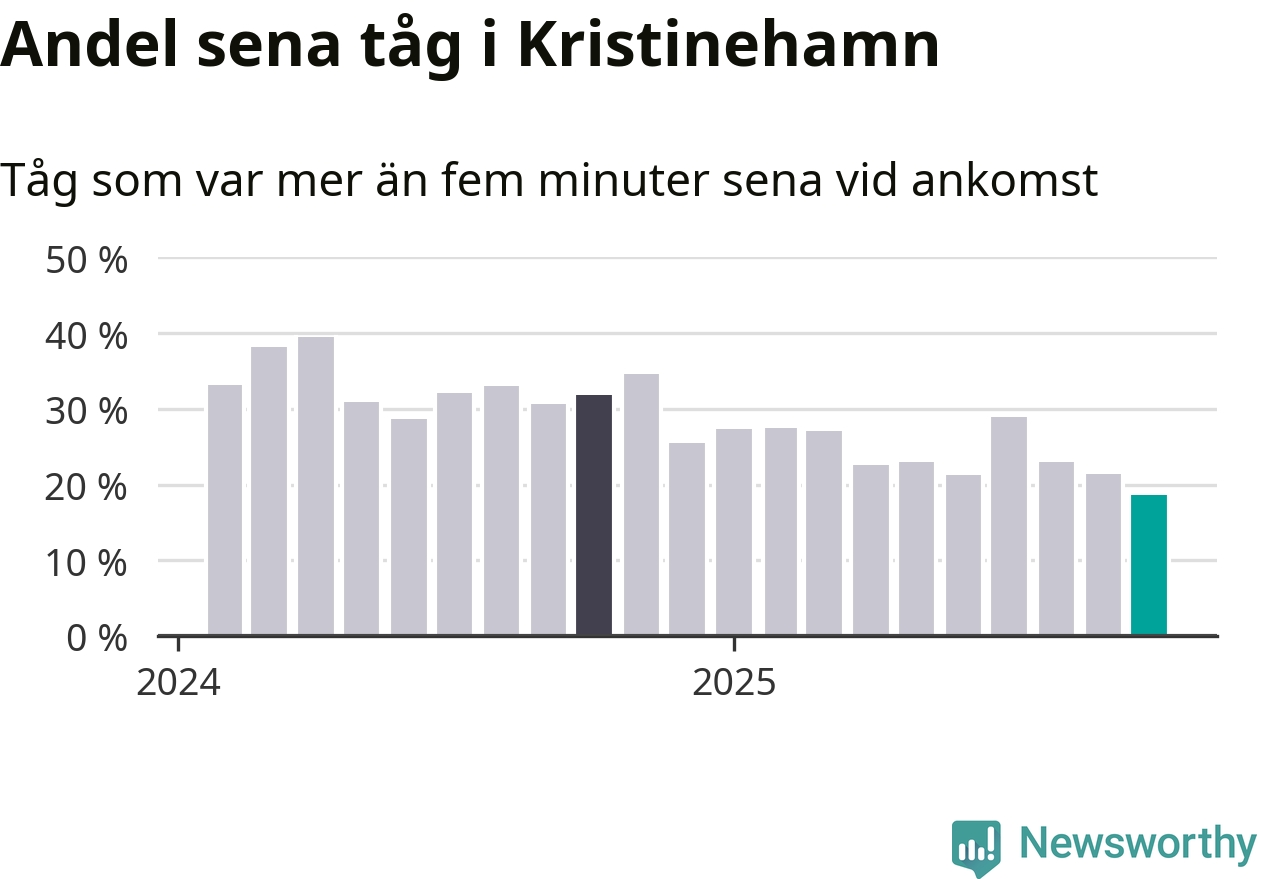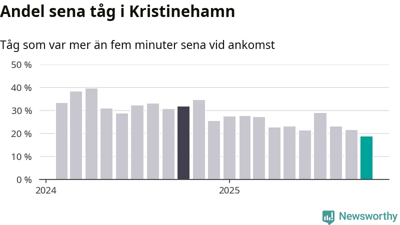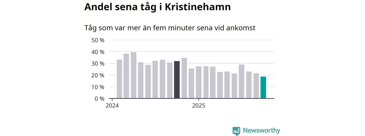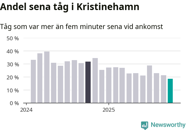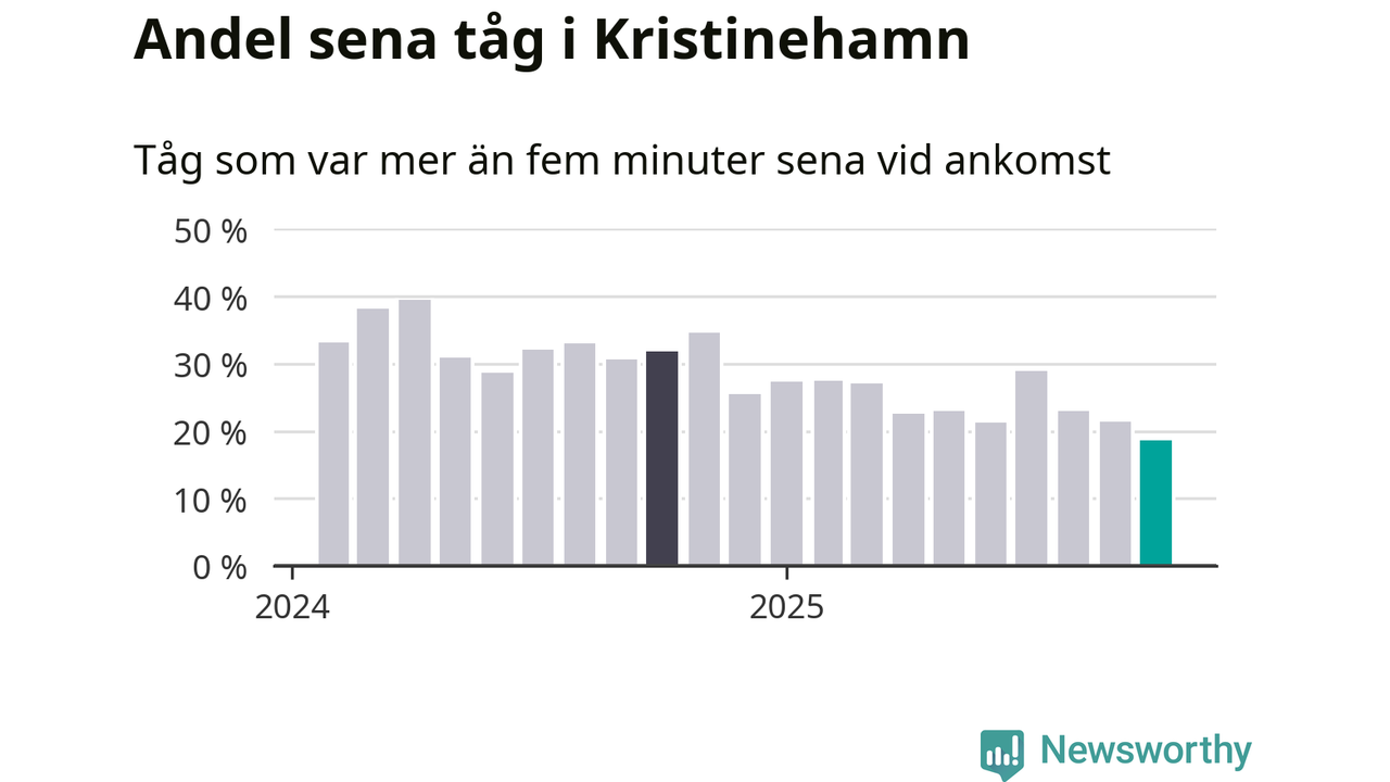 19 procent är den lägsta andelen sena tåg sedan Newsworthy började mäta lokala förseningar i början av 2024. Siffrorna bygger på realtidsinformation om tågavgångar och ankomster från Trafikverket, som Newsworthy löpande samlar in.