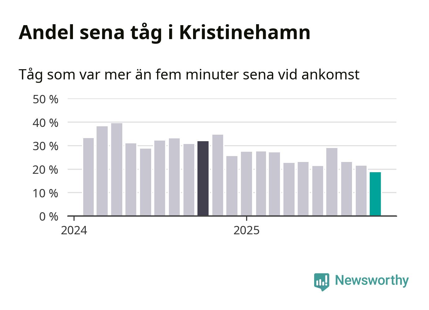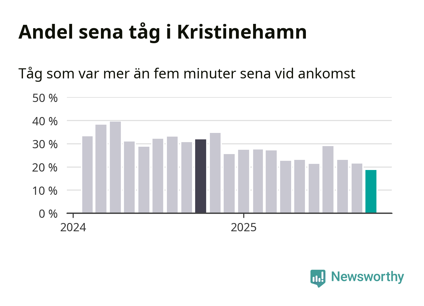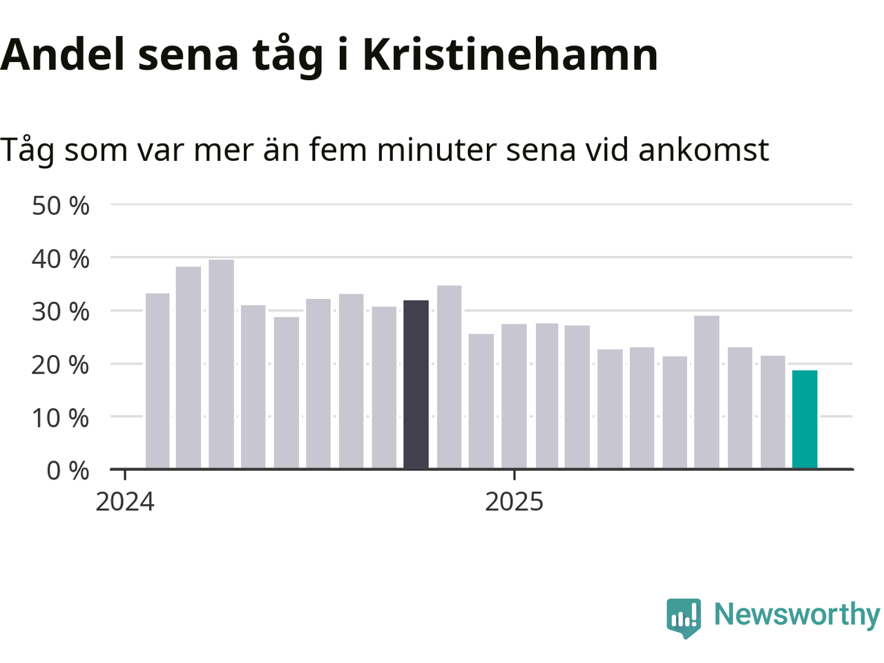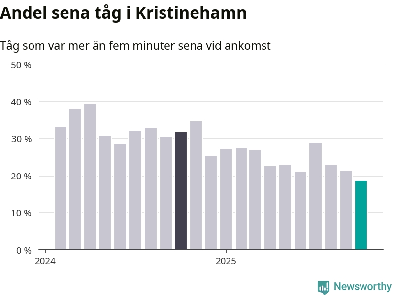 19 procent är den lägsta andelen sena tåg sedan Newsworthy började mäta lokala förseningar i början av 2024. Siffrorna bygger på realtidsinformation om tågavgångar och ankomster från Trafikverket, som Newsworthy löpande samlar in.