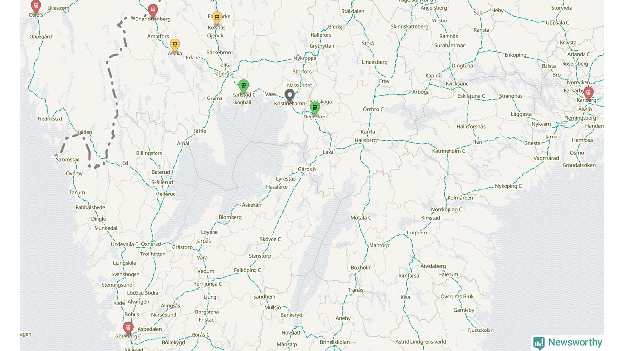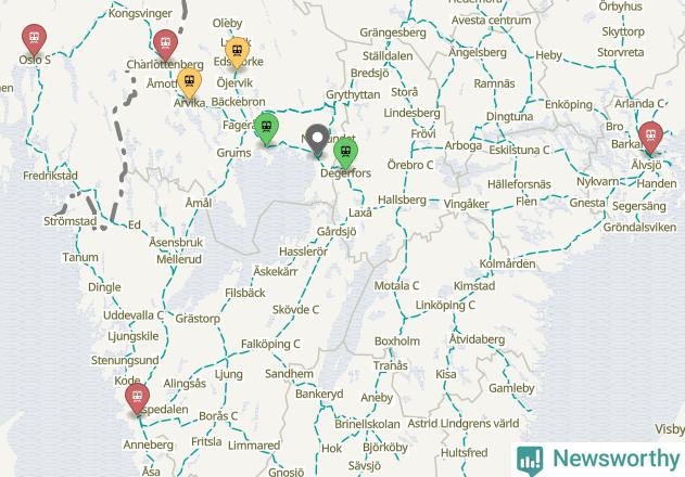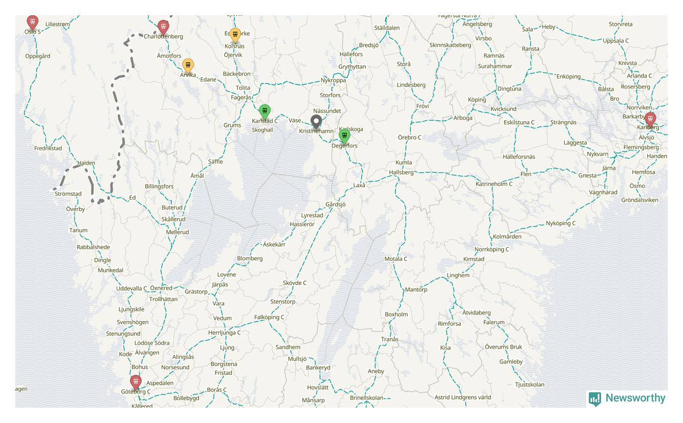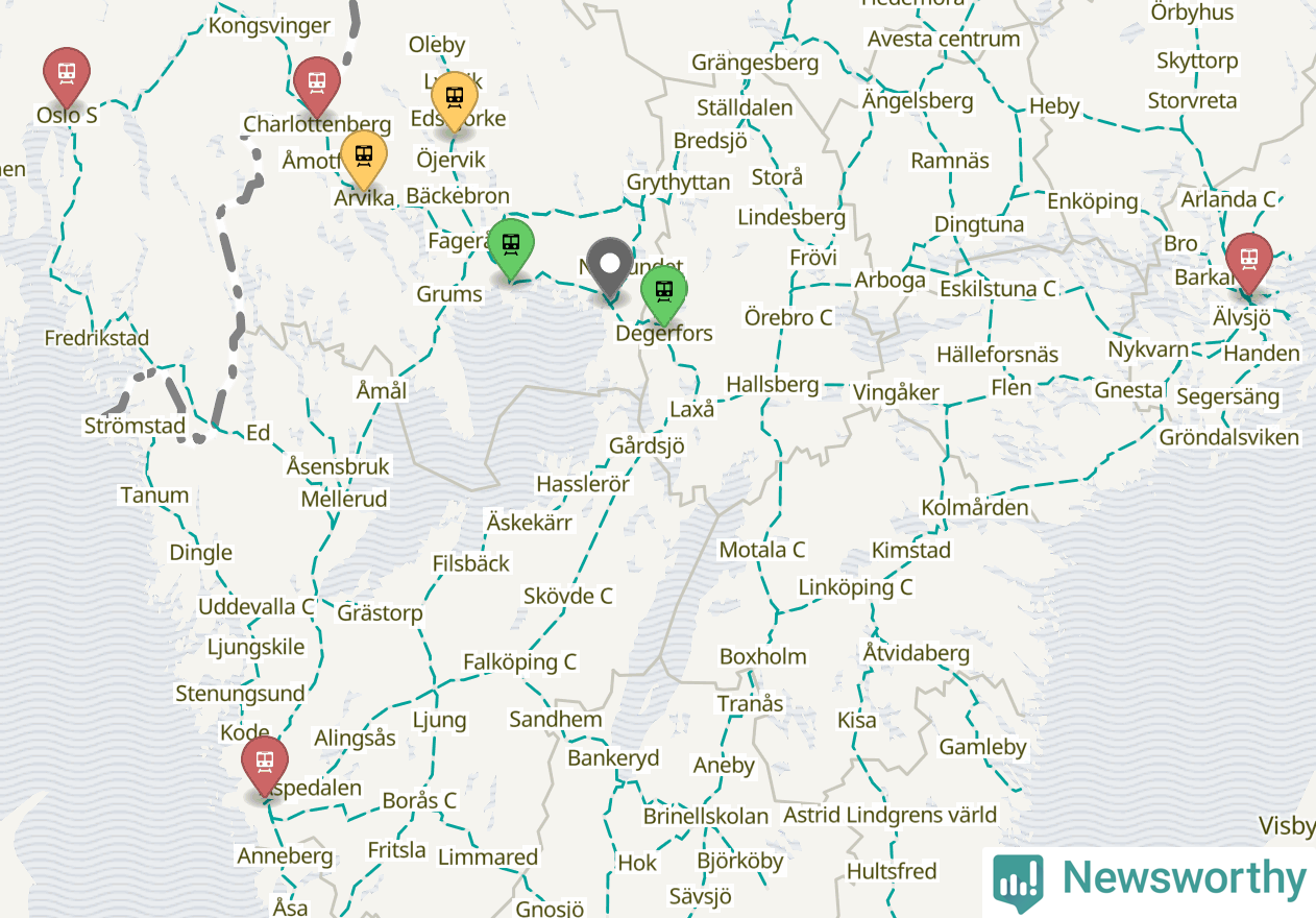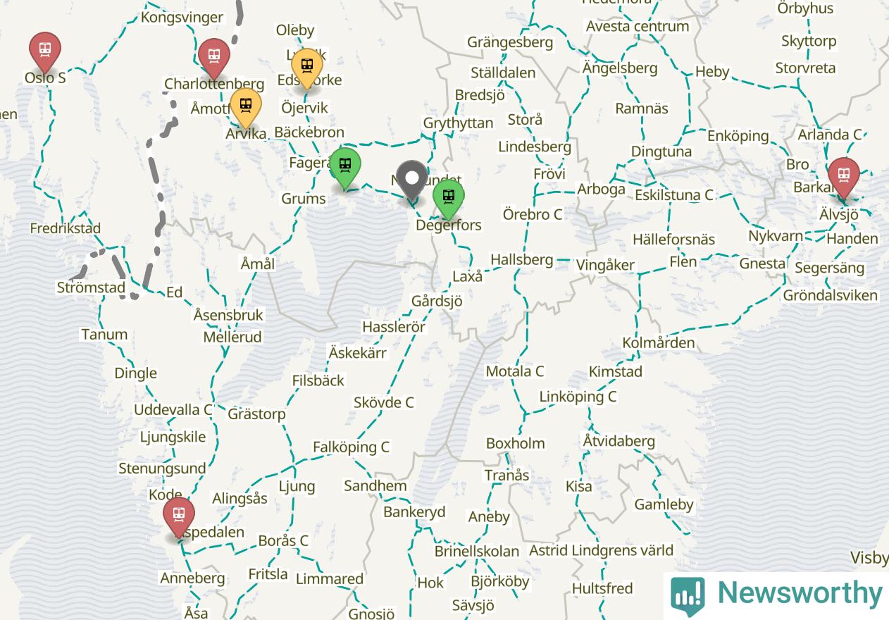 Kartdata från Mapbox, Newsworthy, OpenStreetMap och Trafikverket. Uppgifter om sträckor med passagerartrafik från jarnvag.net.