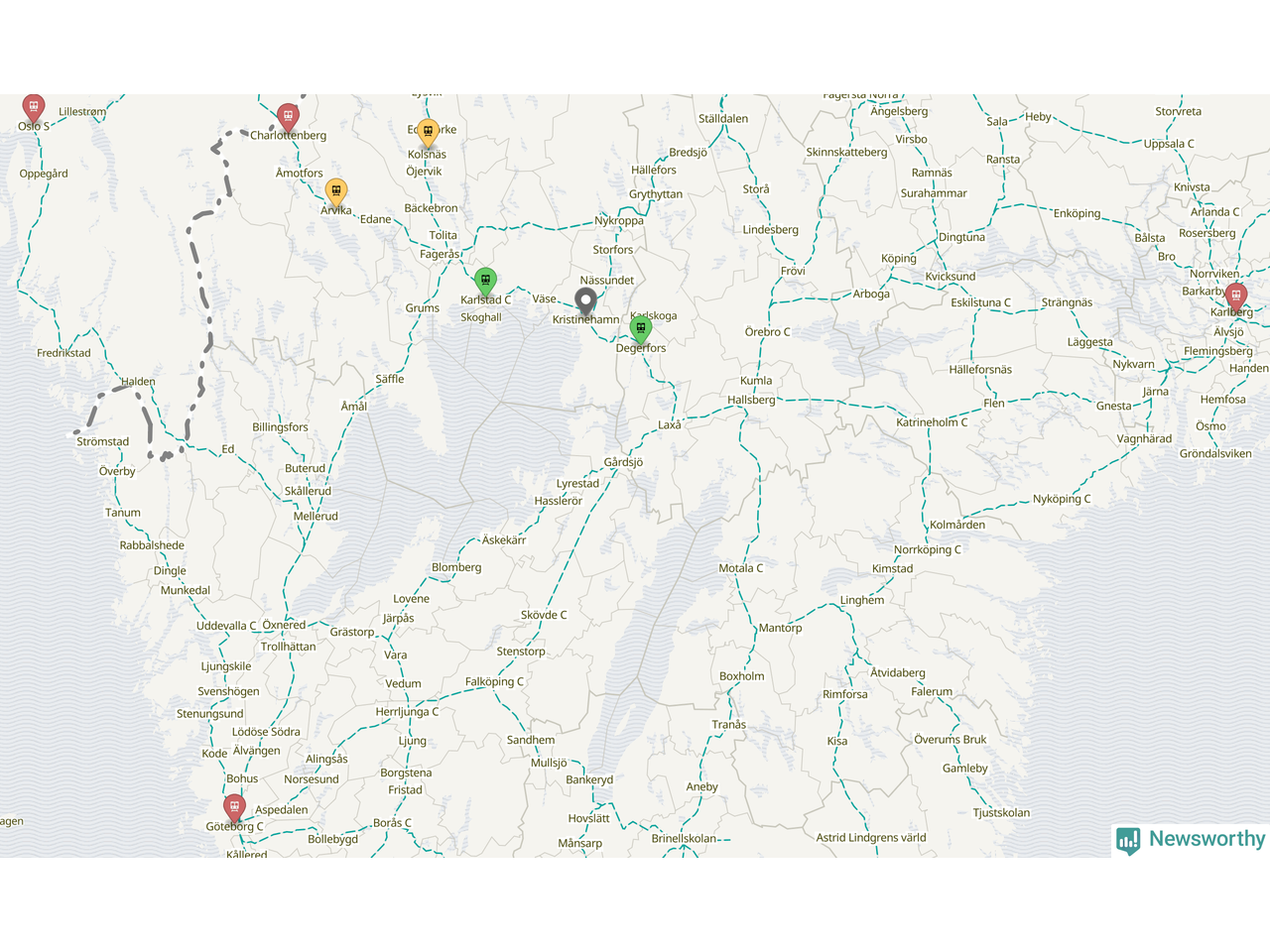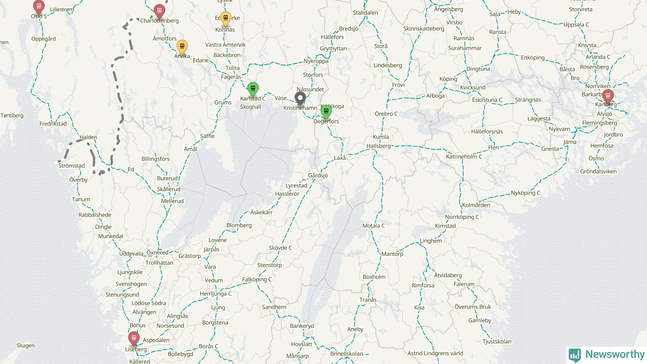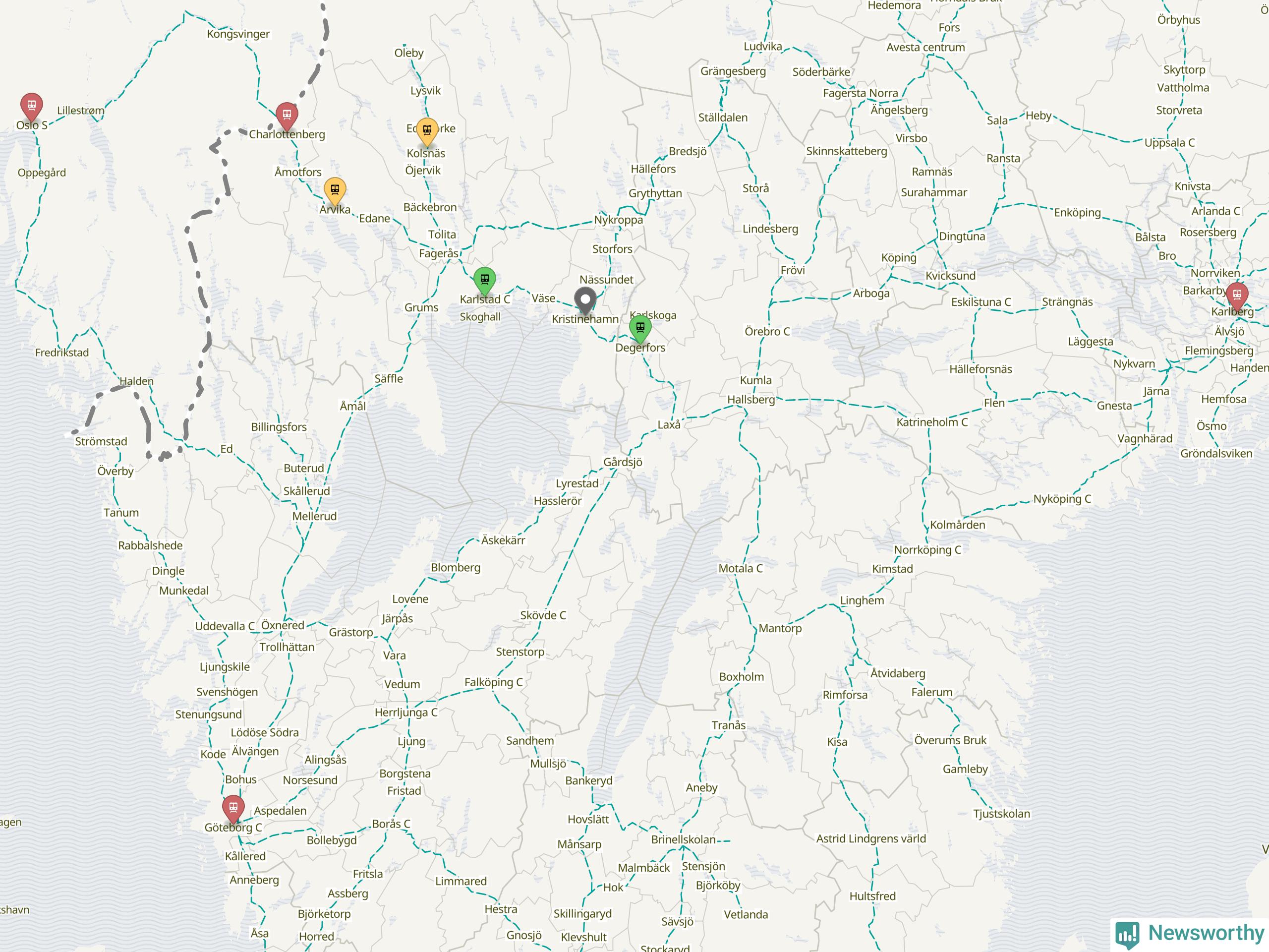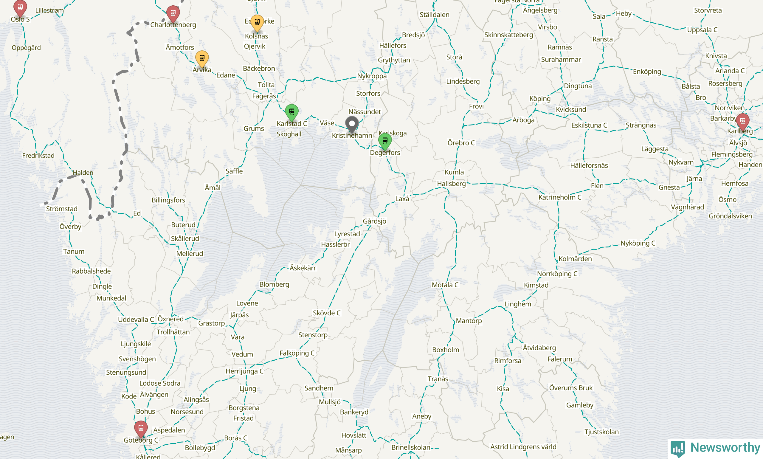 Kartdata från Mapbox, Newsworthy, OpenStreetMap och Trafikverket. Uppgifter om sträckor med passagerartrafik från jarnvag.net.