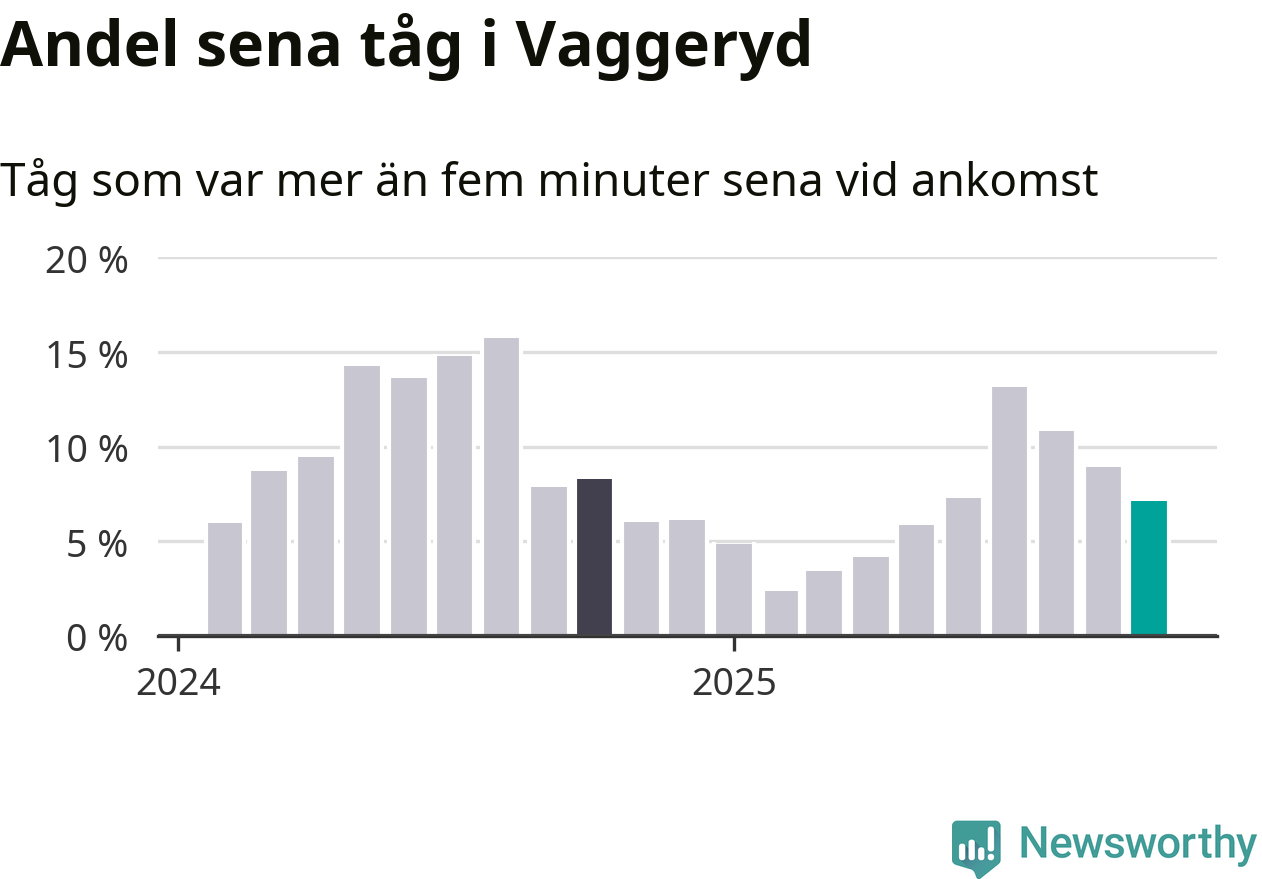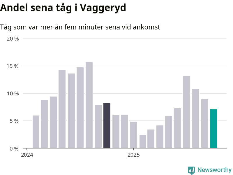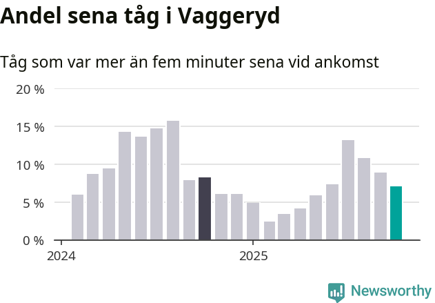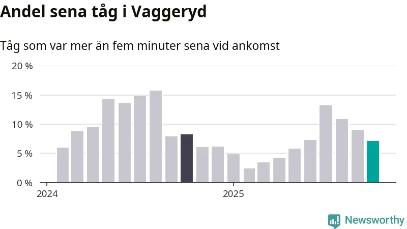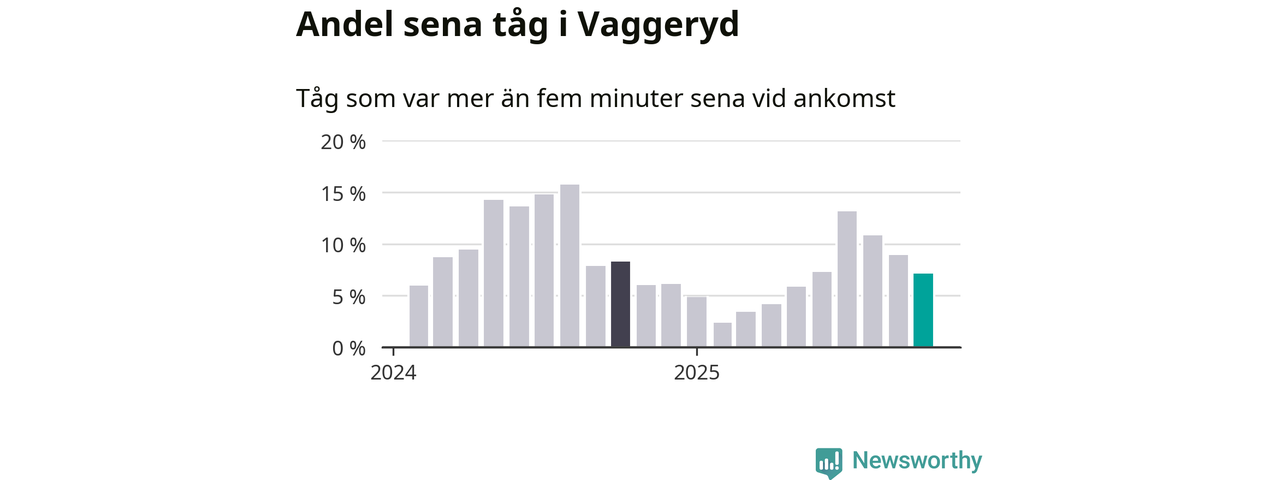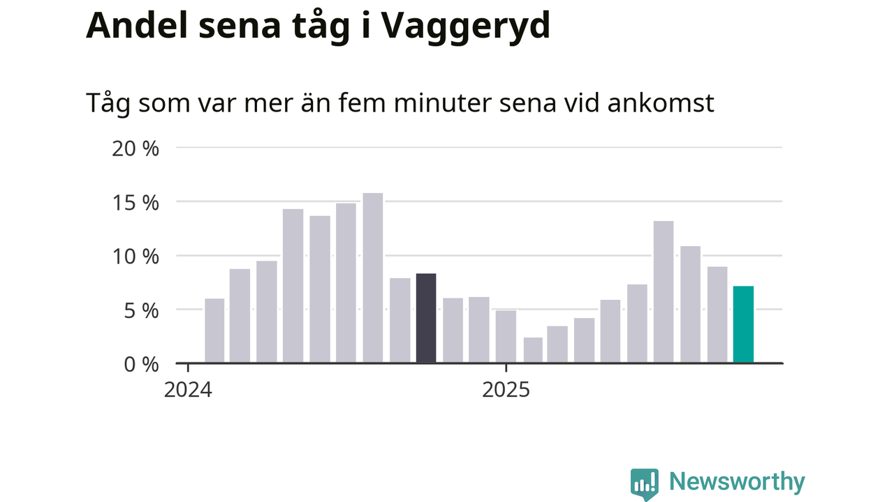 Sju procent kan jämföras med nio procent månaden innan, och åtta procent i oktober 2024. Oktober är den tredje månaden i rad med minskande förseningar i Vaggeryd. Siffrorna bygger på realtidsinformation om tågavgångar och ankomster från Trafikverket, som Newsworthy löpande samlar in.