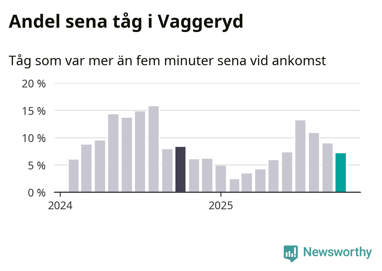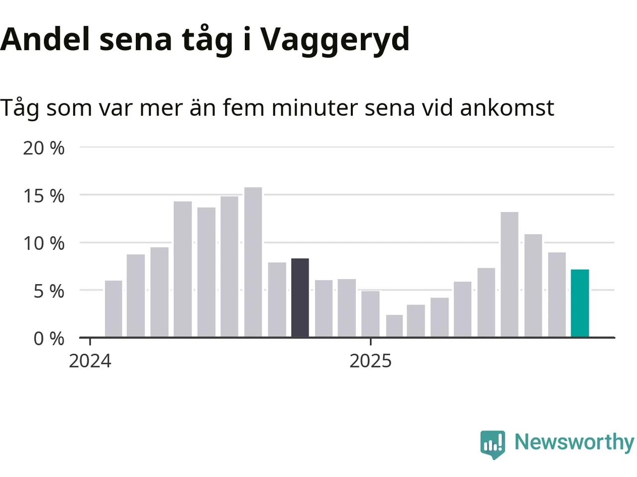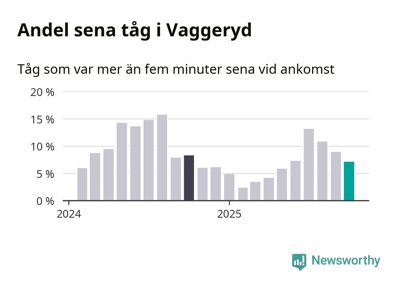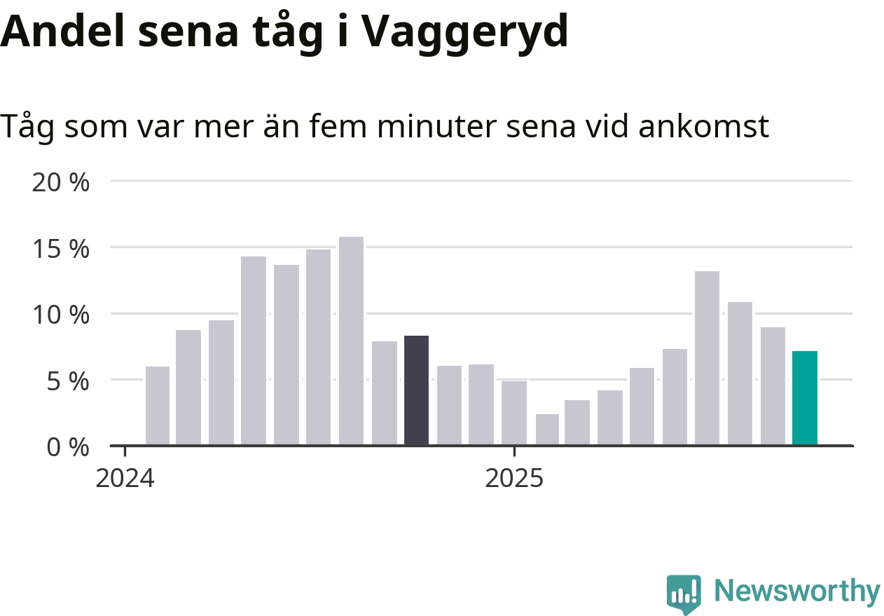 Sju procent kan jämföras med nio procent månaden innan, och åtta procent i oktober 2024. Oktober är den tredje månaden i rad med minskande förseningar i Vaggeryd. Siffrorna bygger på realtidsinformation om tågavgångar och ankomster från Trafikverket, som Newsworthy löpande samlar in.