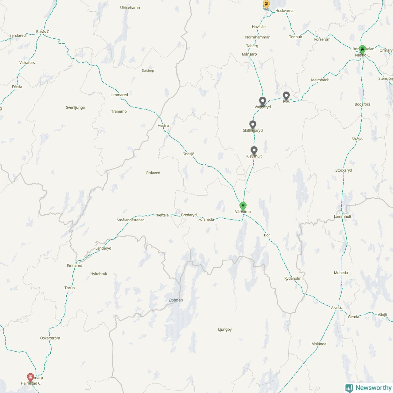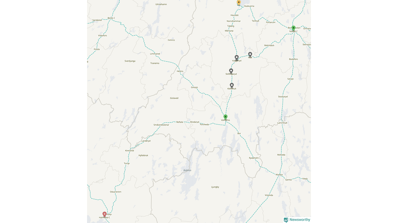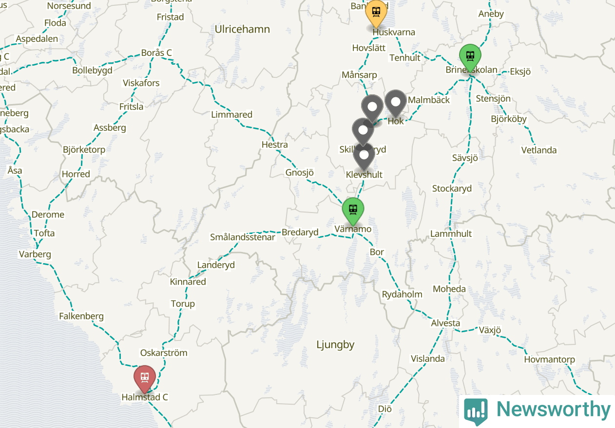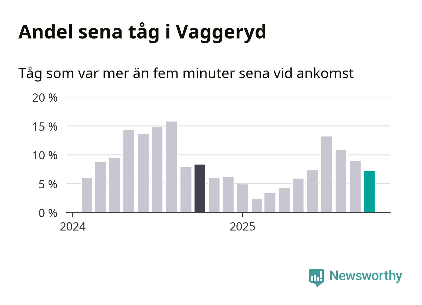 Sju procent kan jämföras med nio procent månaden innan, och åtta procent i oktober 2024. Oktober är den tredje månaden i rad med minskande förseningar i Vaggeryd. Siffrorna bygger på realtidsinformation om tågavgångar och ankomster från Trafikverket, som Newsworthy löpande samlar in.