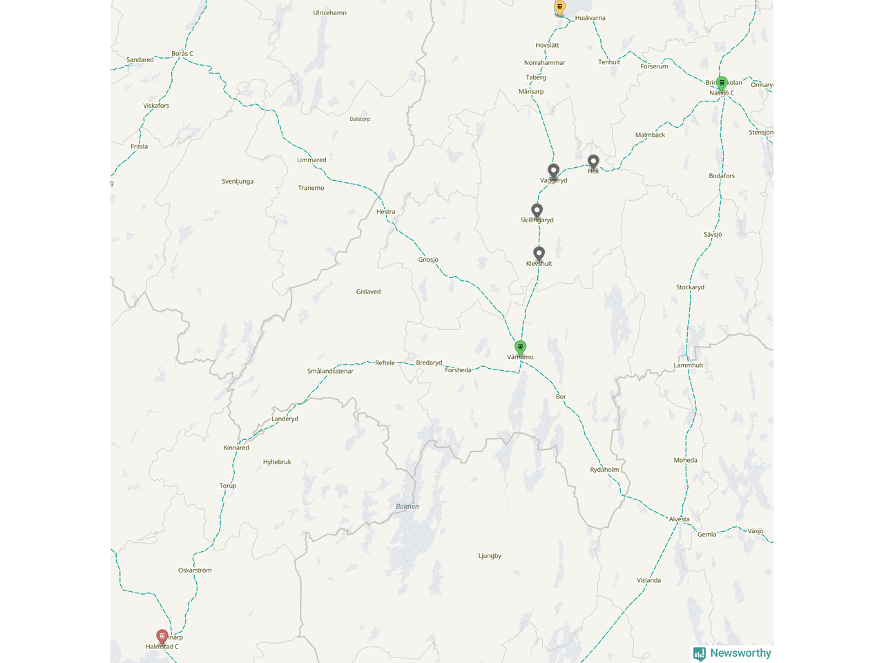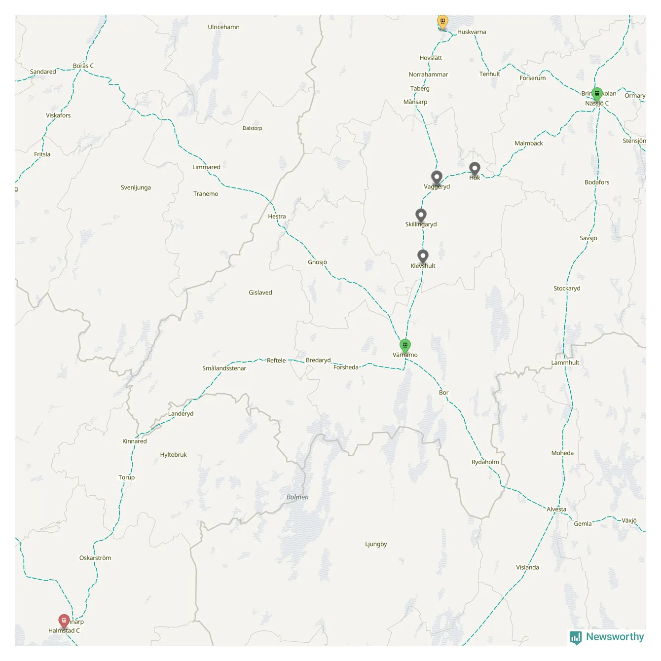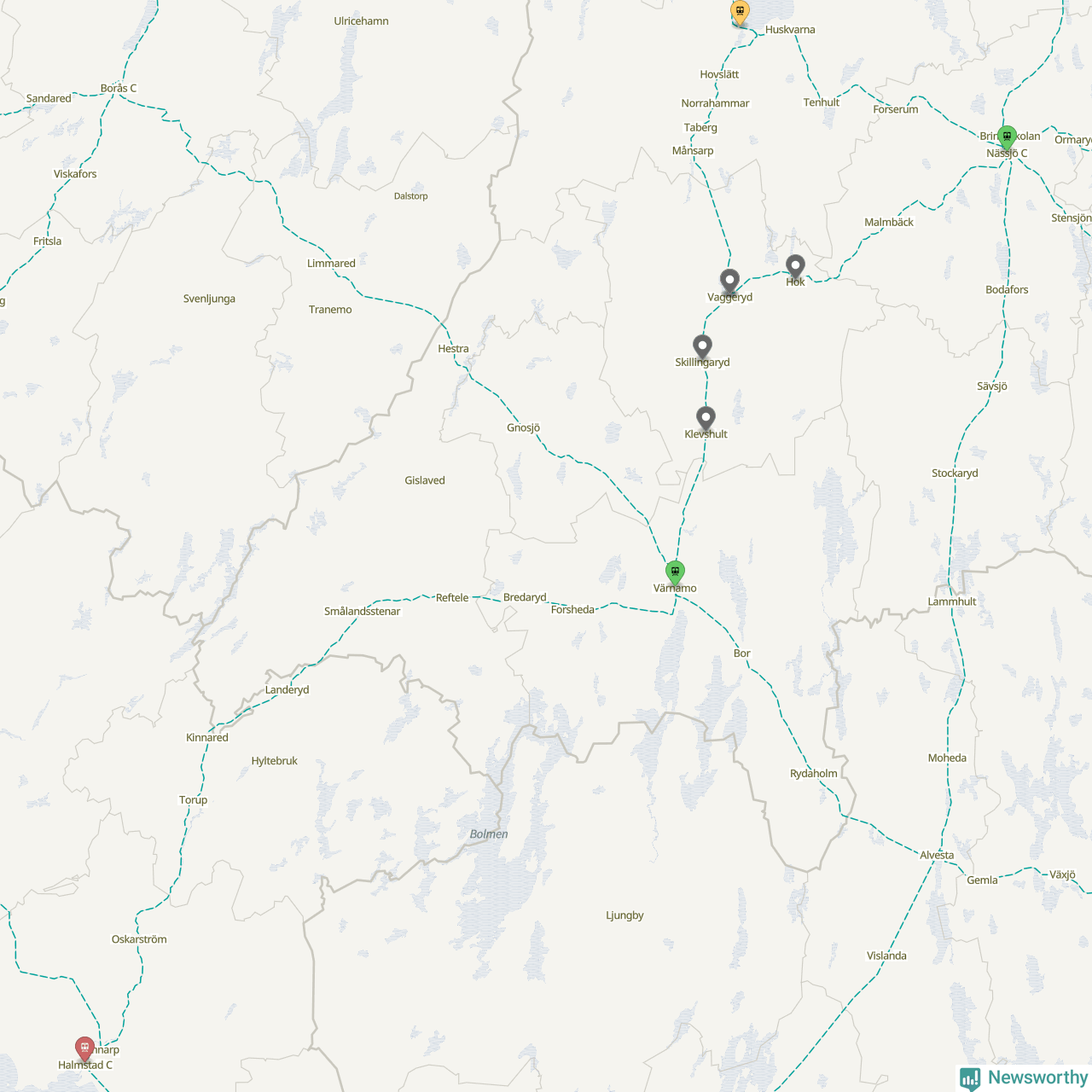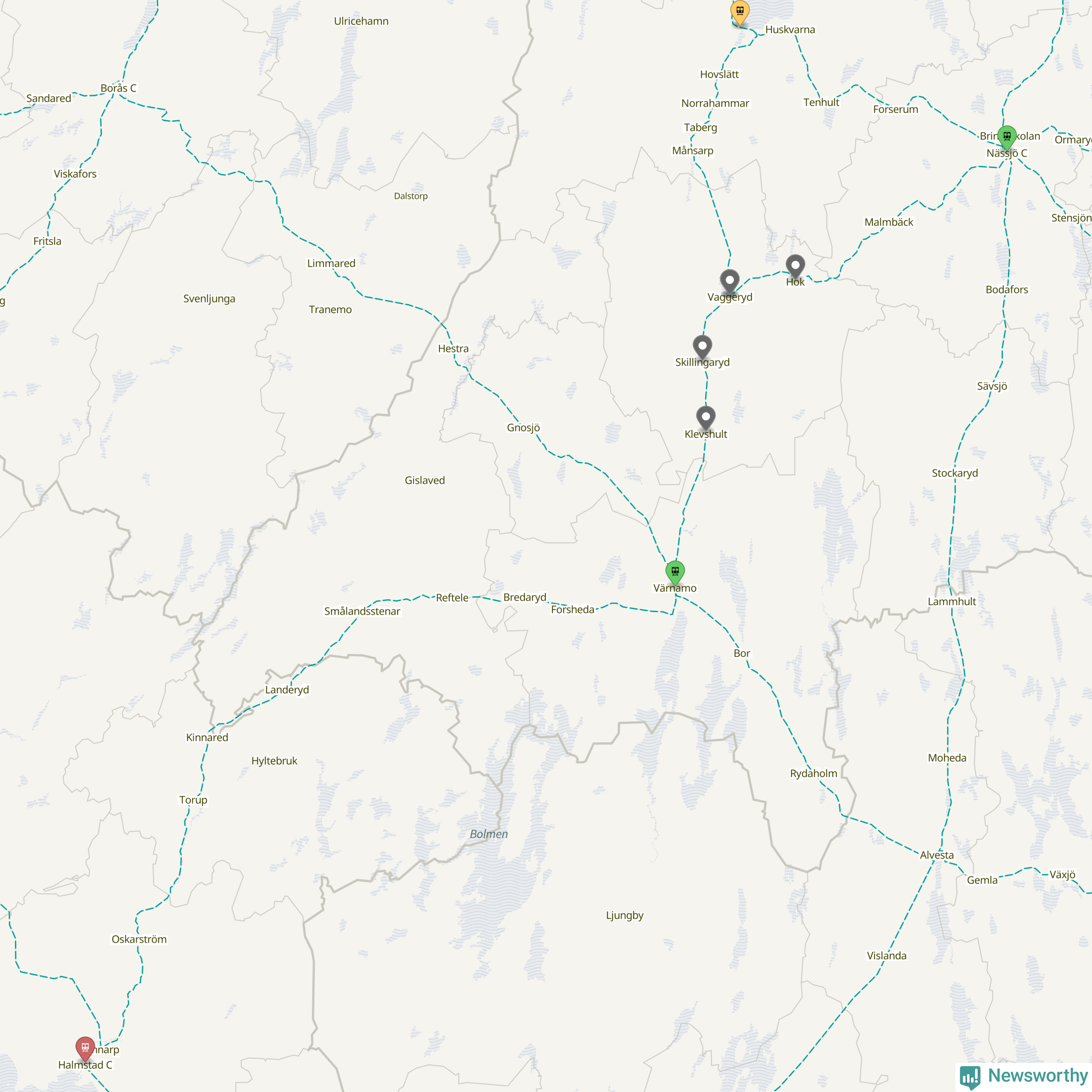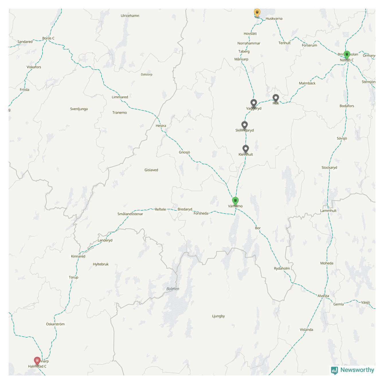 Kartdata från Mapbox, Newsworthy, OpenStreetMap och Trafikverket. Uppgifter om sträckor med passagerartrafik från jarnvag.net.