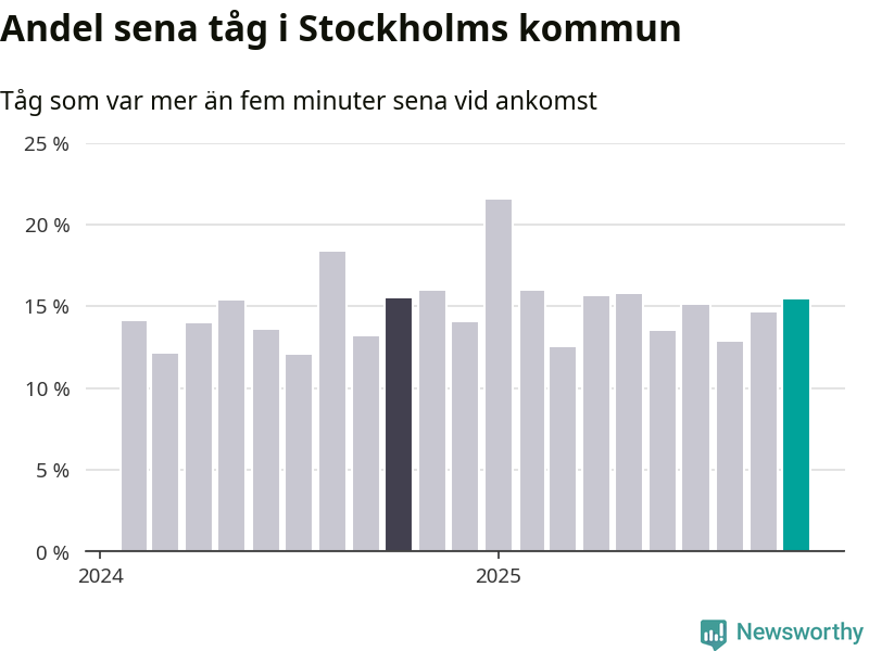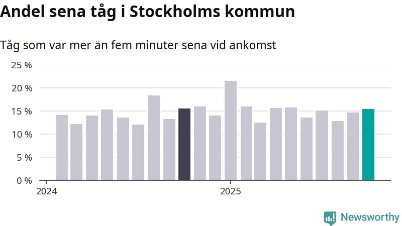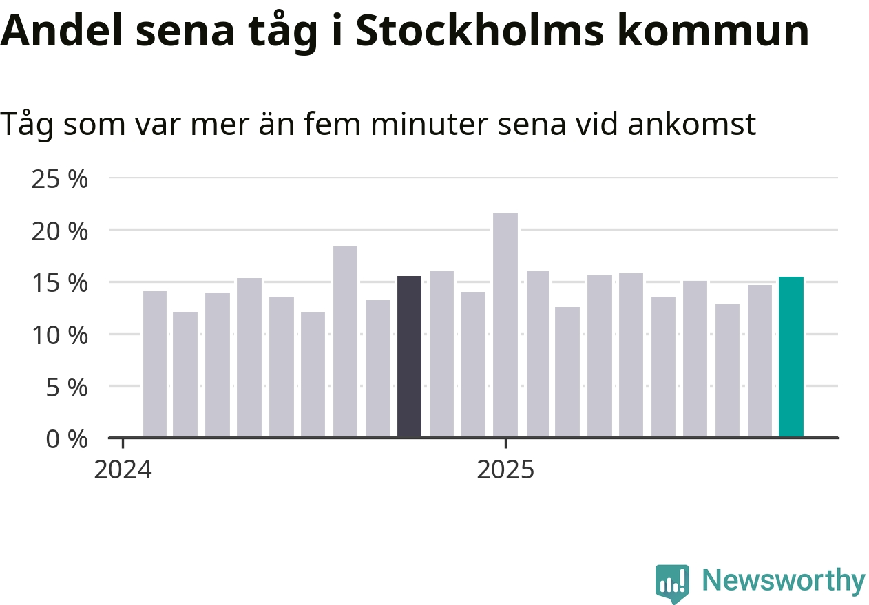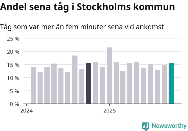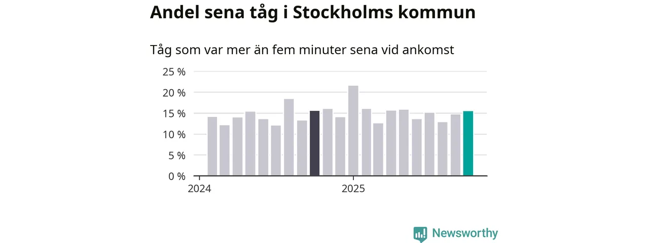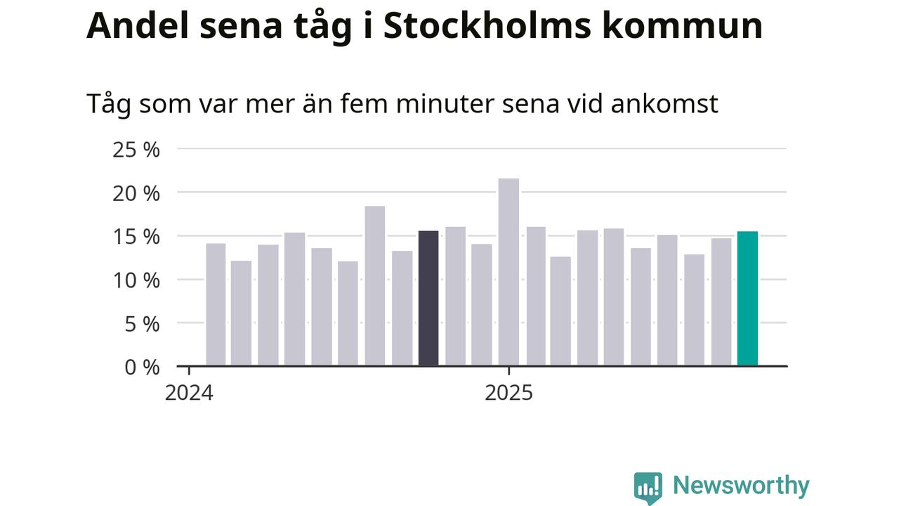 15 procent är marginellt mer än månaden innan, och kan jämföras med 15 procent i oktober 2024. Siffrorna bygger på realtidsinformation om tågavgångar och ankomster från Trafikverket, som Newsworthy löpande samlar in.