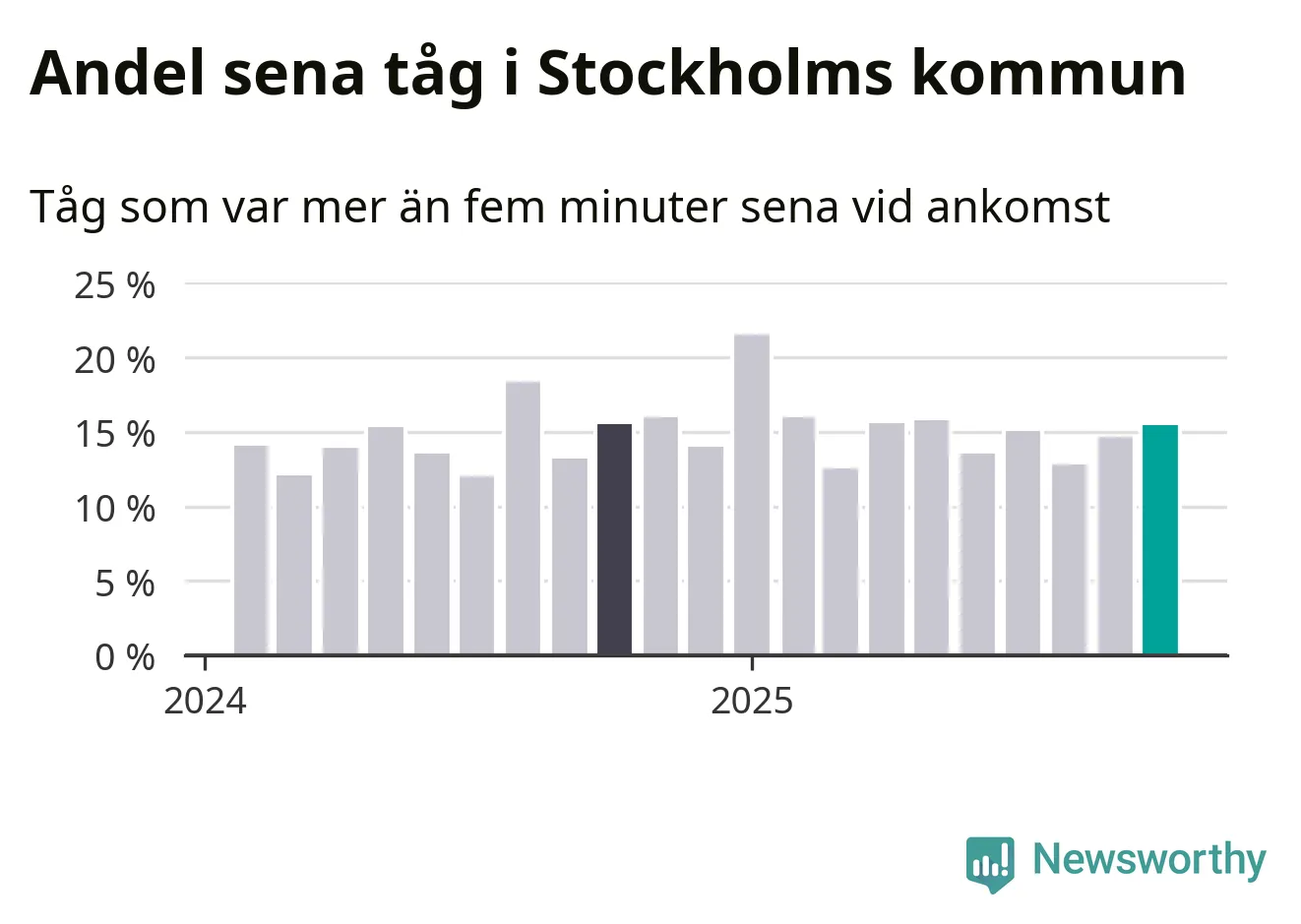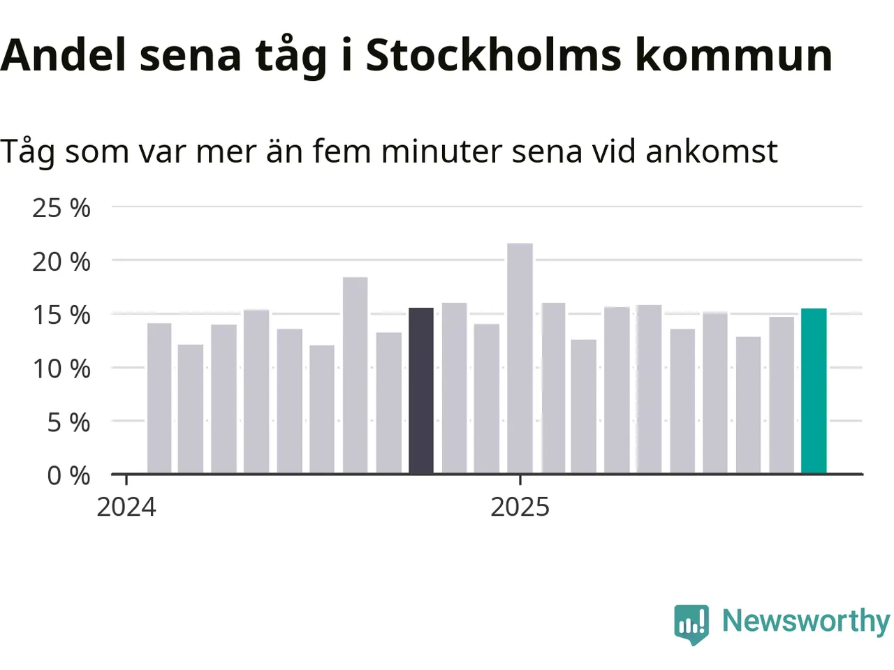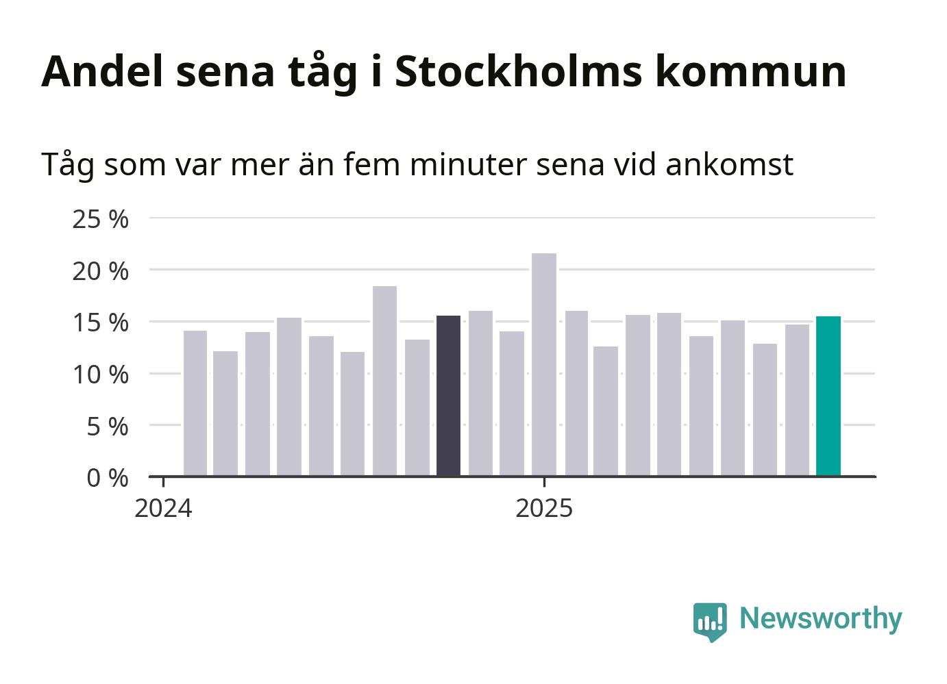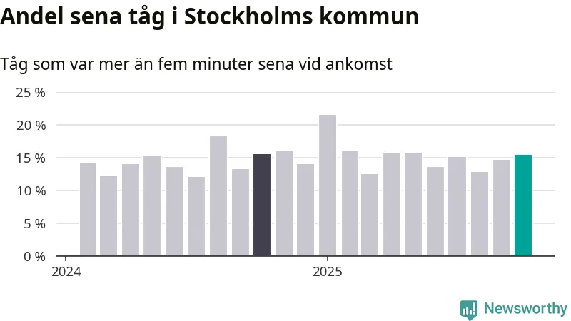 15 procent är marginellt mer än månaden innan, och kan jämföras med 15 procent i oktober 2024. Siffrorna bygger på realtidsinformation om tågavgångar och ankomster från Trafikverket, som Newsworthy löpande samlar in.