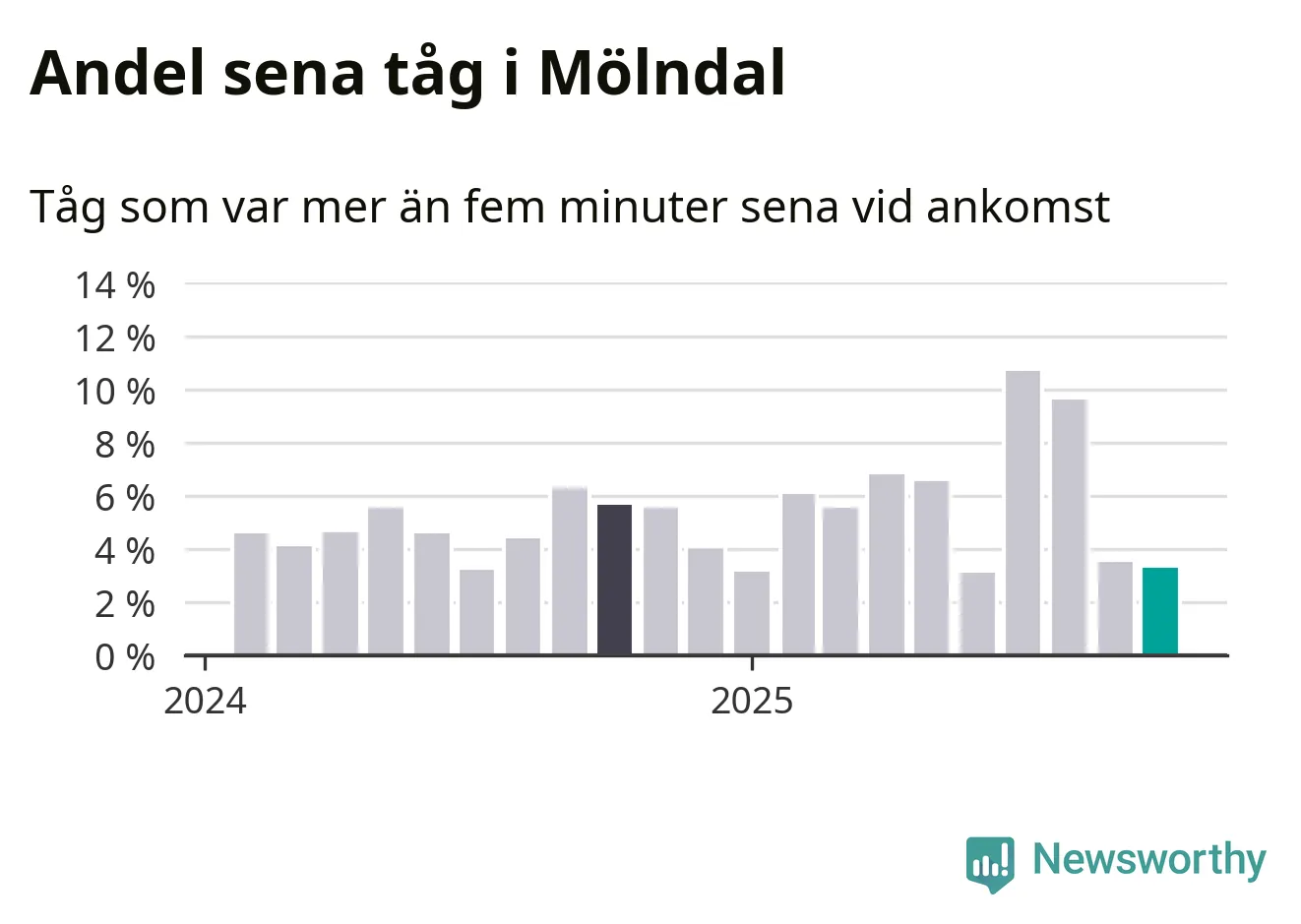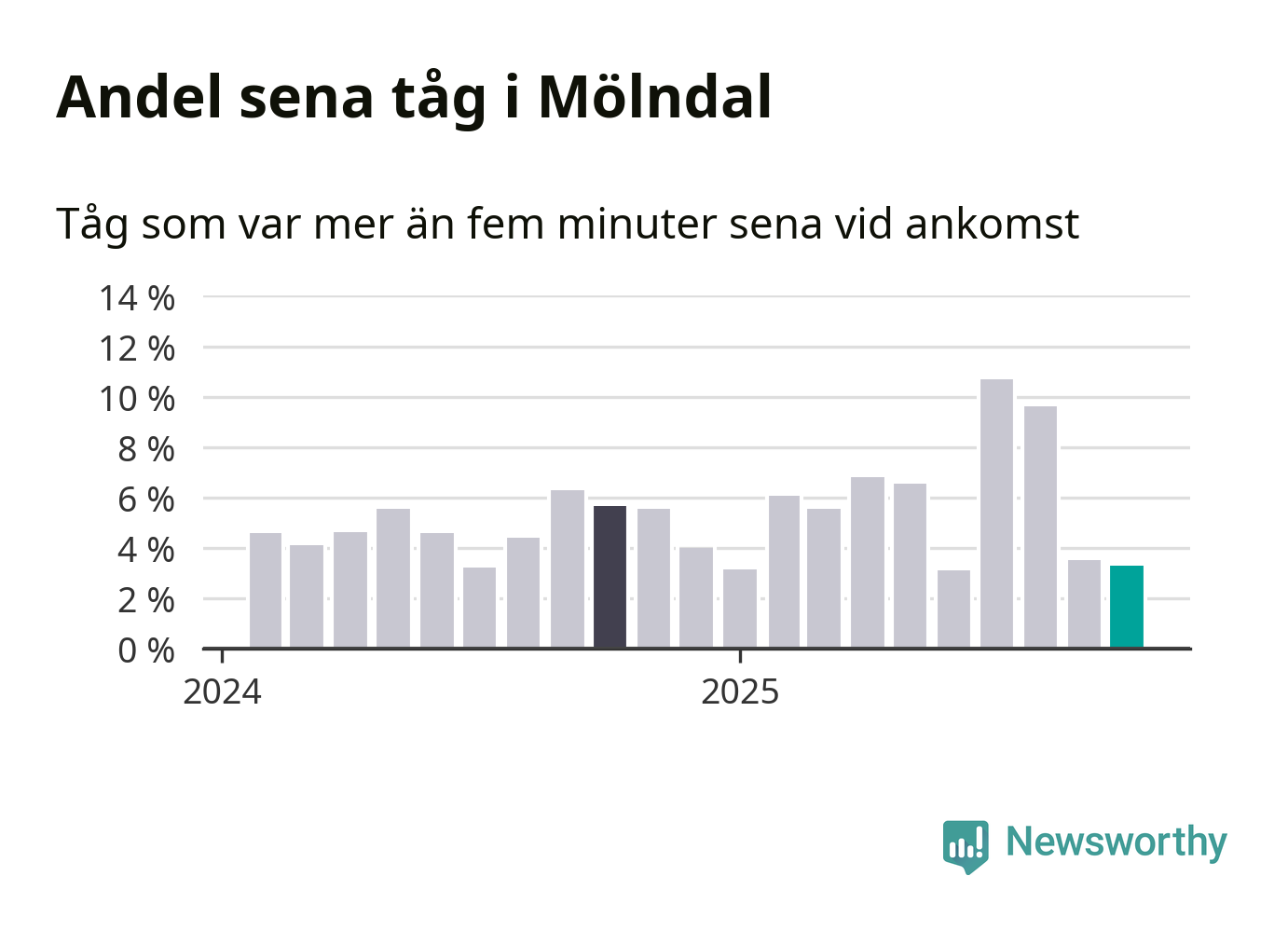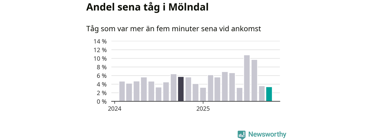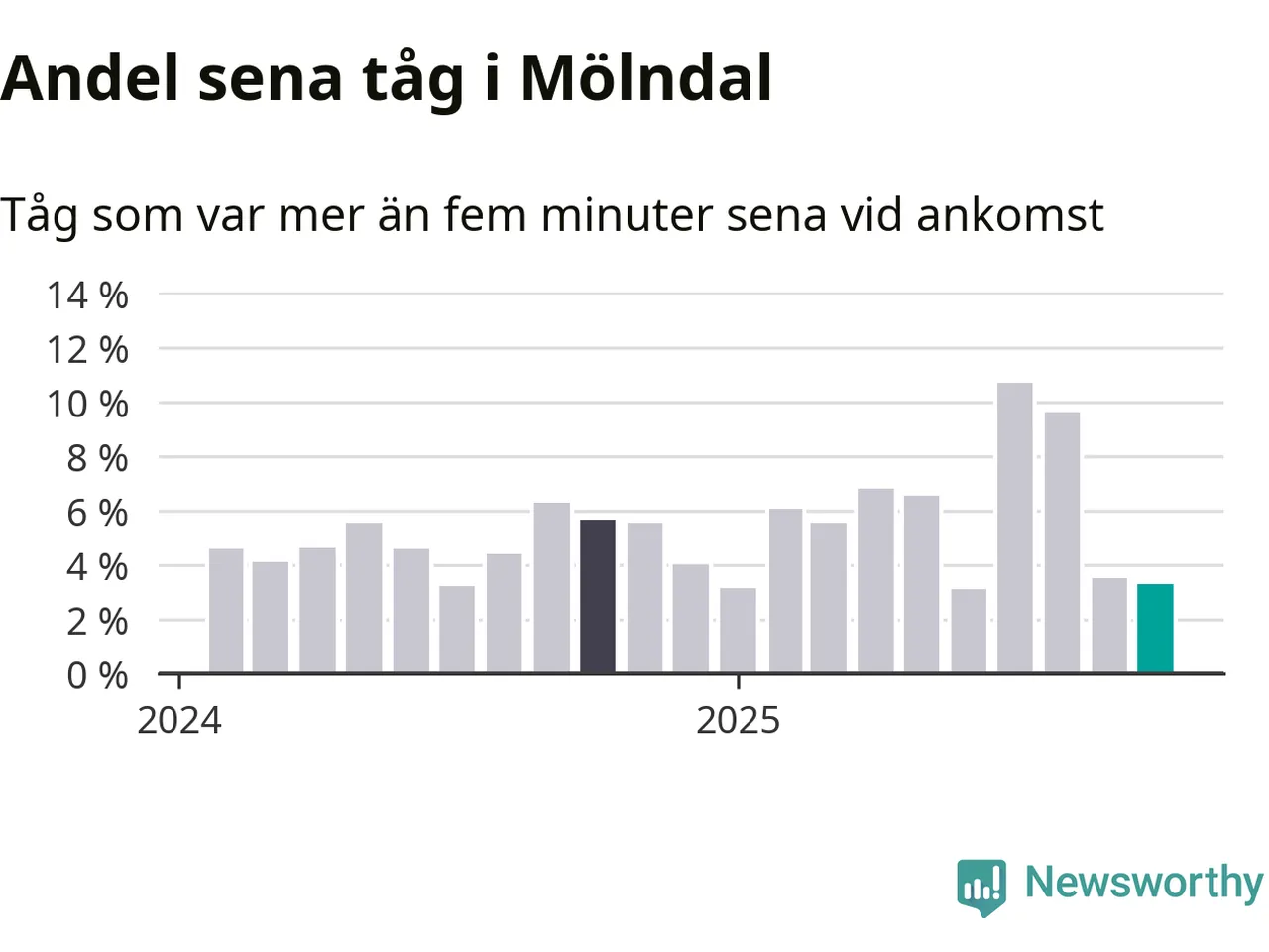 Tre procent kan jämföras med fyra procent månaden innan, och sex procent i oktober 2024. Oktober är den tredje månaden i rad med minskande förseningar i Mölndal. Siffrorna bygger på realtidsinformation om tågavgångar och ankomster från Trafikverket, som Newsworthy löpande samlar in.