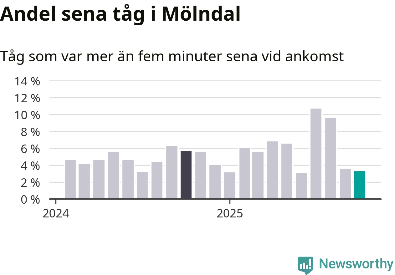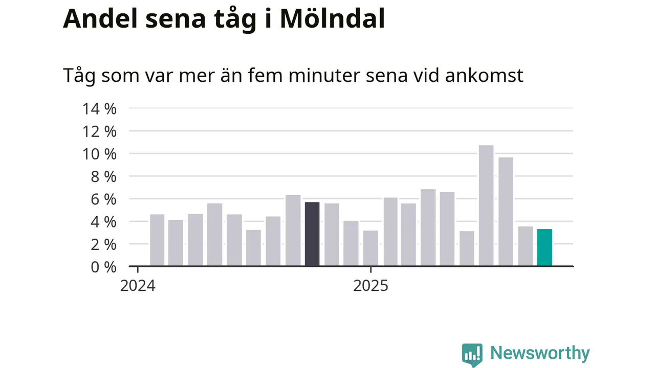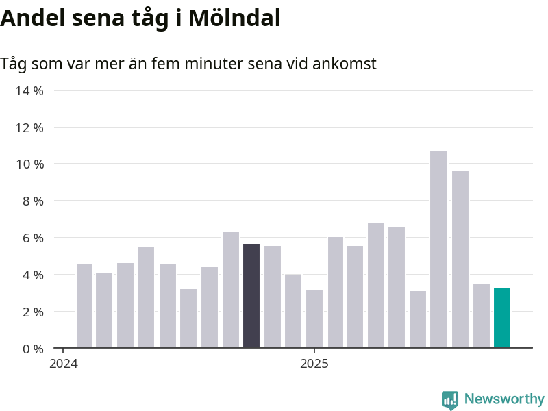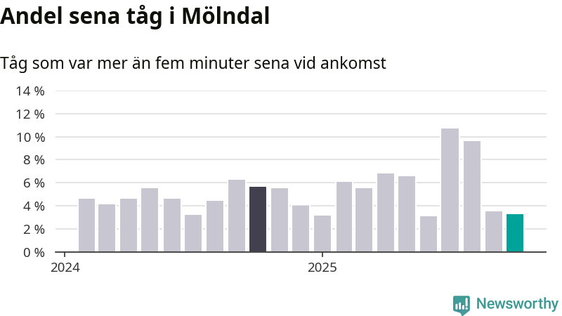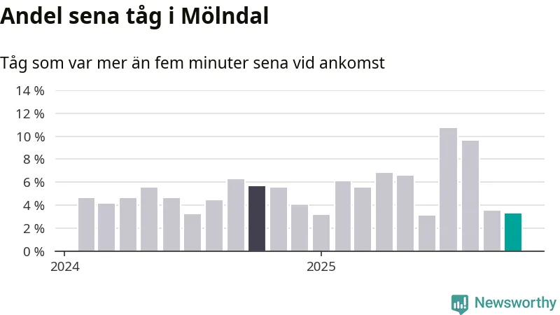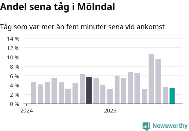Tre procent kan jämföras med fyra procent månaden innan, och sex procent i oktober 2024. Oktober är den tredje månaden i rad med minskande förseningar i Mölndal. Siffrorna bygger på realtidsinformation om tågavgångar och ankomster från Trafikverket, som Newsworthy löpande samlar in.