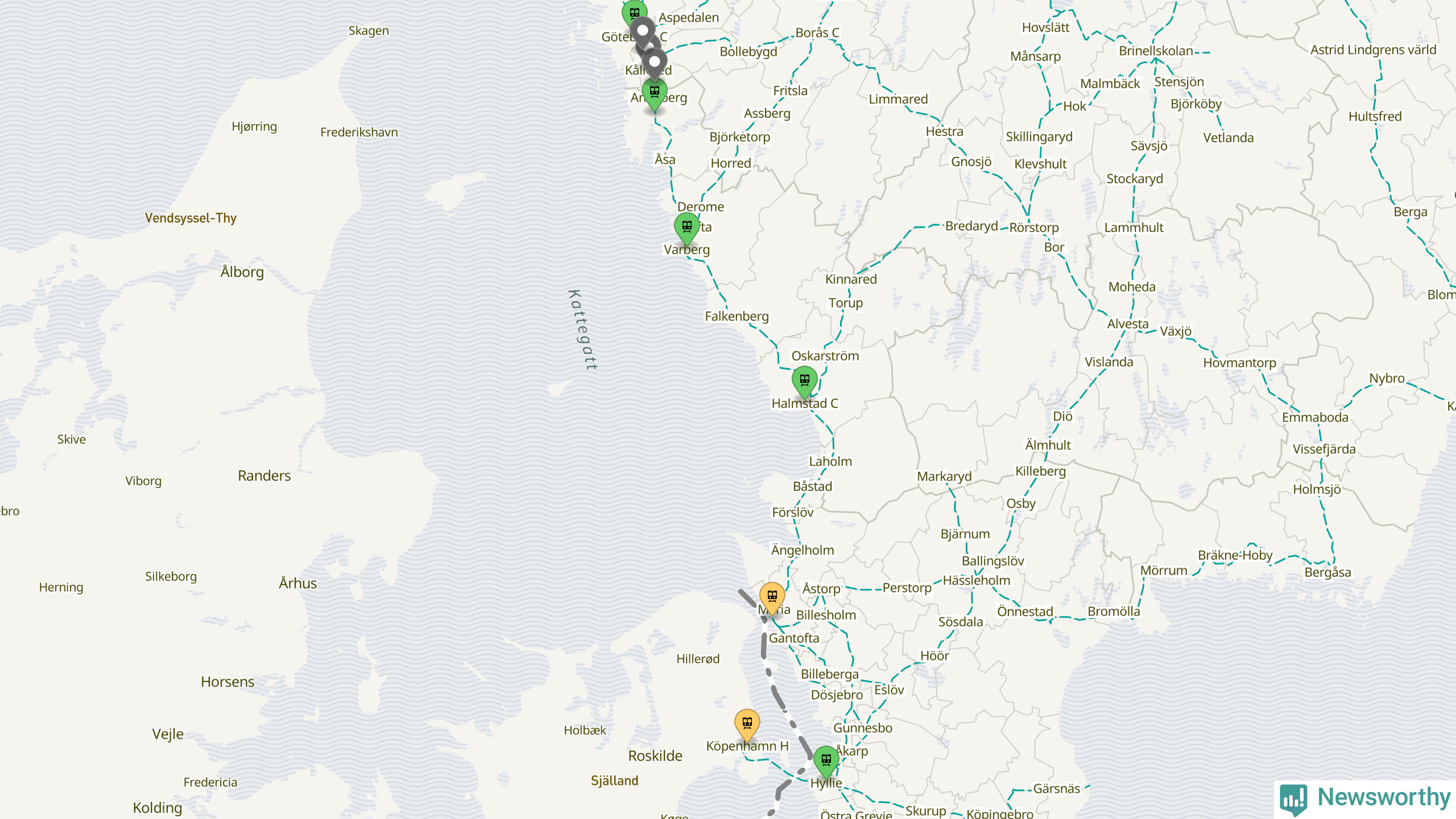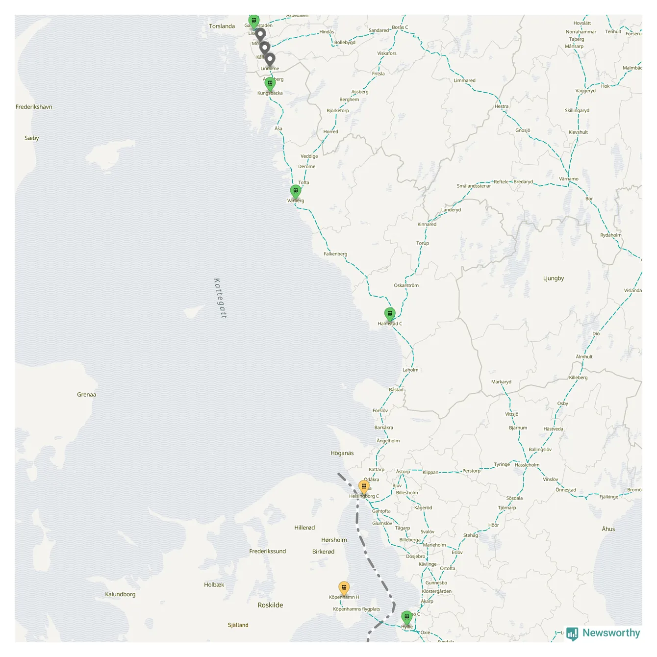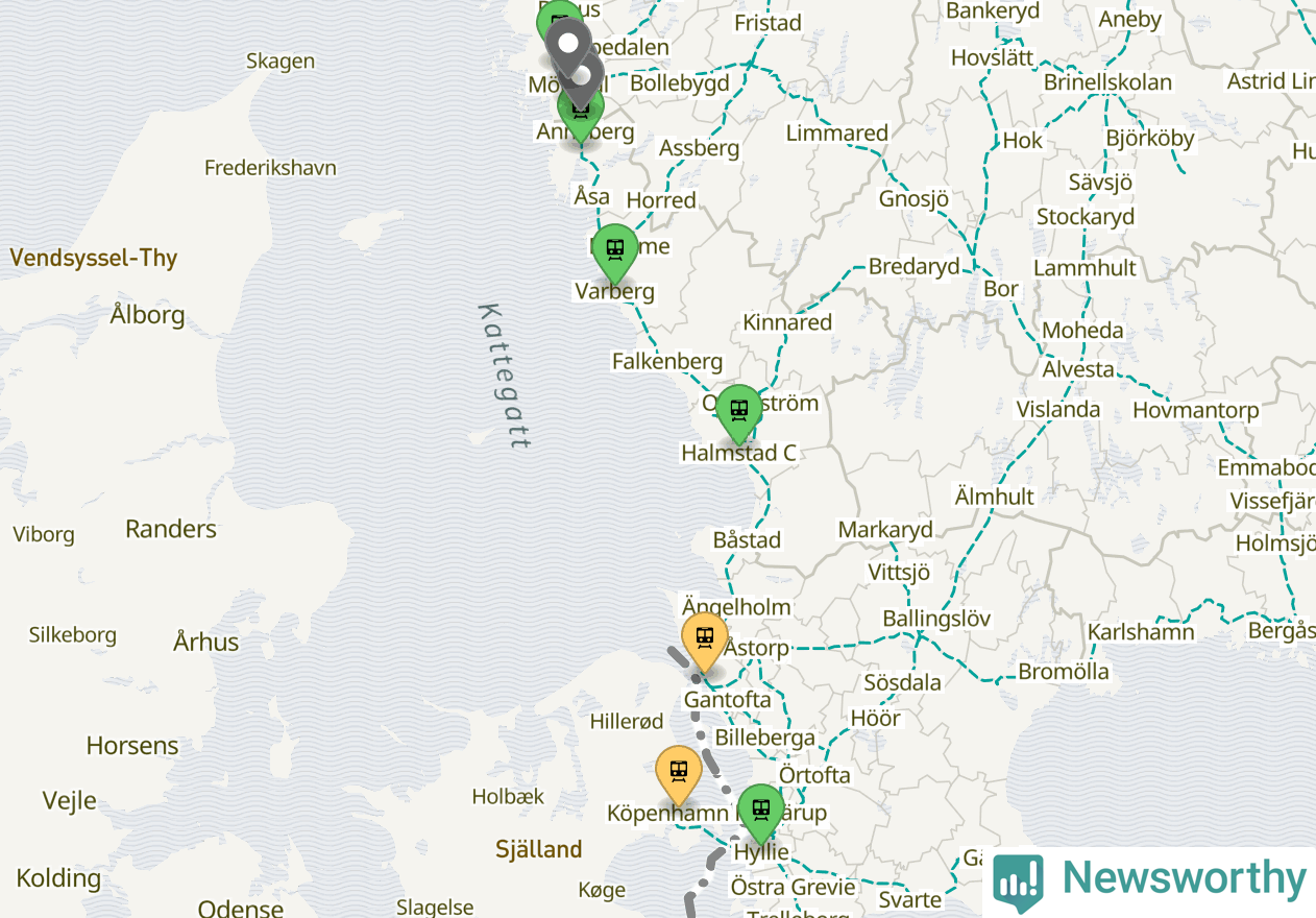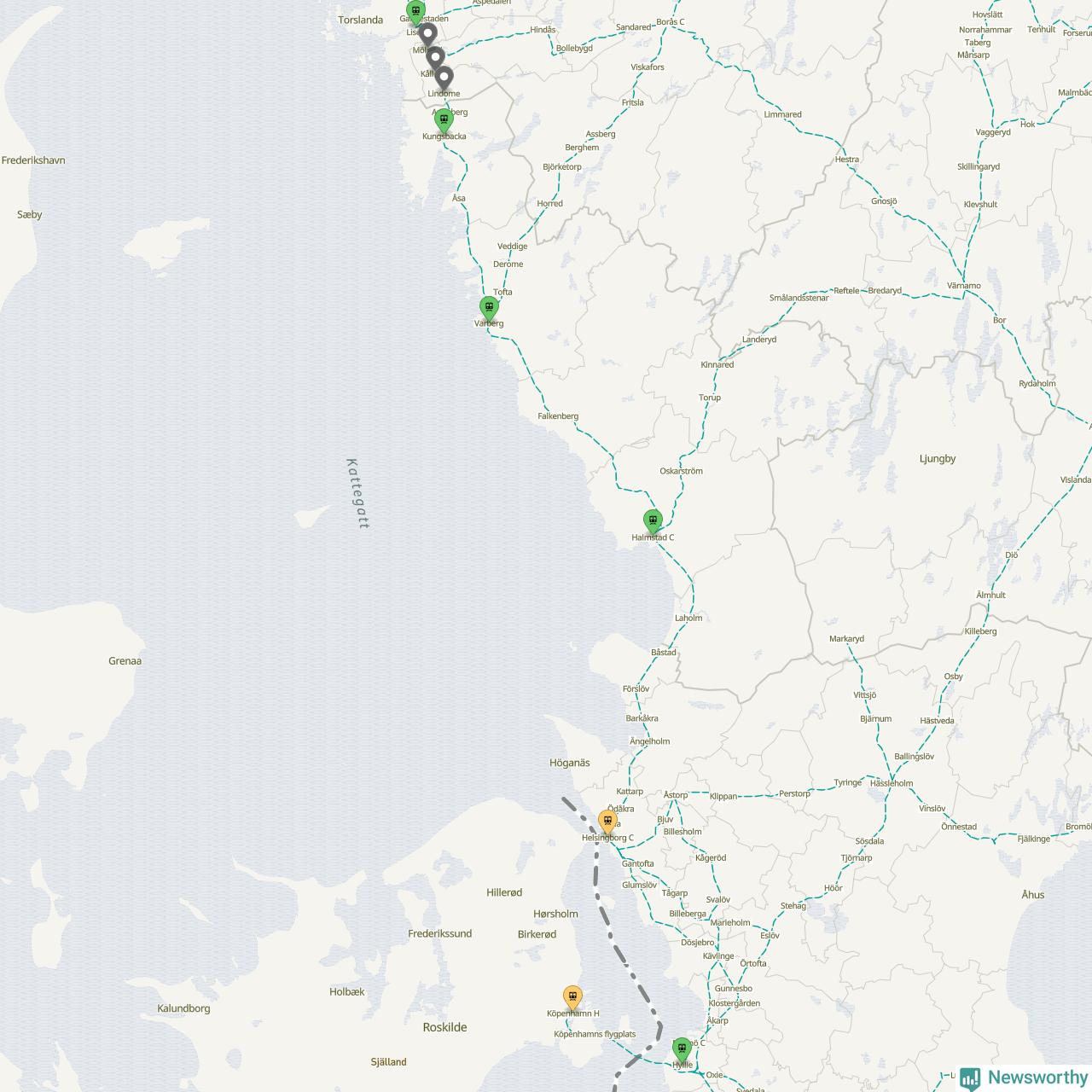 Kartdata från Mapbox, Newsworthy, OpenStreetMap och Trafikverket. Uppgifter om sträckor med passagerartrafik från jarnvag.net.
