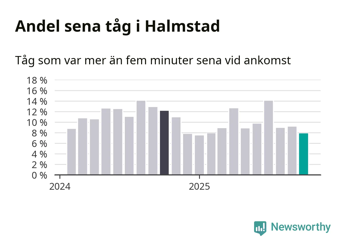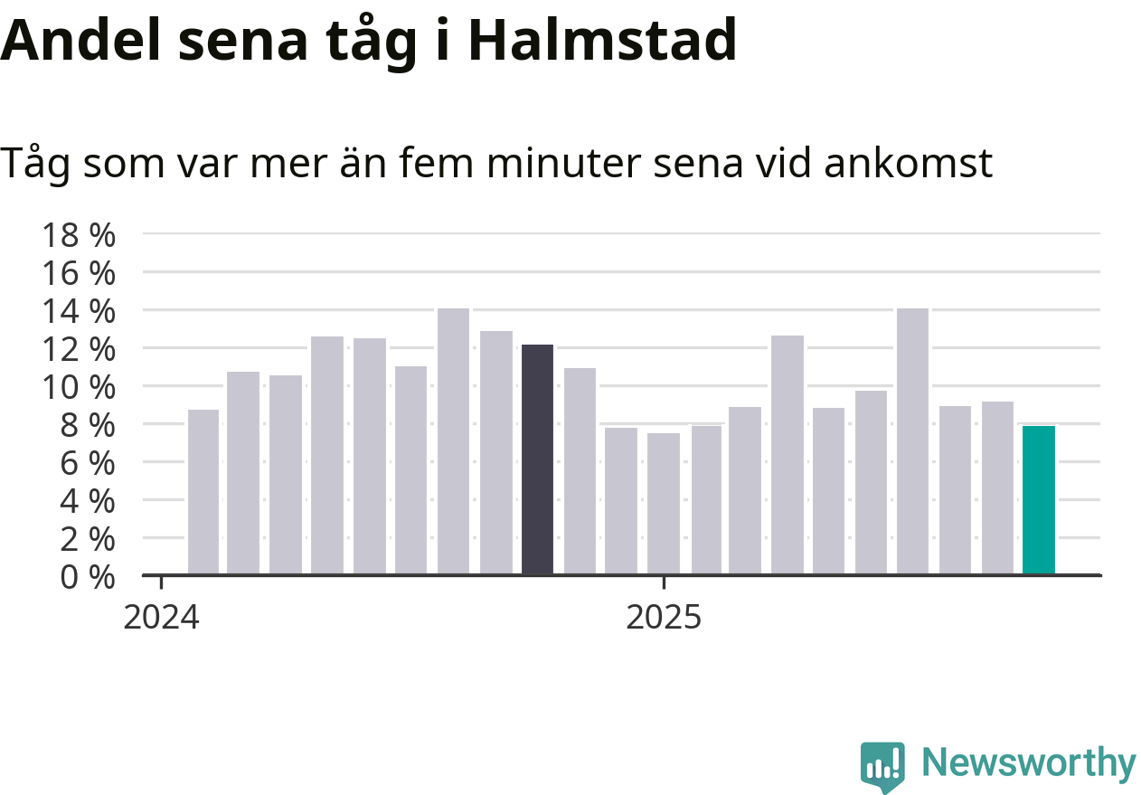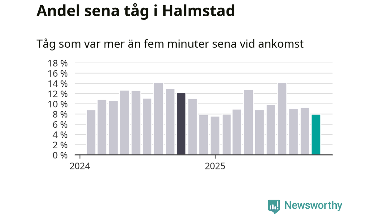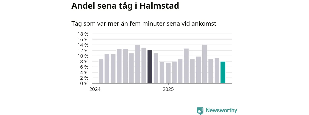 Åtta procent kan jämföras med nio procent månaden innan, och tolv procent i oktober 2024. Siffrorna bygger på realtidsinformation om tågavgångar och ankomster från Trafikverket, som Newsworthy löpande samlar in.