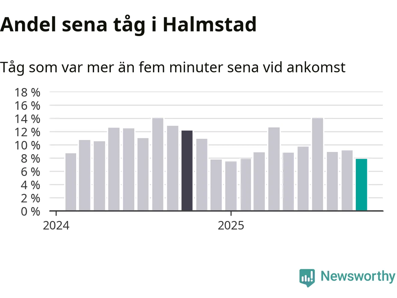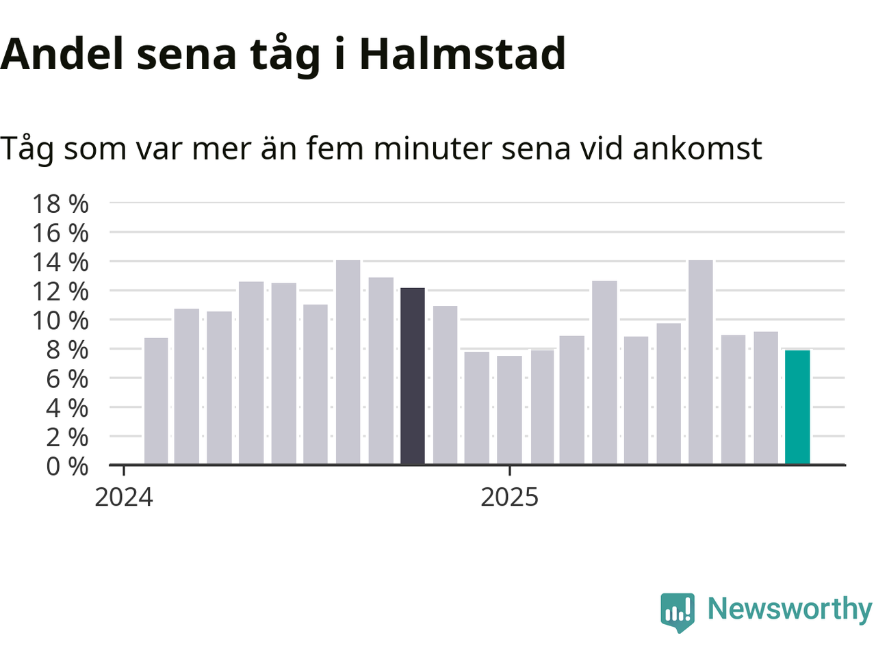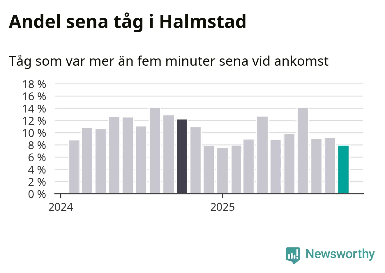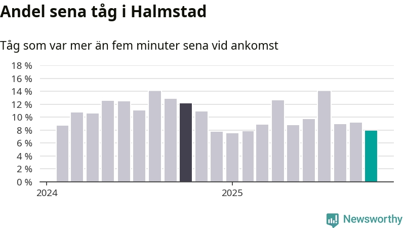 Åtta procent kan jämföras med nio procent månaden innan, och tolv procent i oktober 2024. Siffrorna bygger på realtidsinformation om tågavgångar och ankomster från Trafikverket, som Newsworthy löpande samlar in.