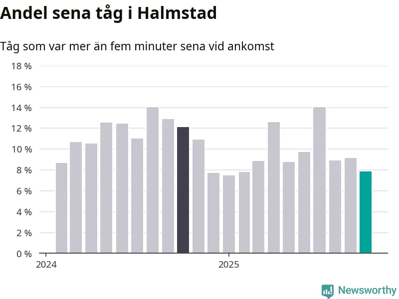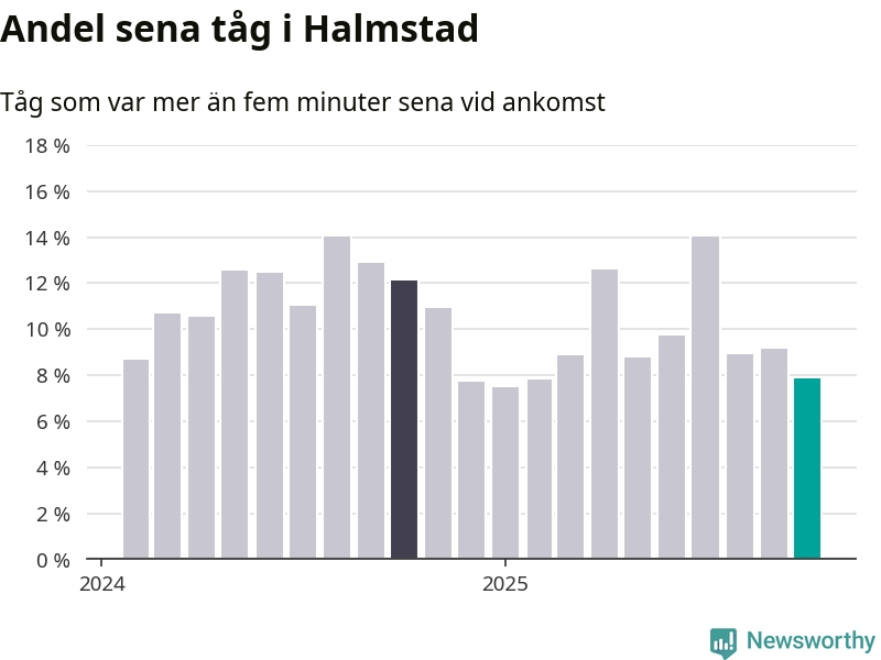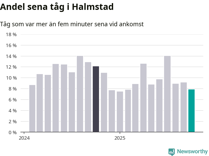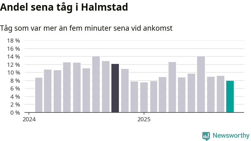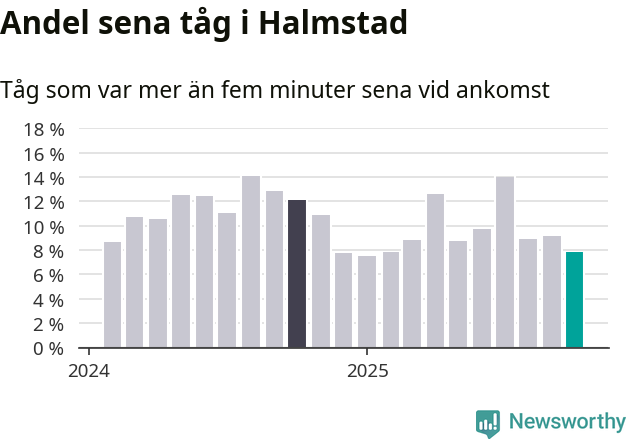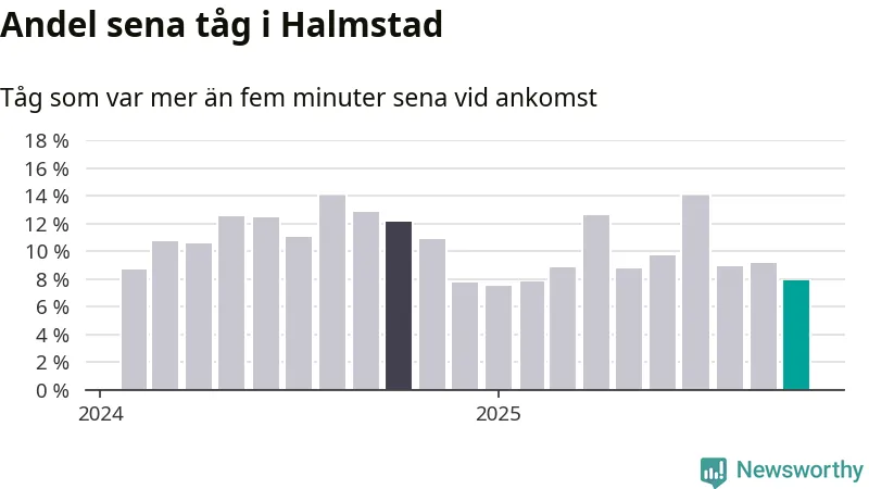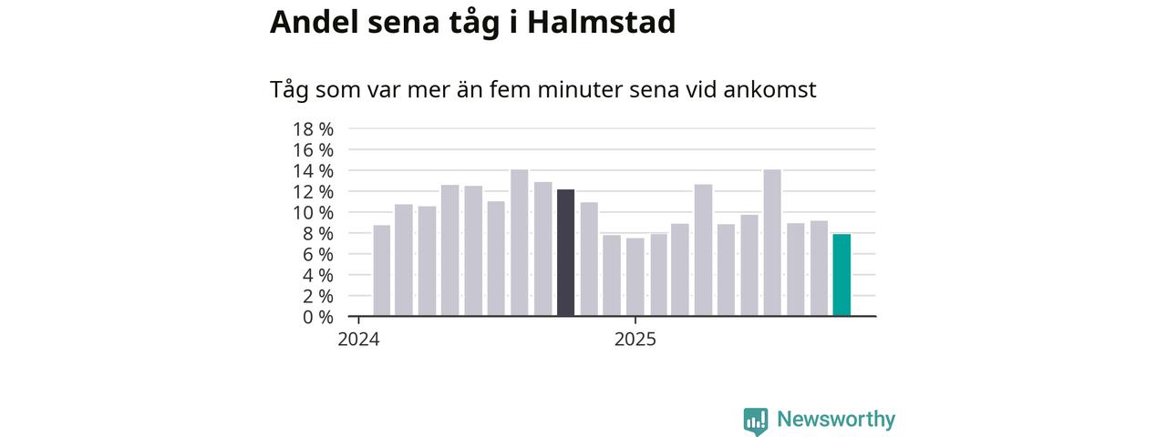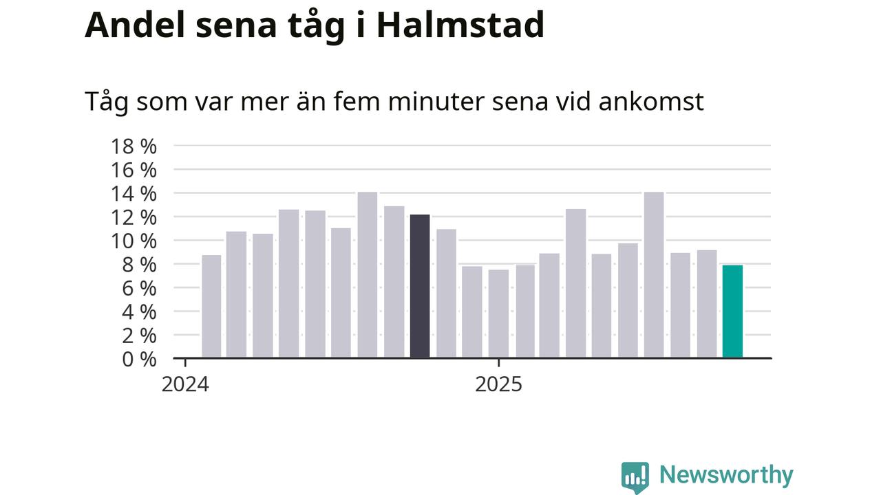 Av knappt 2 300 tåg som passerade Halmstad C eller Sannarp i oktober var 177 mer än fem minuter sena. Det motsvarar 8 procent, en bit över den nationella målsättningen som säger att inte mer än fem procent av tågen ska vara sena.