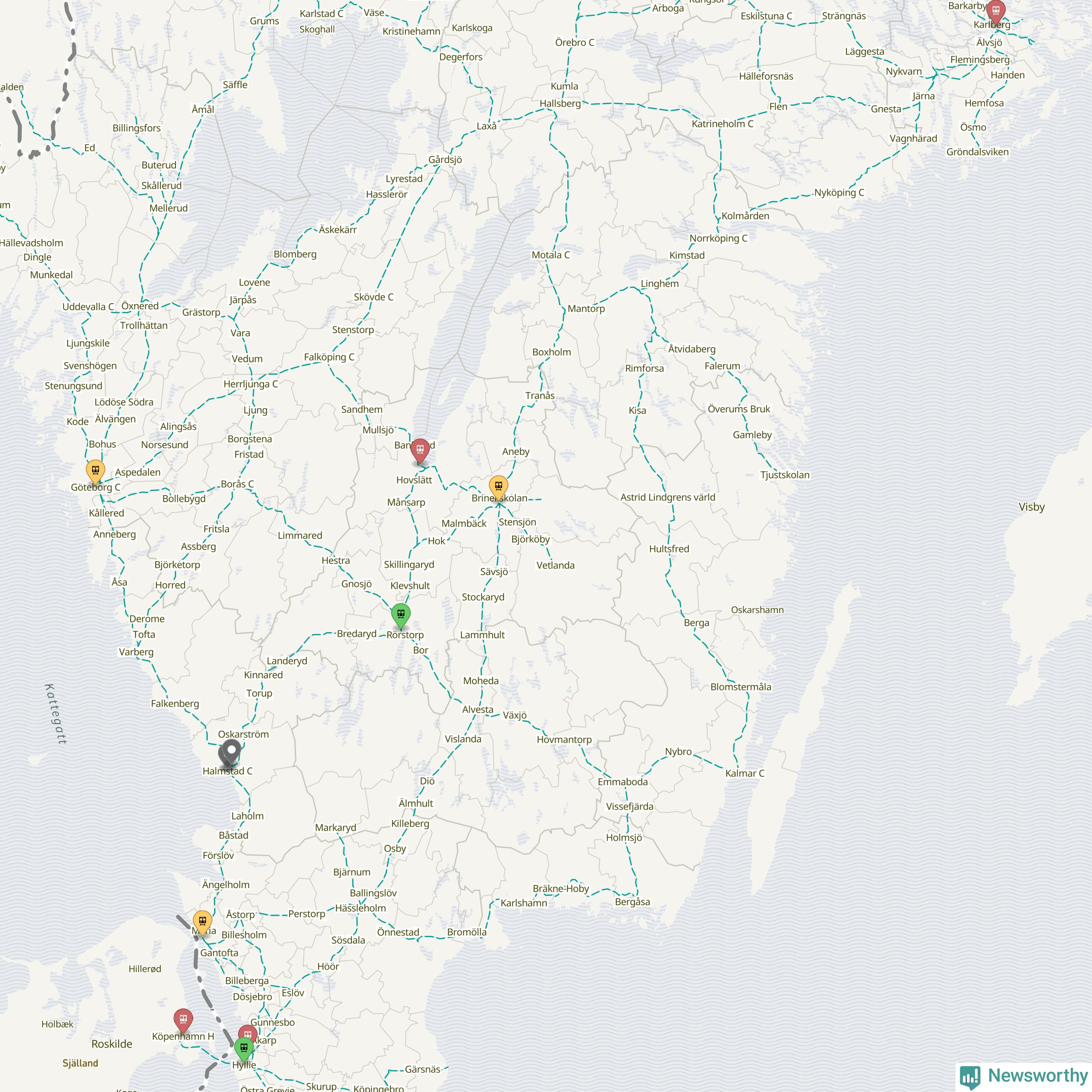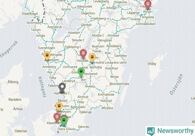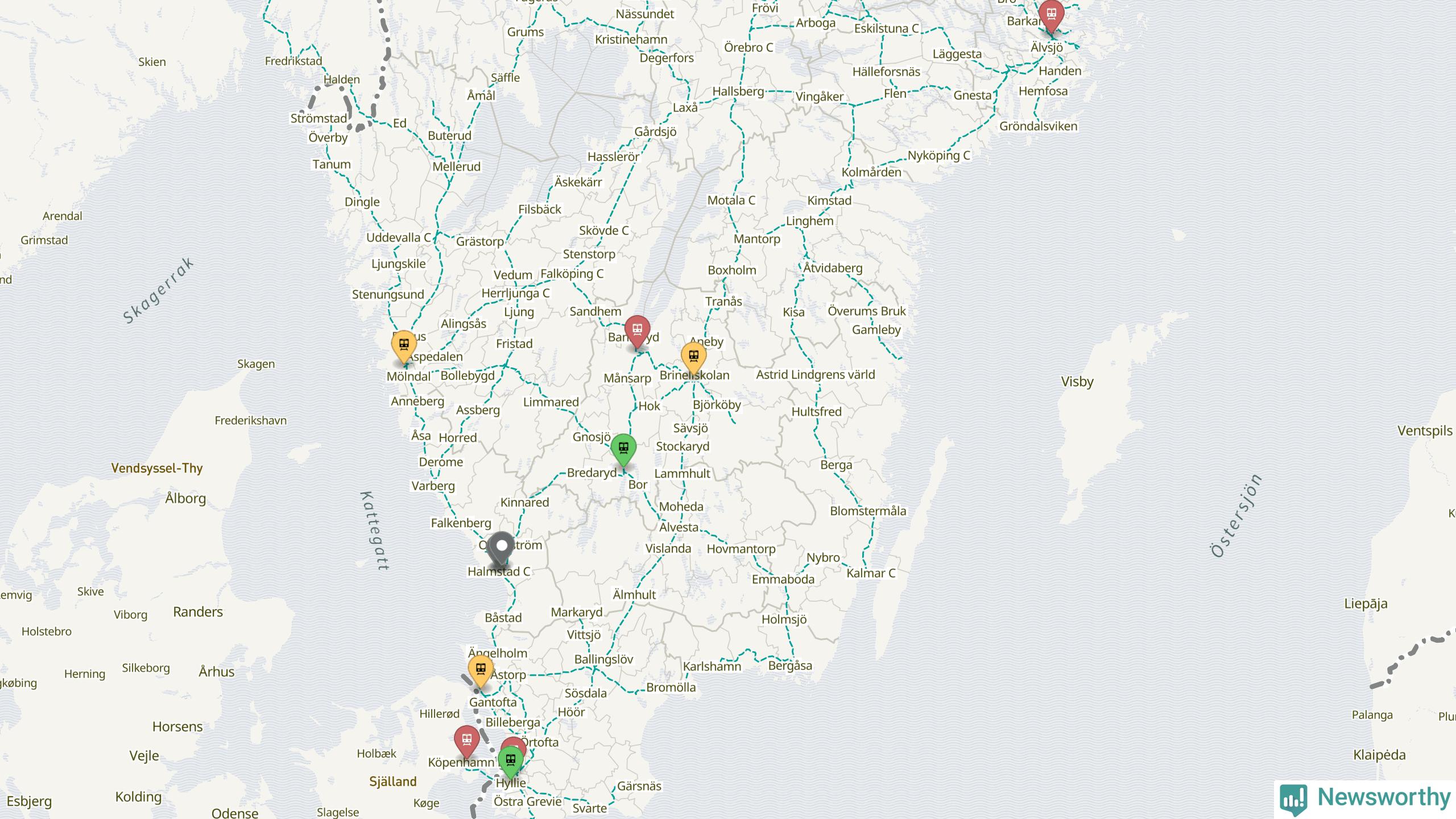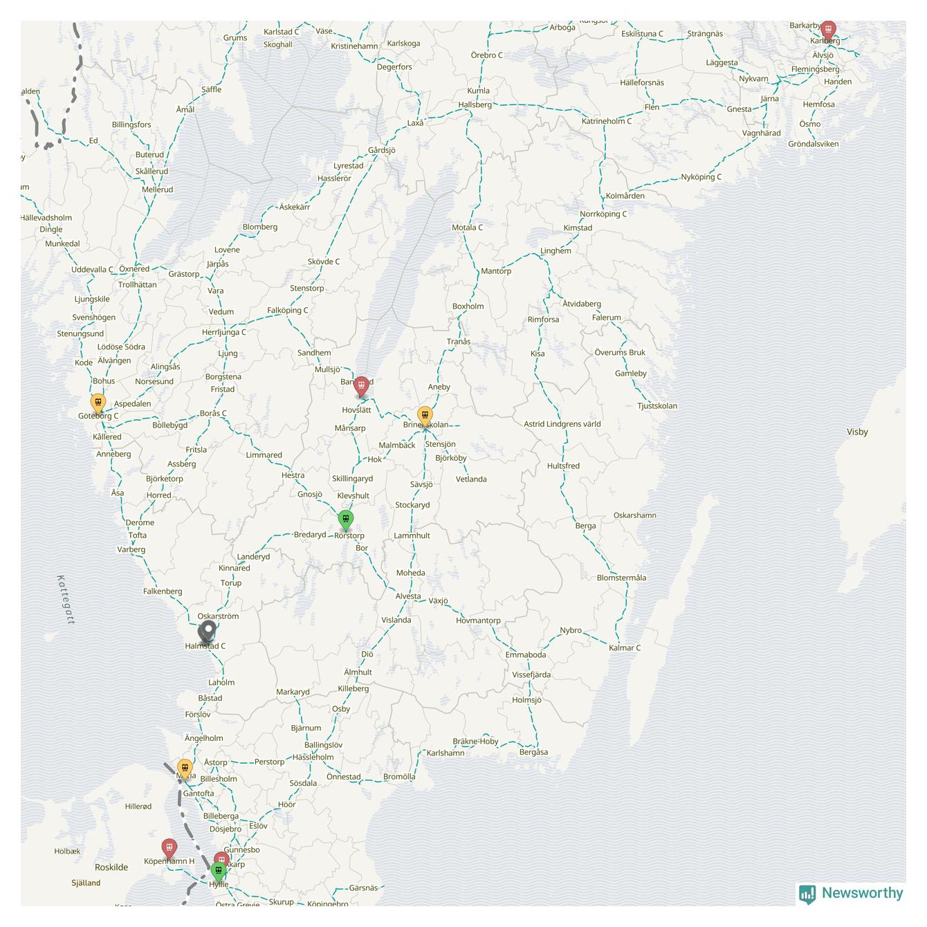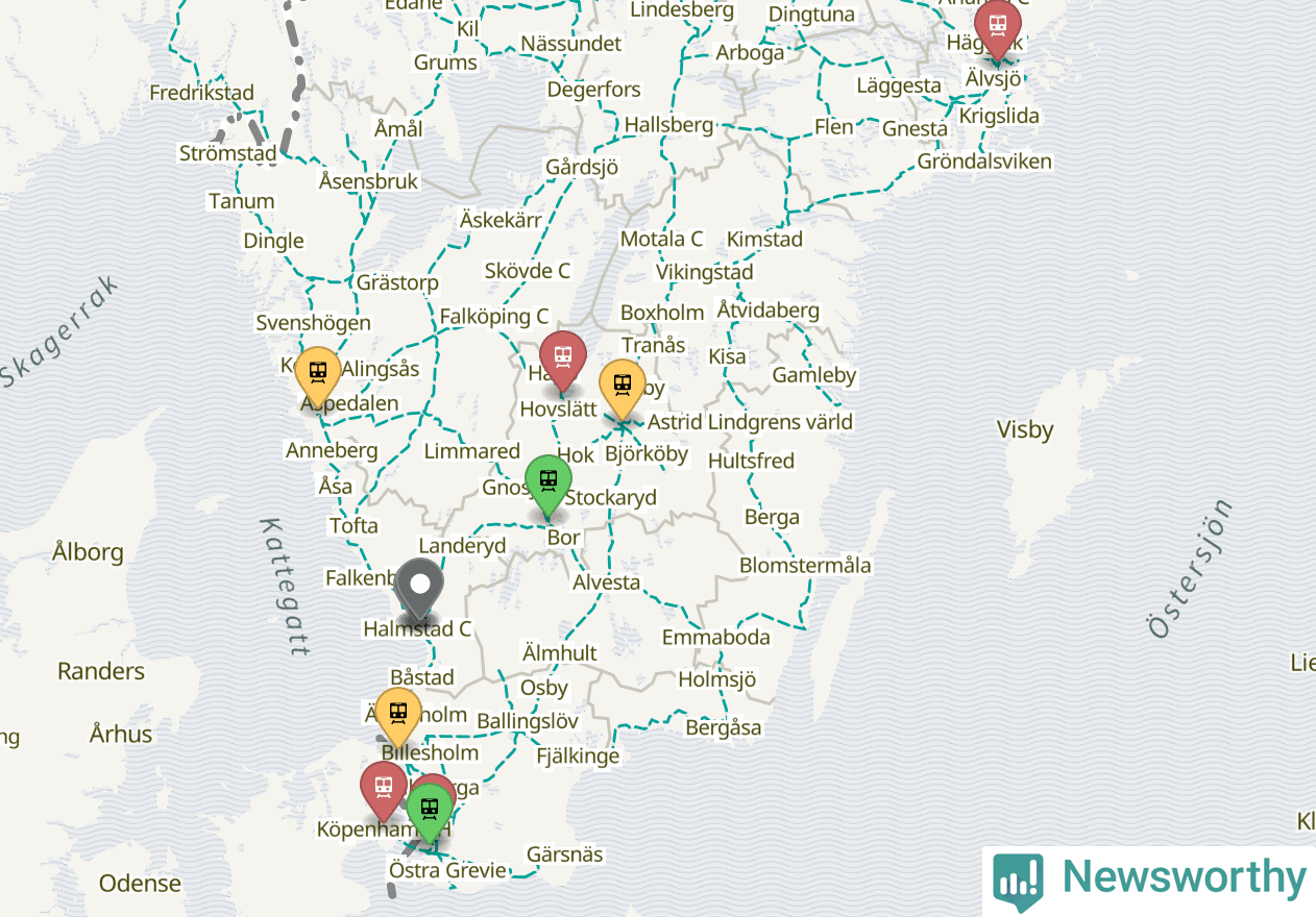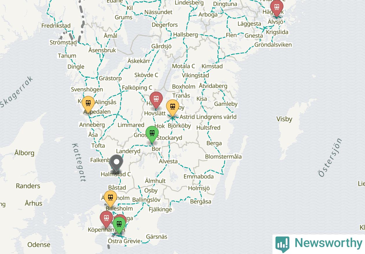 Kartdata från Mapbox, Newsworthy, OpenStreetMap och Trafikverket. Uppgifter om sträckor med passagerartrafik från jarnvag.net.